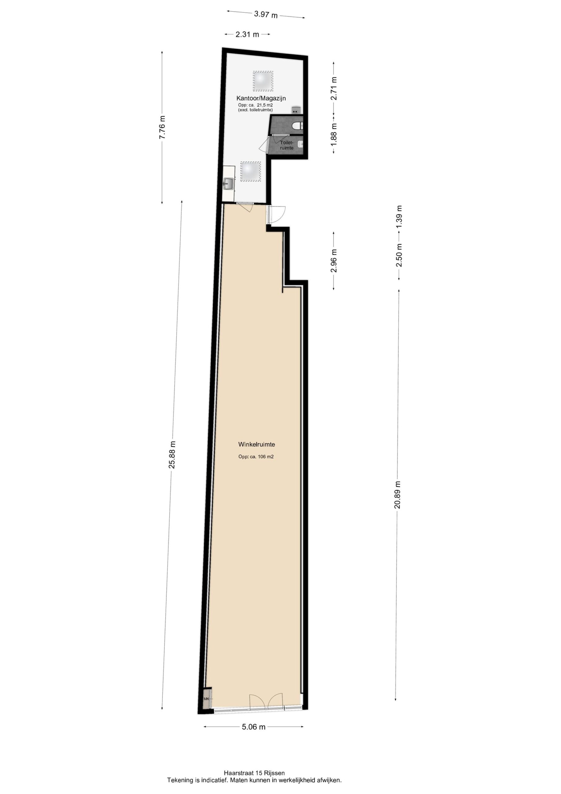 Winkelruimte met circa. 106 m2 winkeloppervlakte en 21 m2 kantoor / opslagruimte.