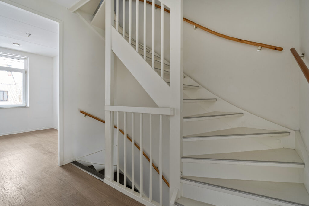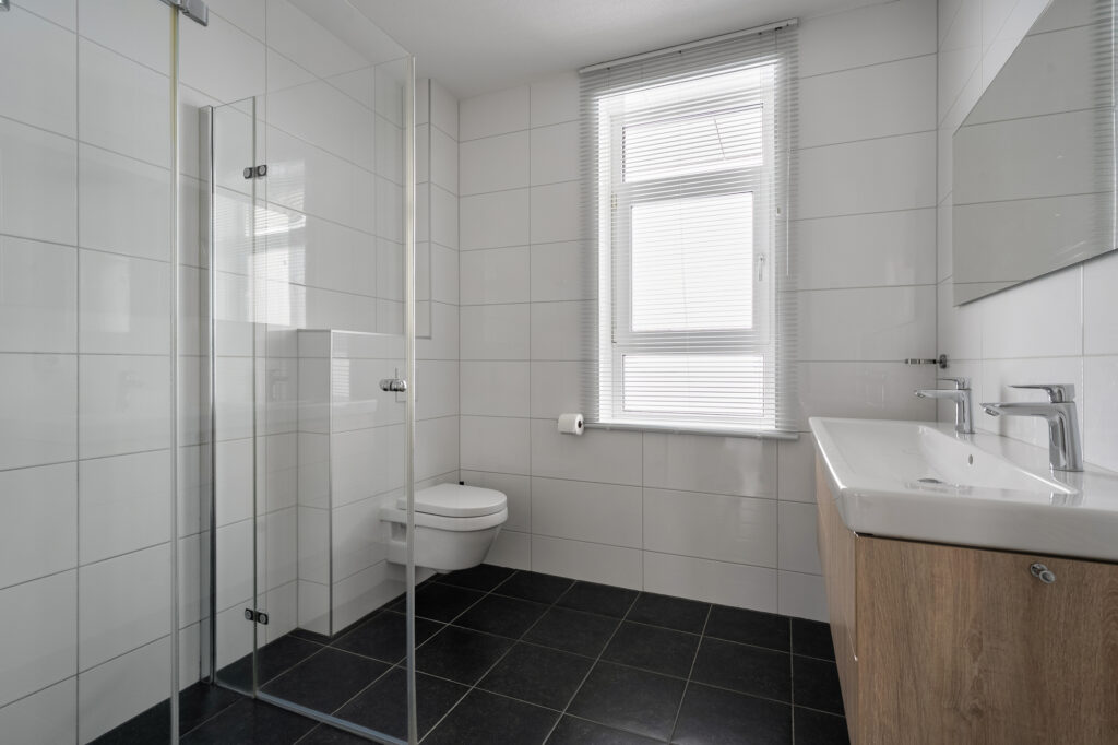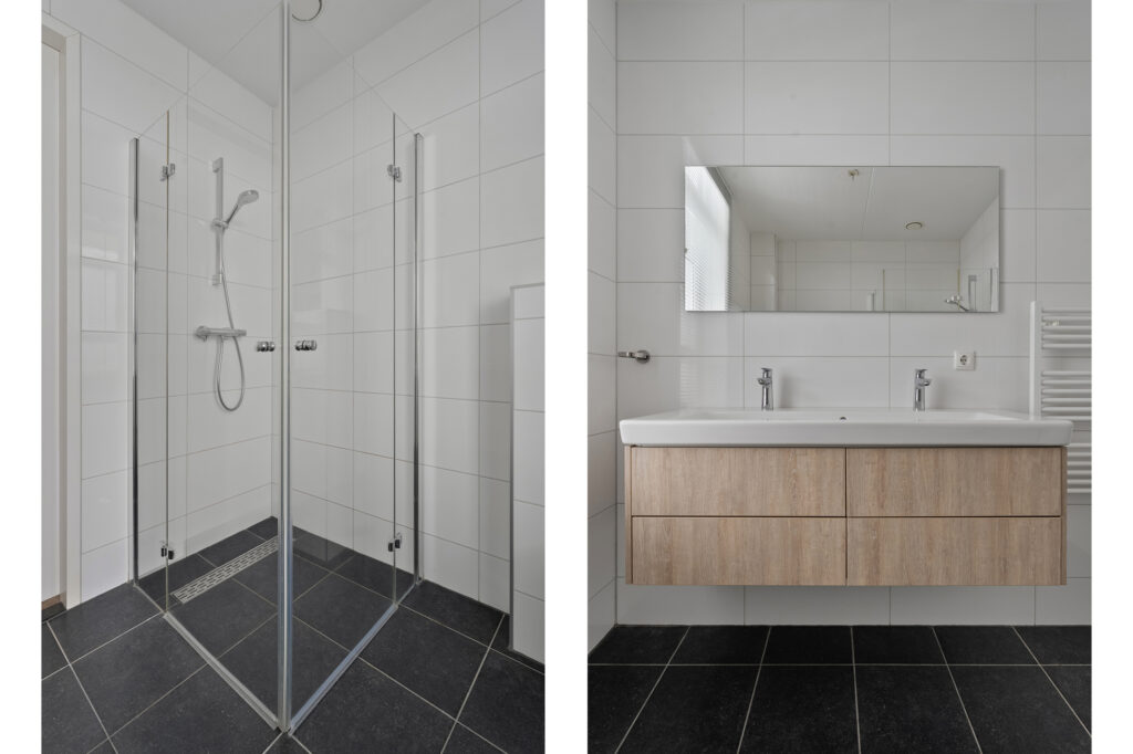 Op de eerste verdieping vind je drie slaapkamers. Via de overloop bereik je de badkamer en de trap naar de tweede verdieping. De badkamer is modern afgewerkt met een dubbele wastafel, inloopdouche en een toilet.