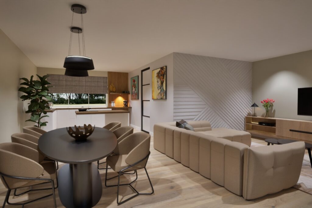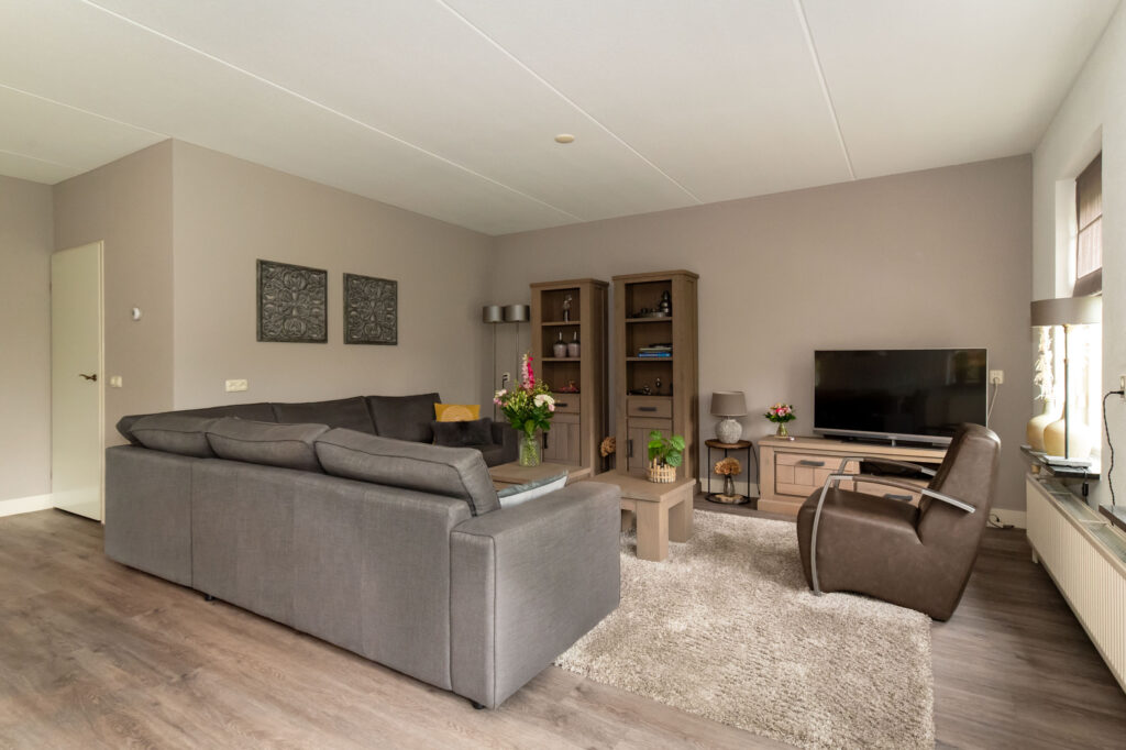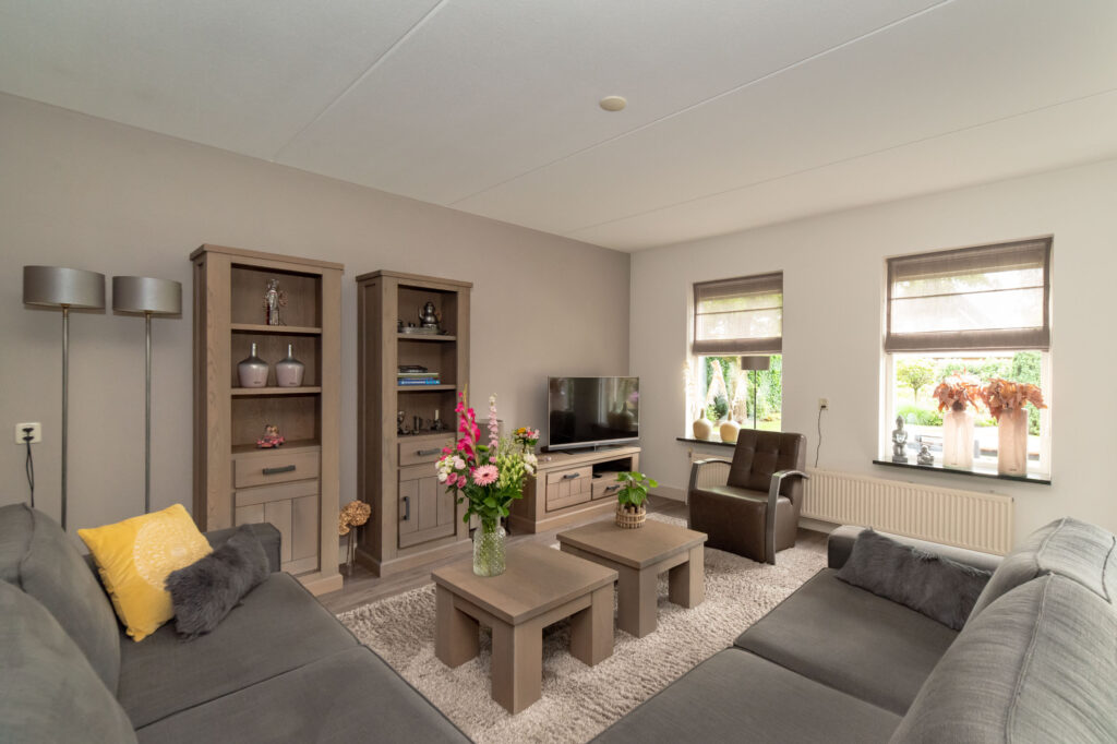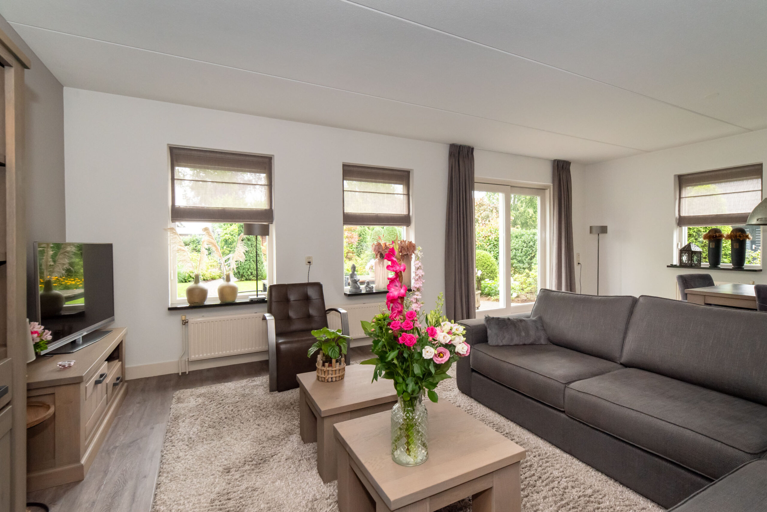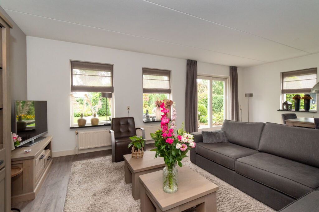 De royale woonkamer is gesitueerd aan de achterzijde van de woning en biedt via een schuifpui direct toegang tot de diepe achtertuin. Dankzij de grote raampartijen geniet je hier van veel lichtinval en een fijn uitzicht op de tuin.