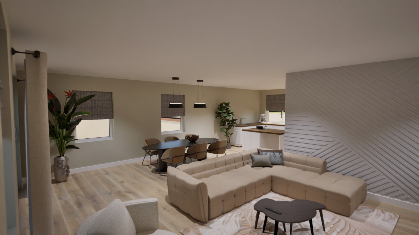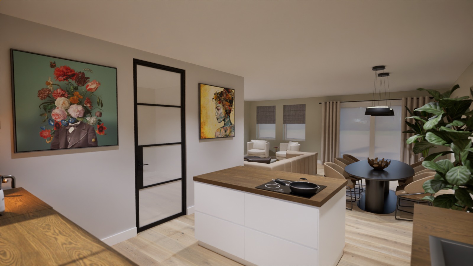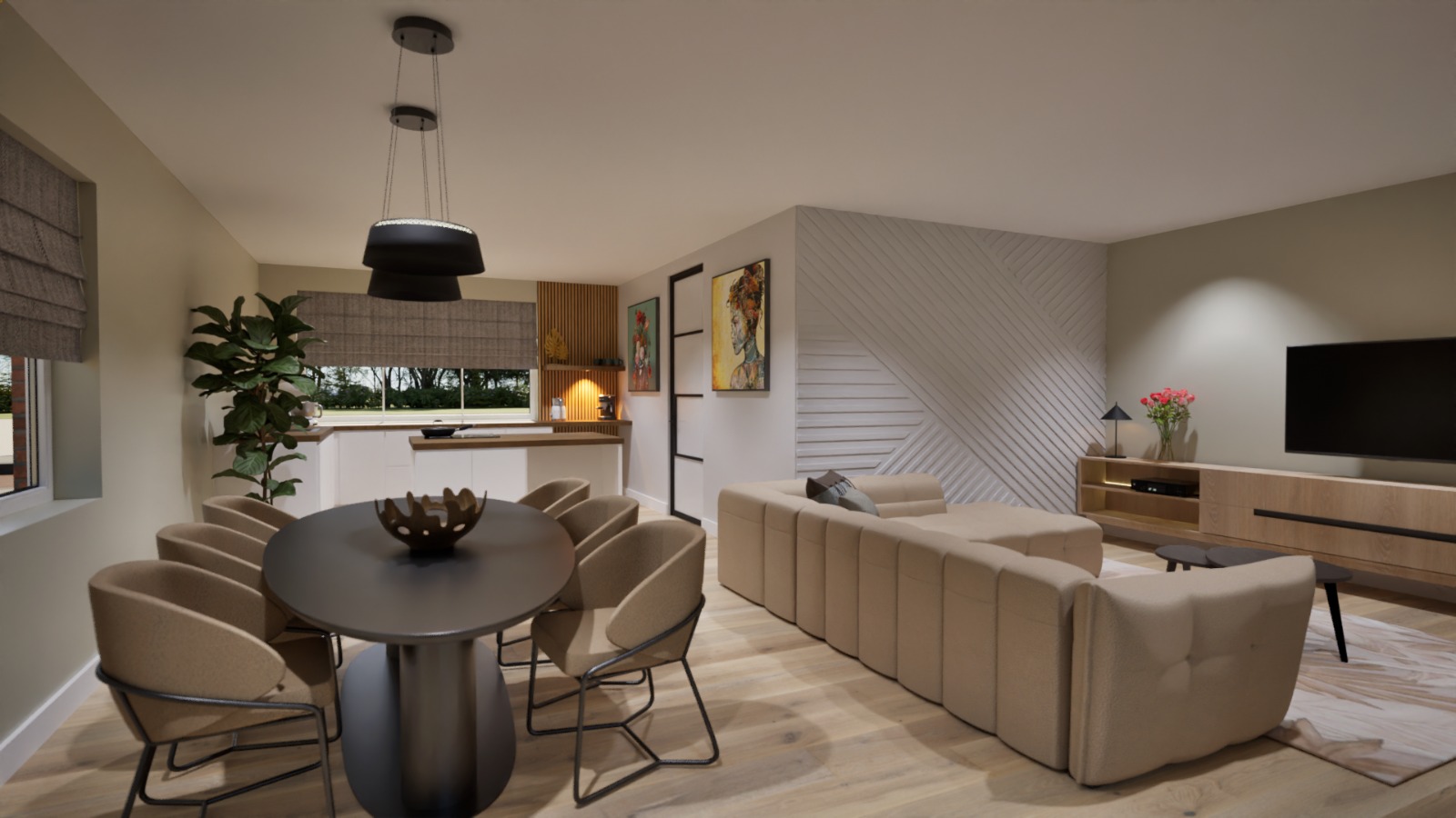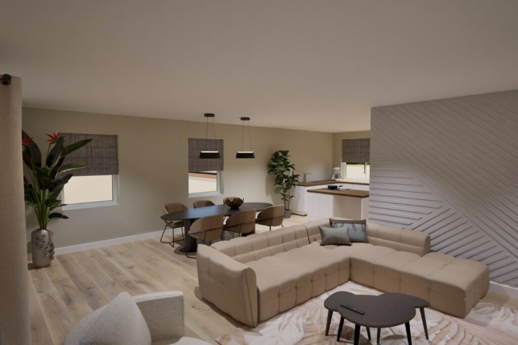 De royale woonkamer is gesitueerd aan de achterzijde van de woning en biedt via een schuifpui direct toegang tot de diepe achtertuin. Dankzij de grote raampartijen geniet je hier van veel lichtinval en een fijn uitzicht op de tuin.