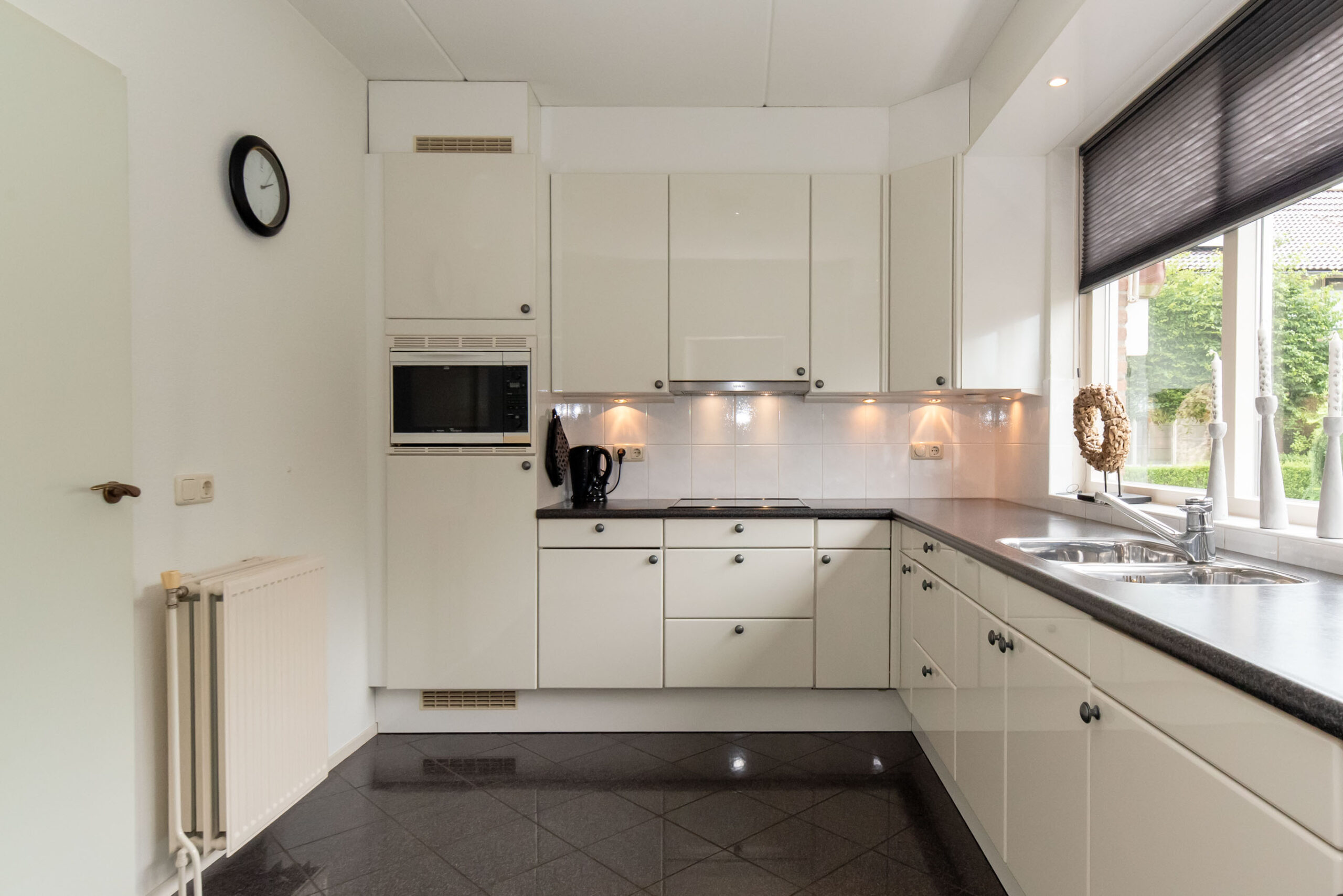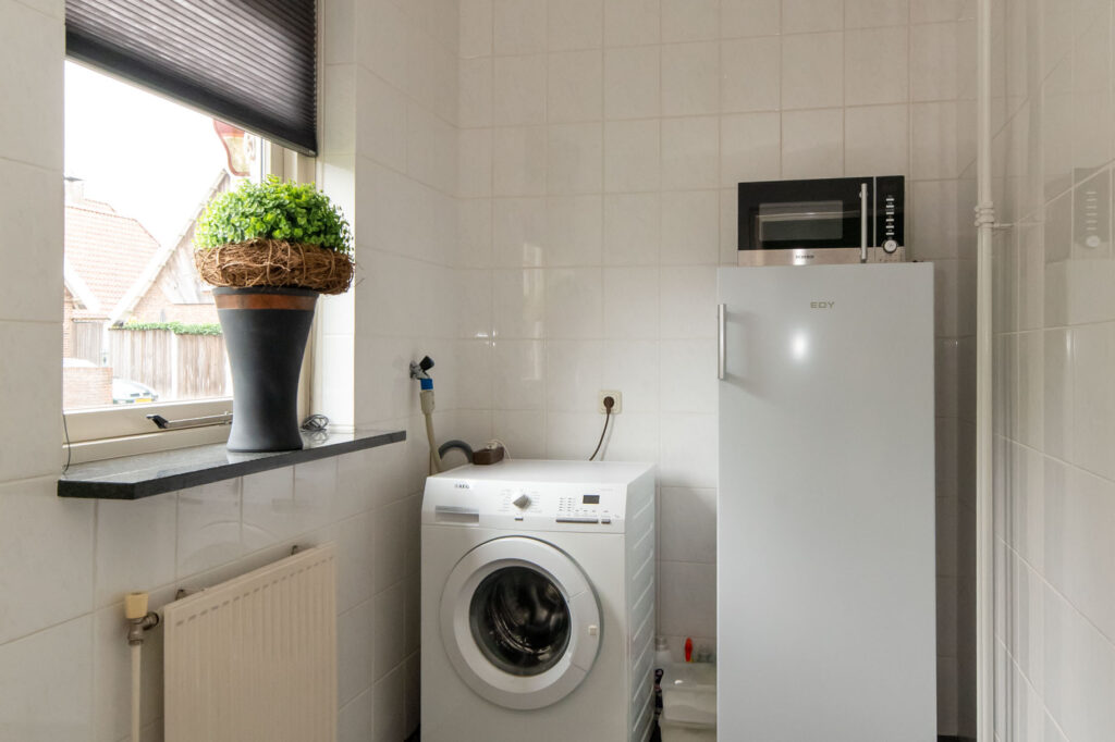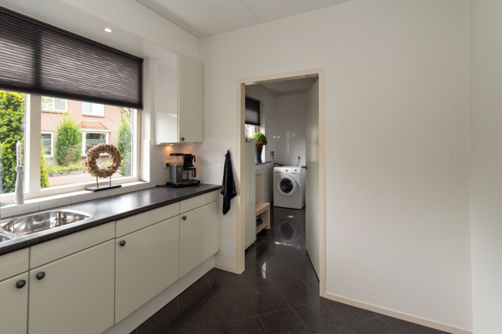 De keuken is via een deur afgescheiden van de woonkamer en uitgerust met een praktische inbouwkeuken voorzien van diverse apparatuur, waaronder een kookplaat, magnetron, koelkast en voldoende kastruimte. Aansluitend bevindt zich de bijkeuken, momenteel ingericht als wasruimte.