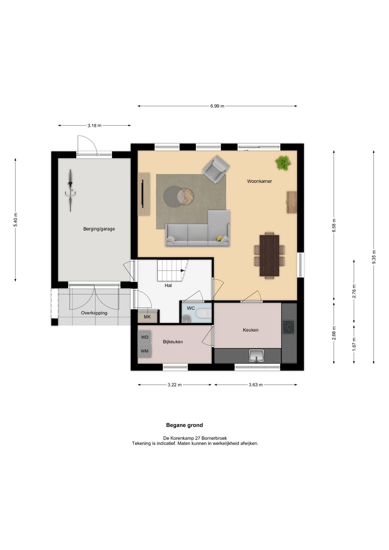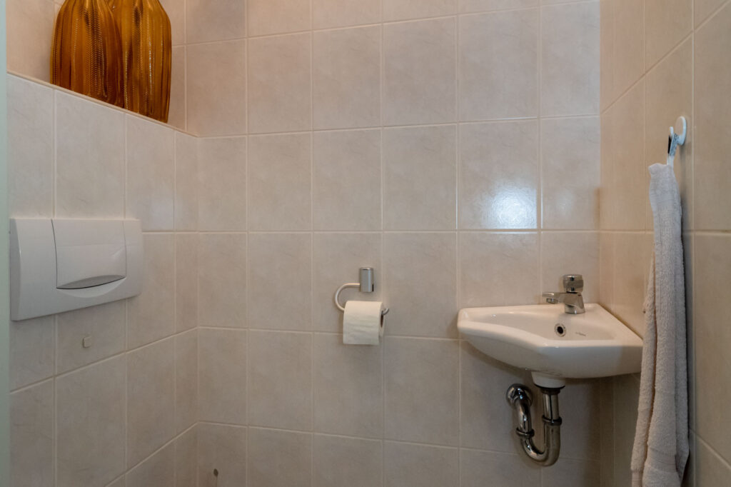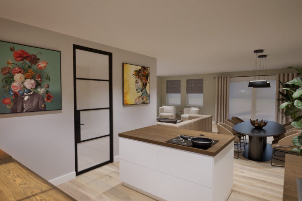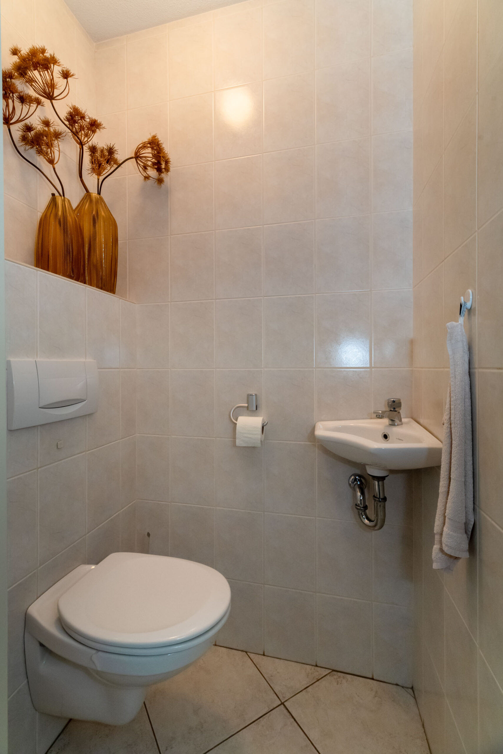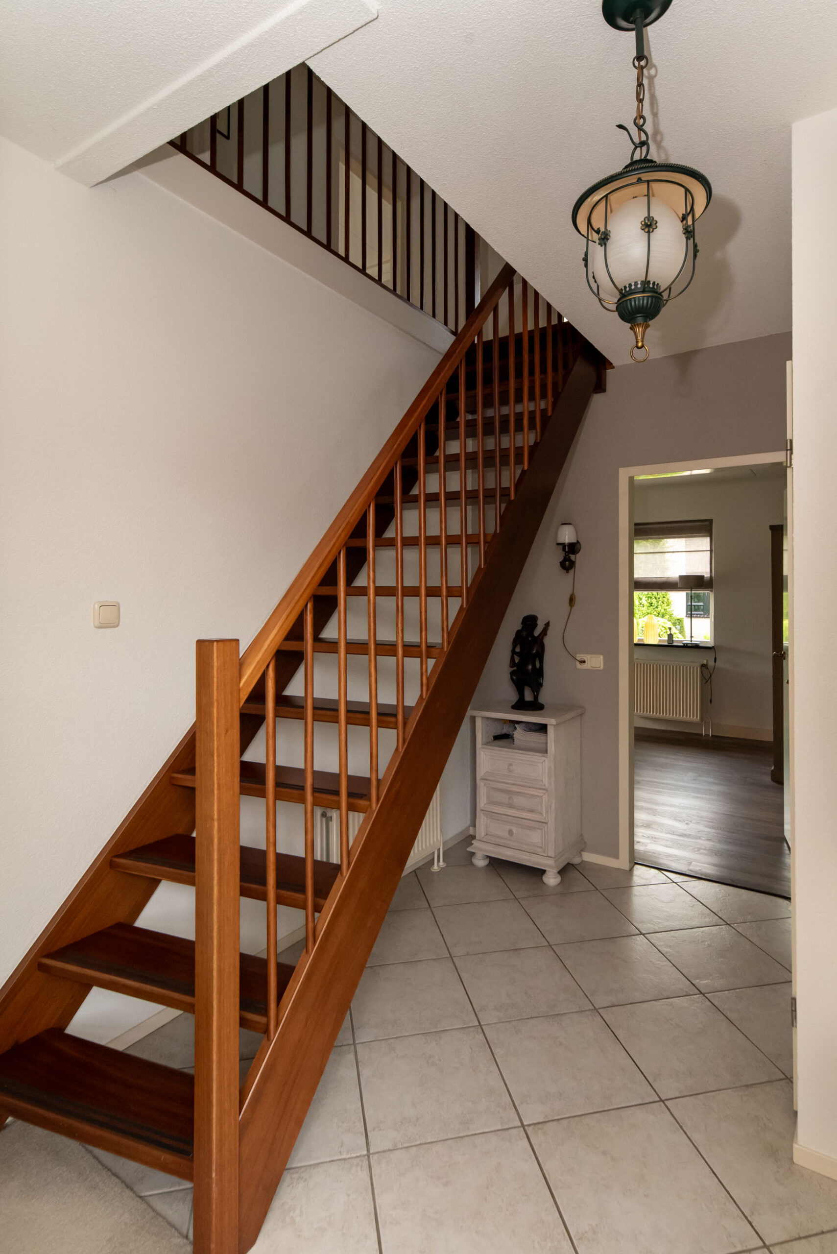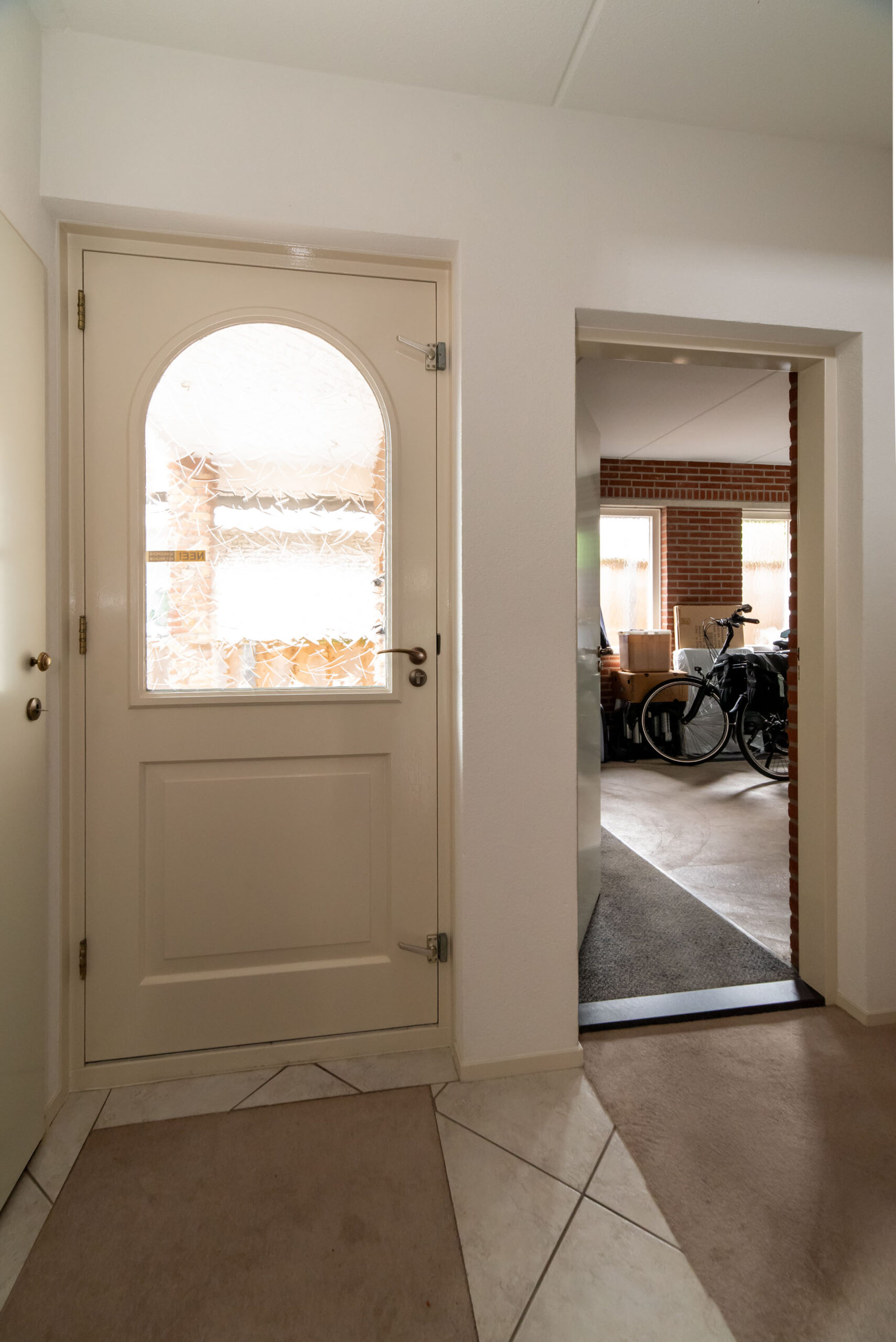 Bij aankomst parkeer je de auto gemakkelijk op de oprit of in de garage. Via de voordeur stap je binnen in de hal, waar je toegang hebt tot het toilet, de vaste trap naar de eerste verdieping en deuren richting zowel de garage als de woonkamer.