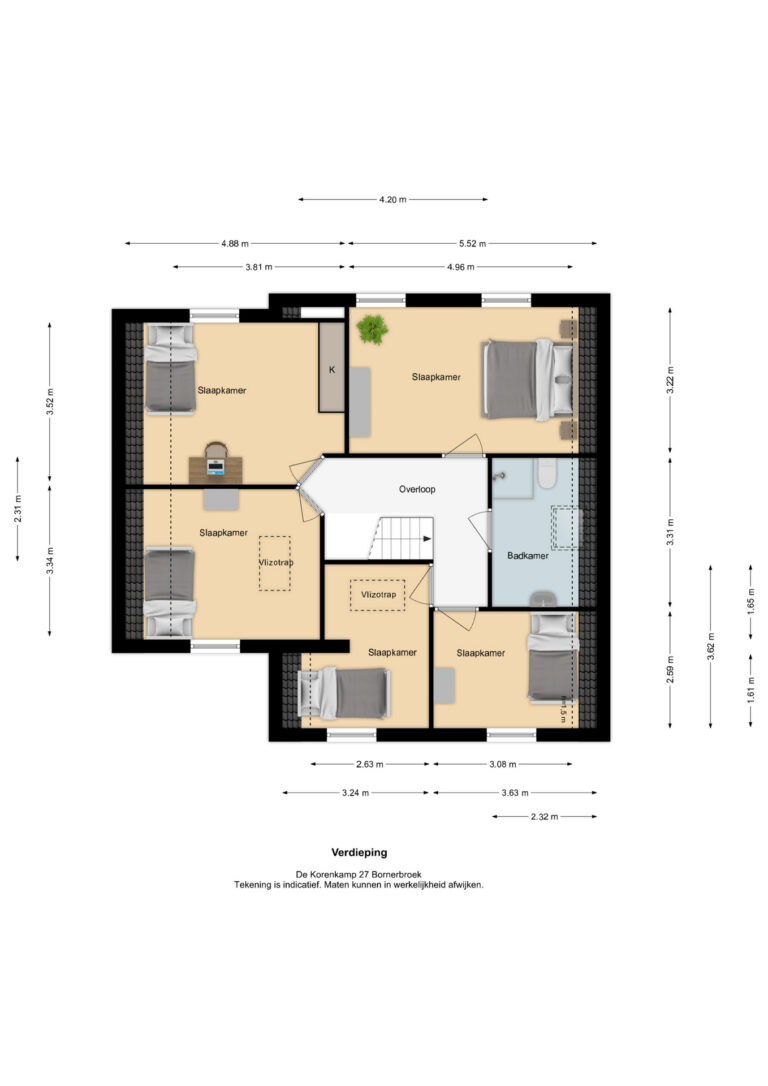 Let op: De vermelde afmetingen en gepubliceerde plattegronden zijn opgesteld volgens de Branche Brede Meetinstructie, gebaseerd op NEN2580, met onderverdeling in verschillende gebruiksoppervlakten. Omdat de publicatie van informatie via diverse externe kanalen verloopt, kan Daan Makelaars BV geen aansprakelijkheid aanvaarden voor onjuiste weergave van informatie.