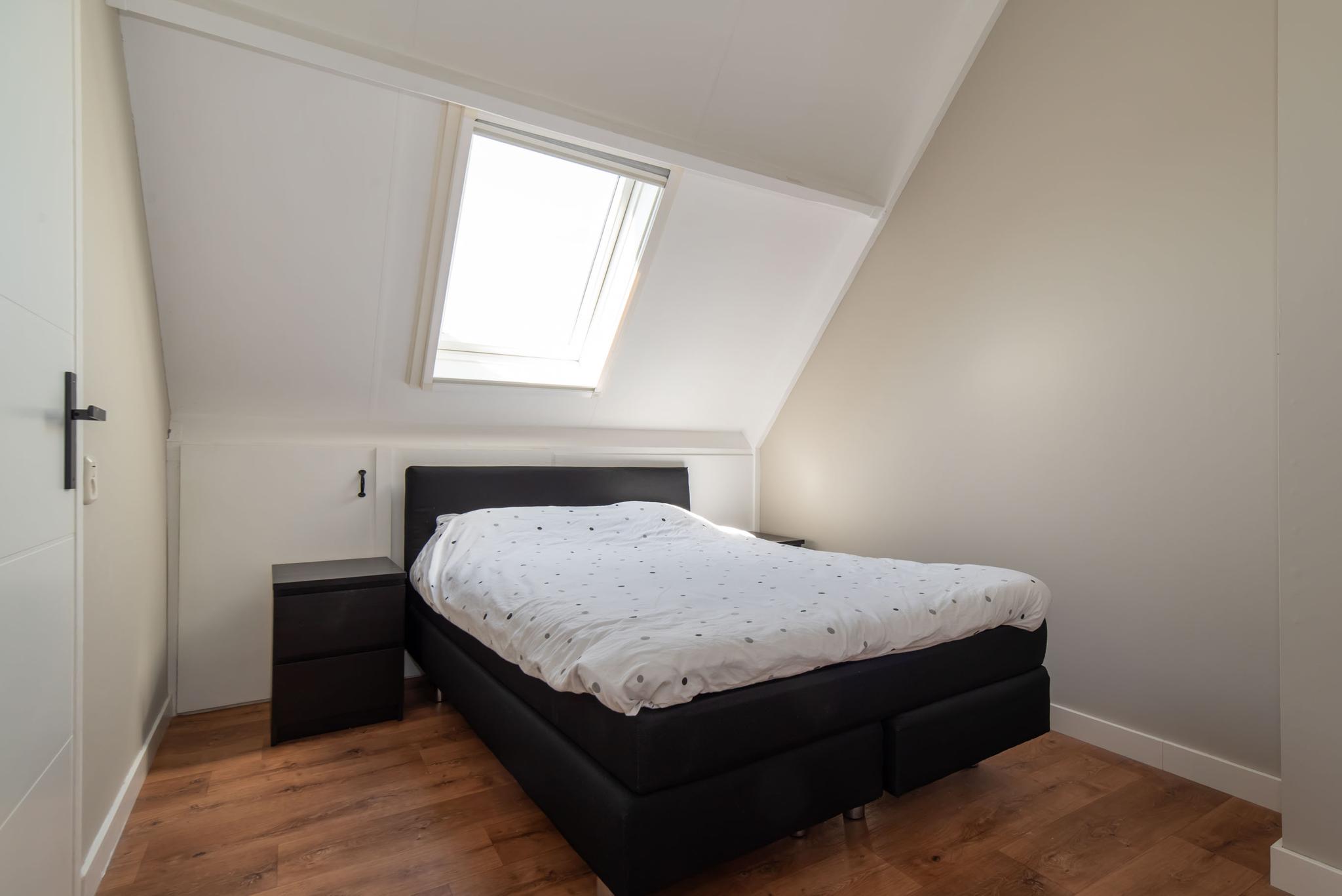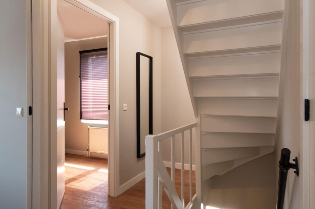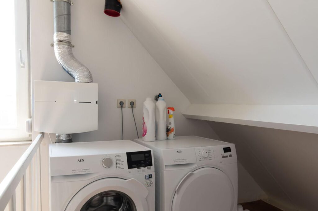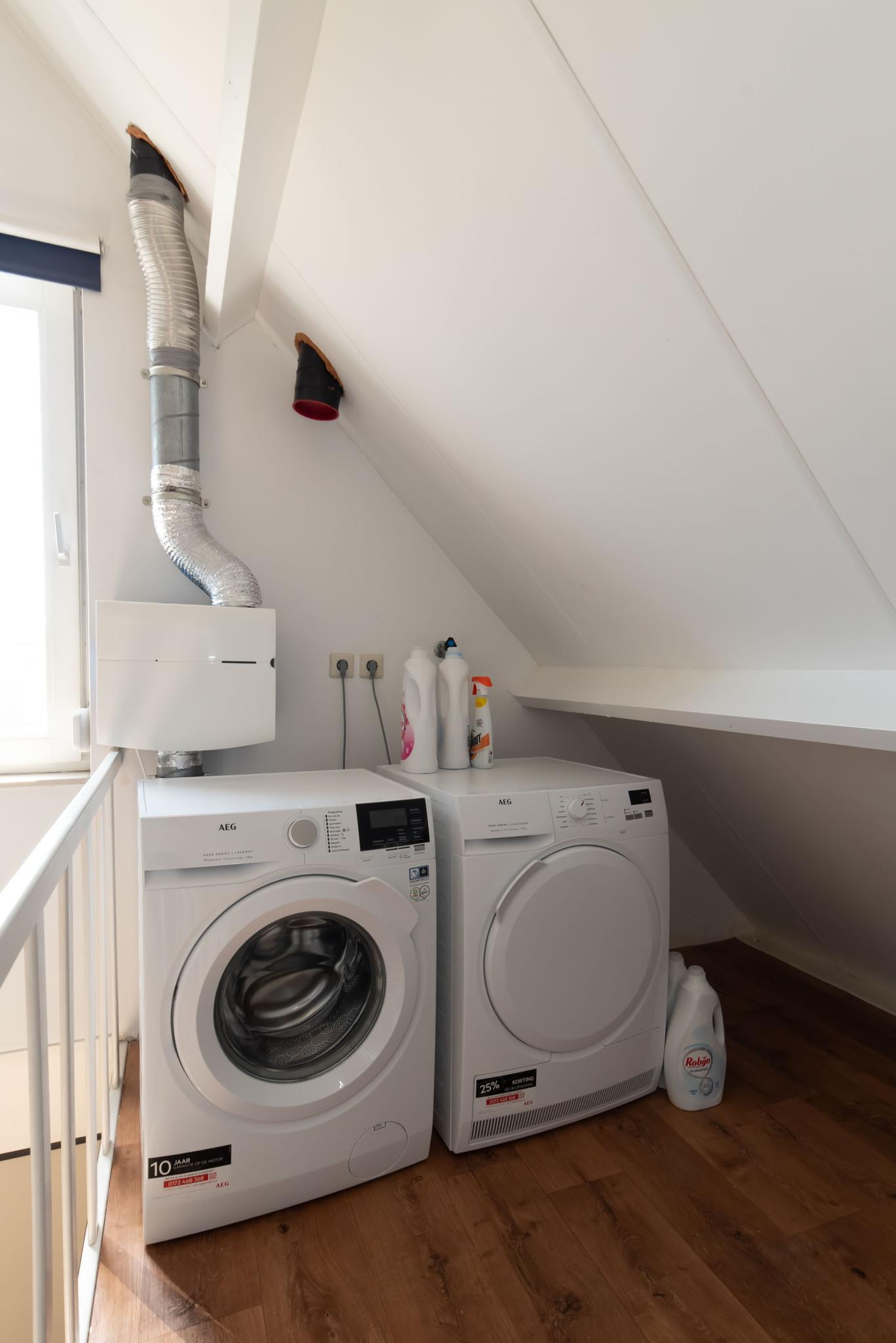 Op de tweede verdieping vind je aansluitingen voor de wasmachine en droger, en een slaapkamer met handige opbergruimte achter de knieschotten.