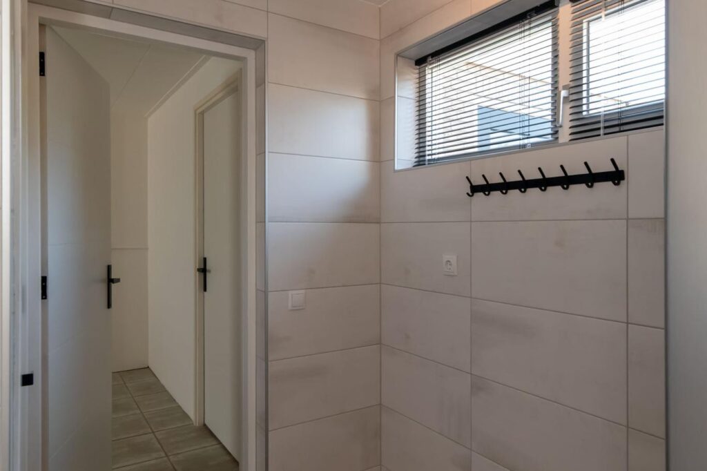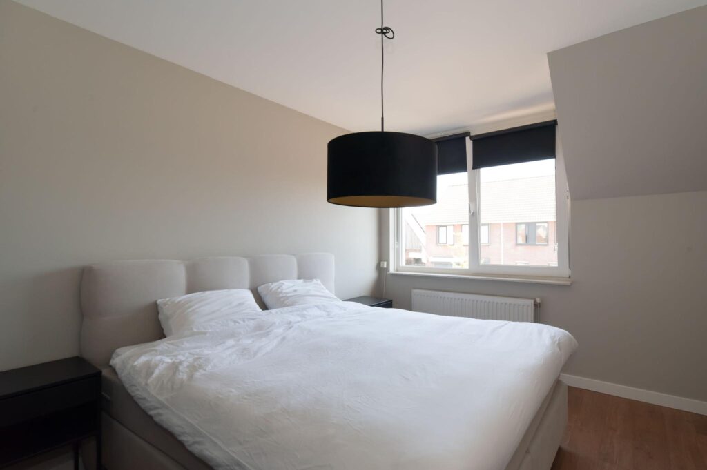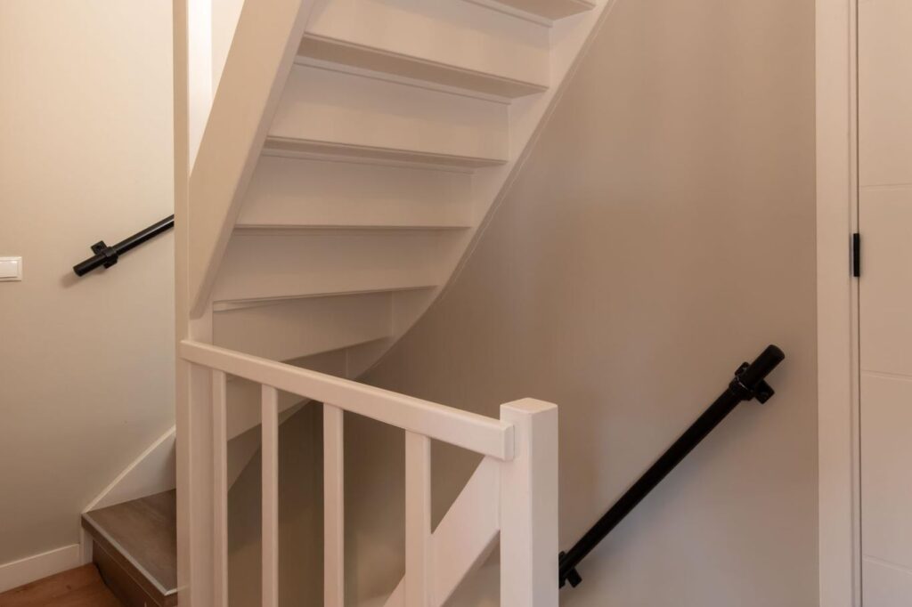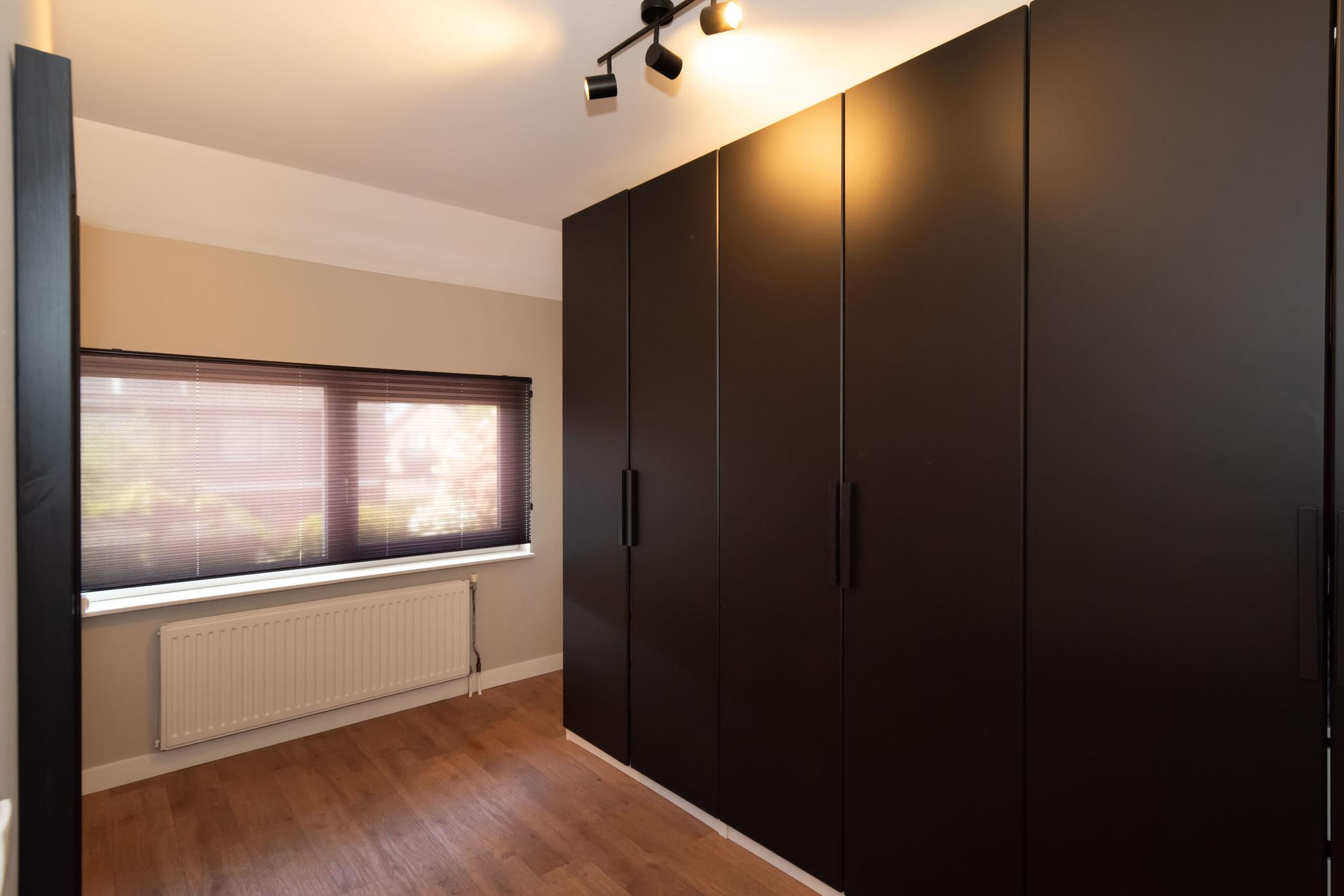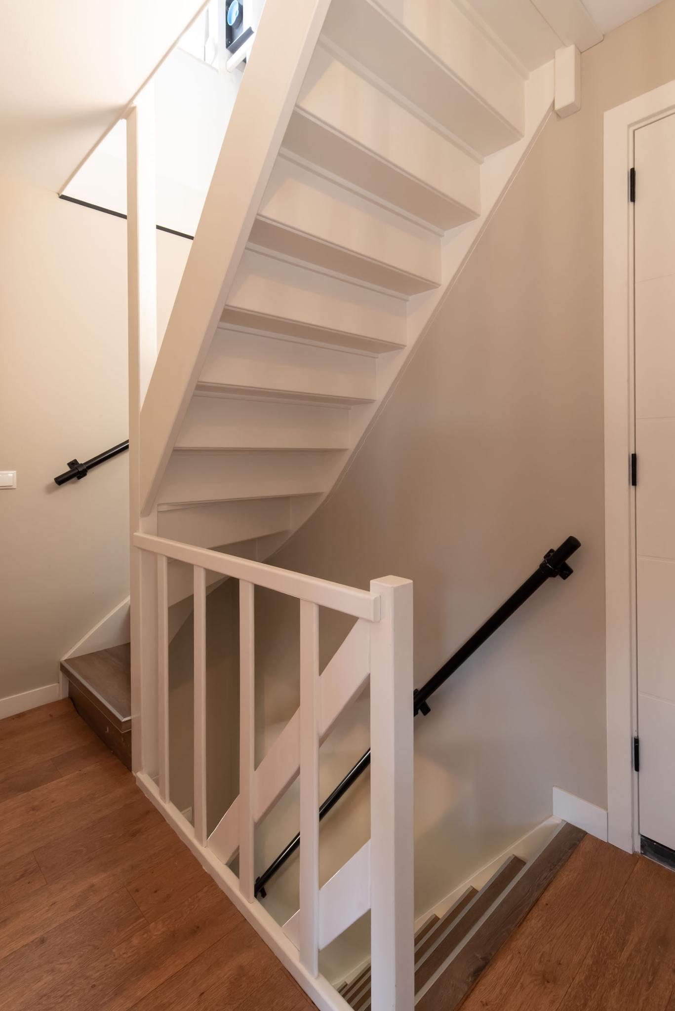 Op de tweede verdieping vind je aansluitingen voor de wasmachine en droger, en een slaapkamer met handige opbergruimte achter de knieschotten.