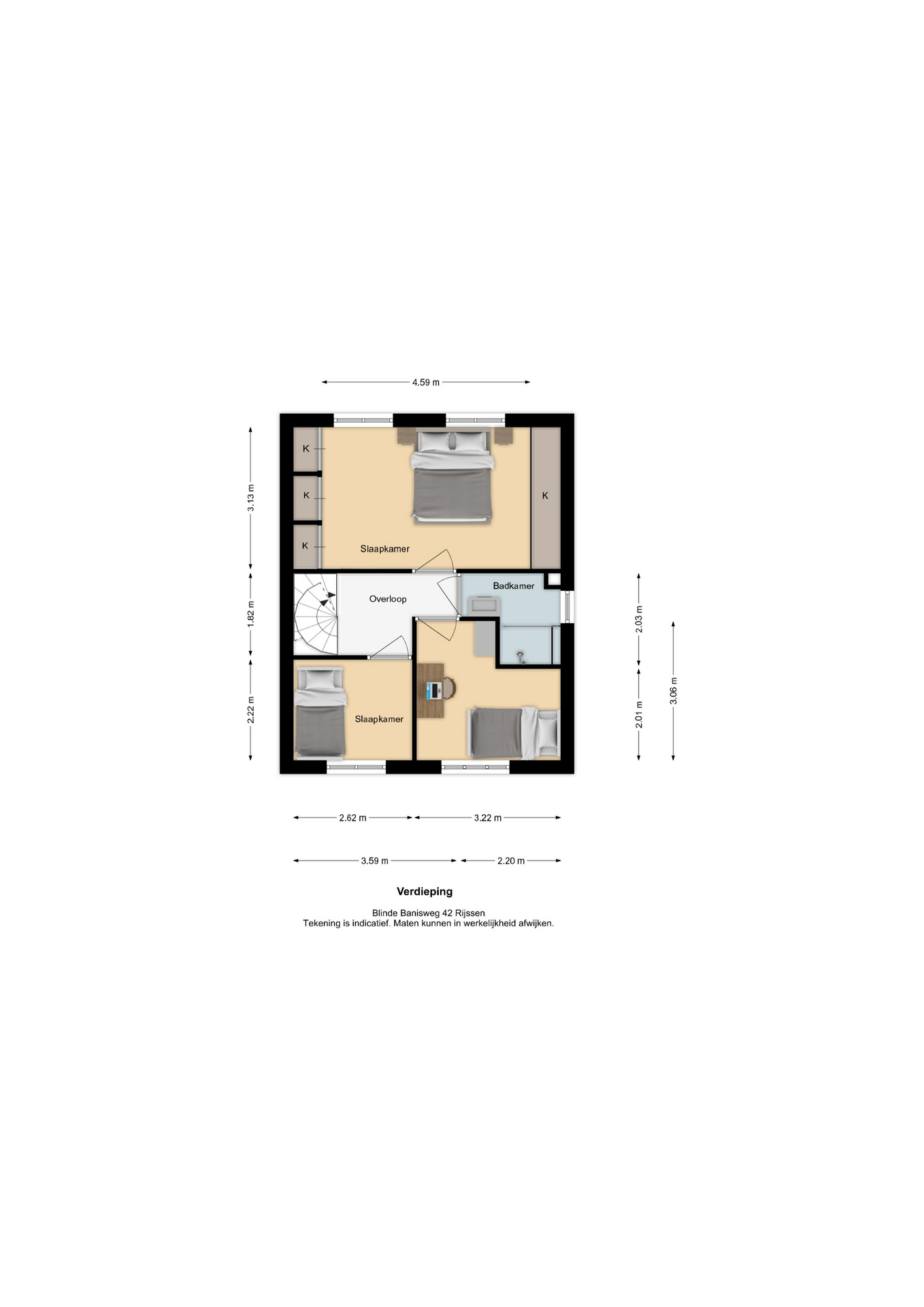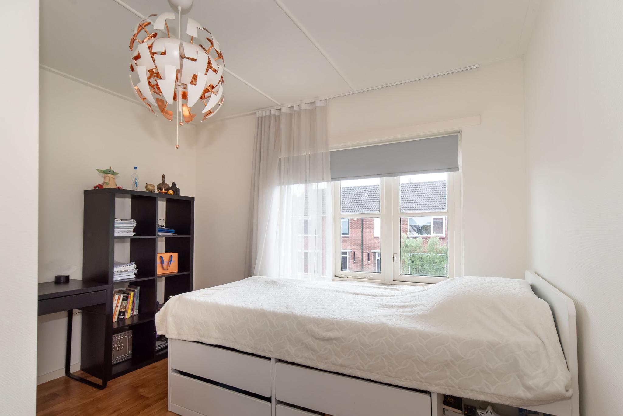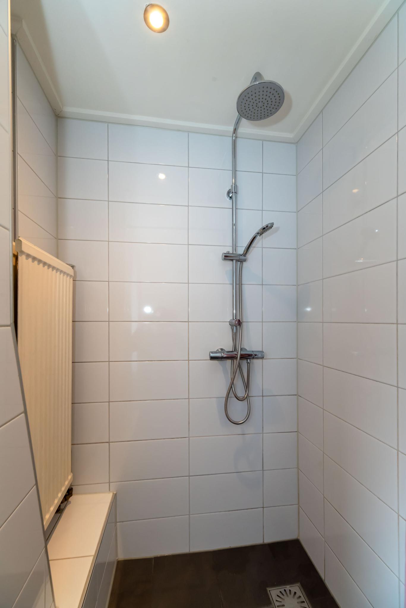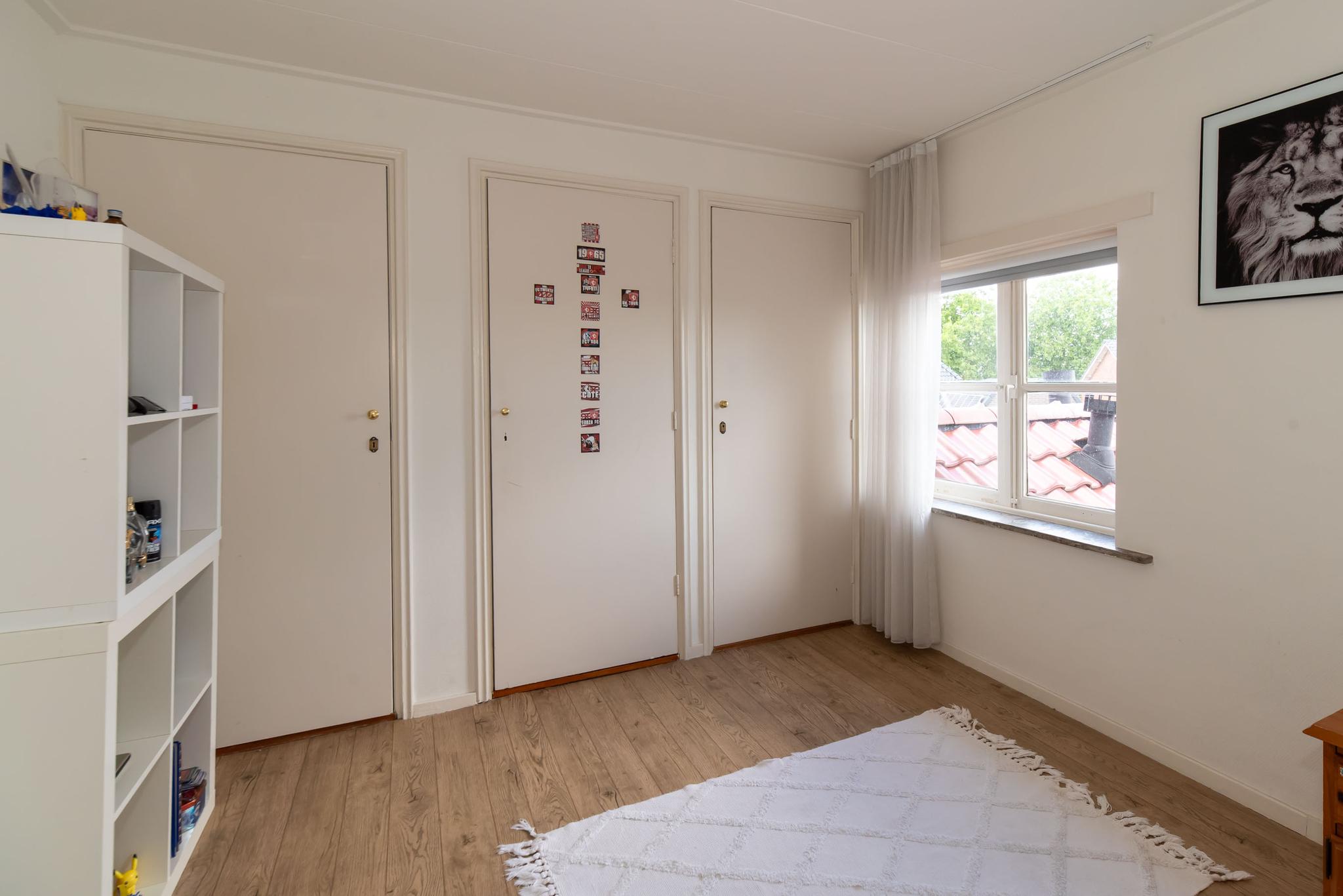 Op de eerste verdieping bevinden zich drie slaapkamers, waarvan één met meerdere vaste kasten. Op de overloop vind je de badkamer en de trap naar de tweede verdieping. De badkamer is voorzien van een wastafel en een inloopdouche.