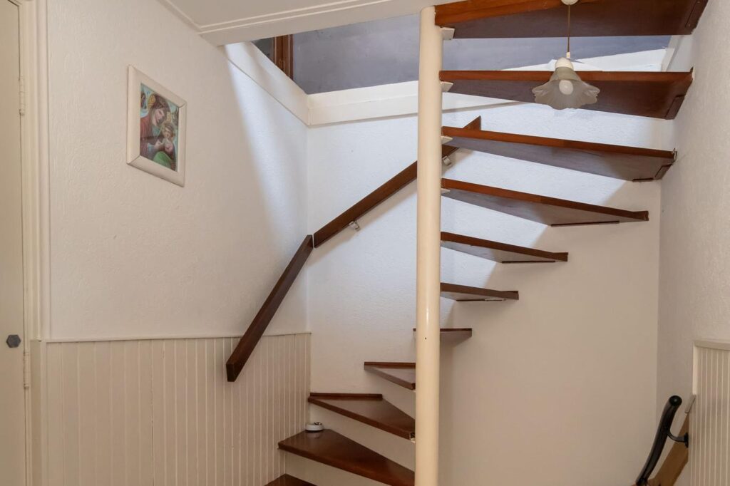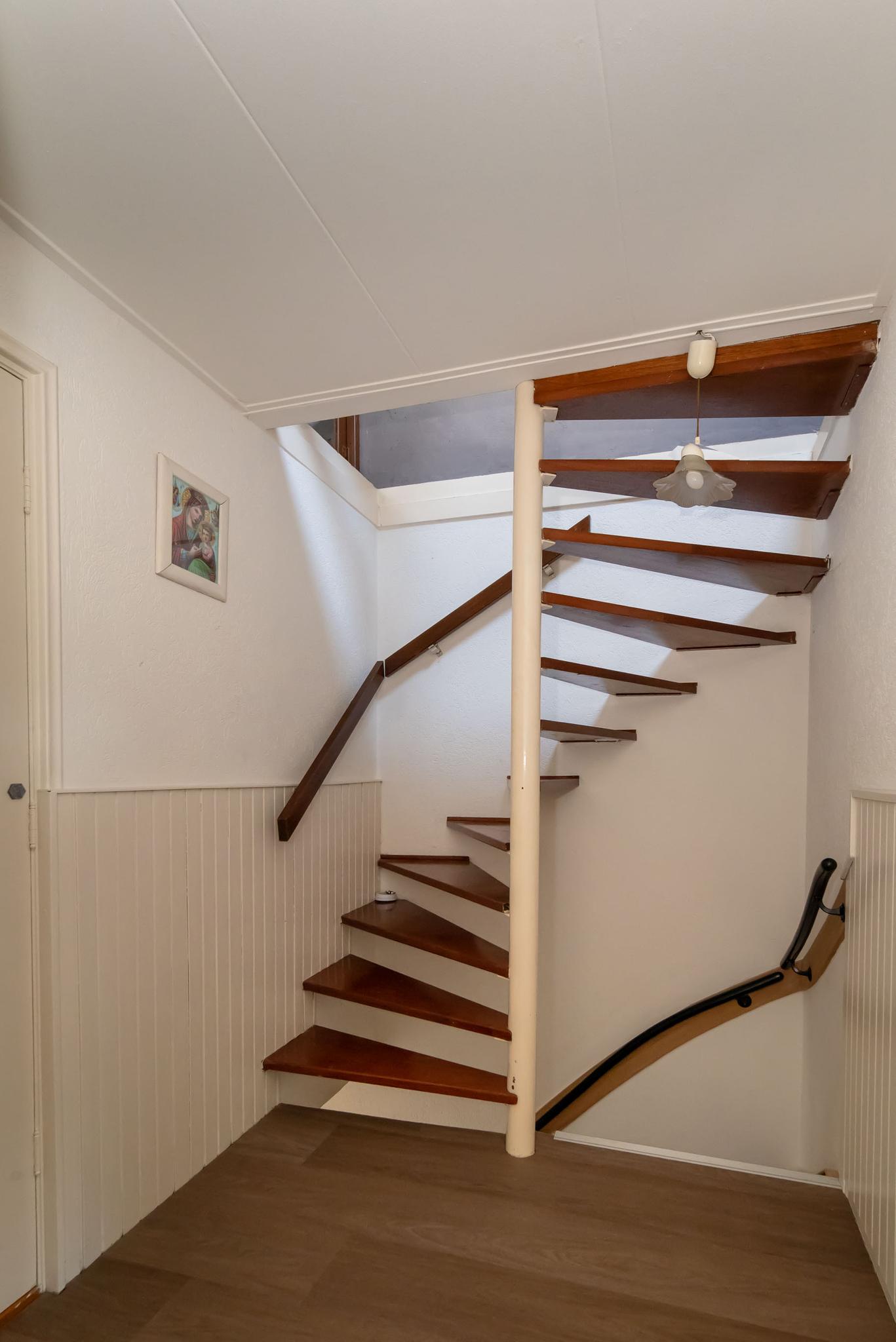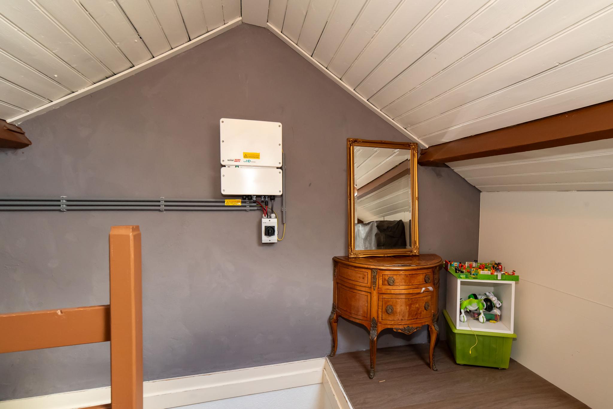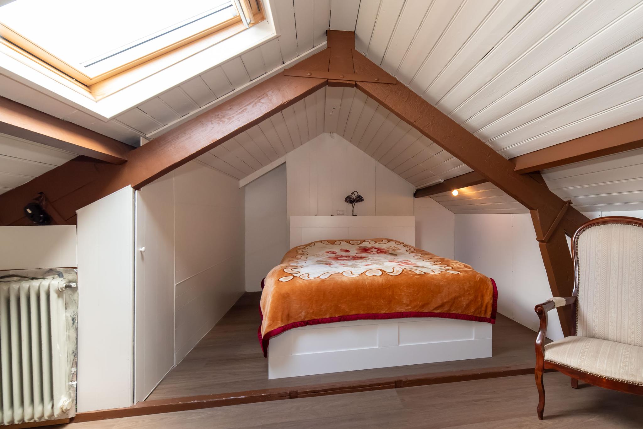 De tweede verdieping wordt momenteel gebruikt als slaapkamer en biedt extra bergruimte achter de knieschotten.