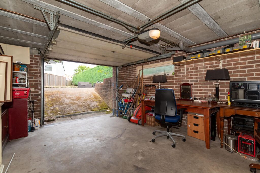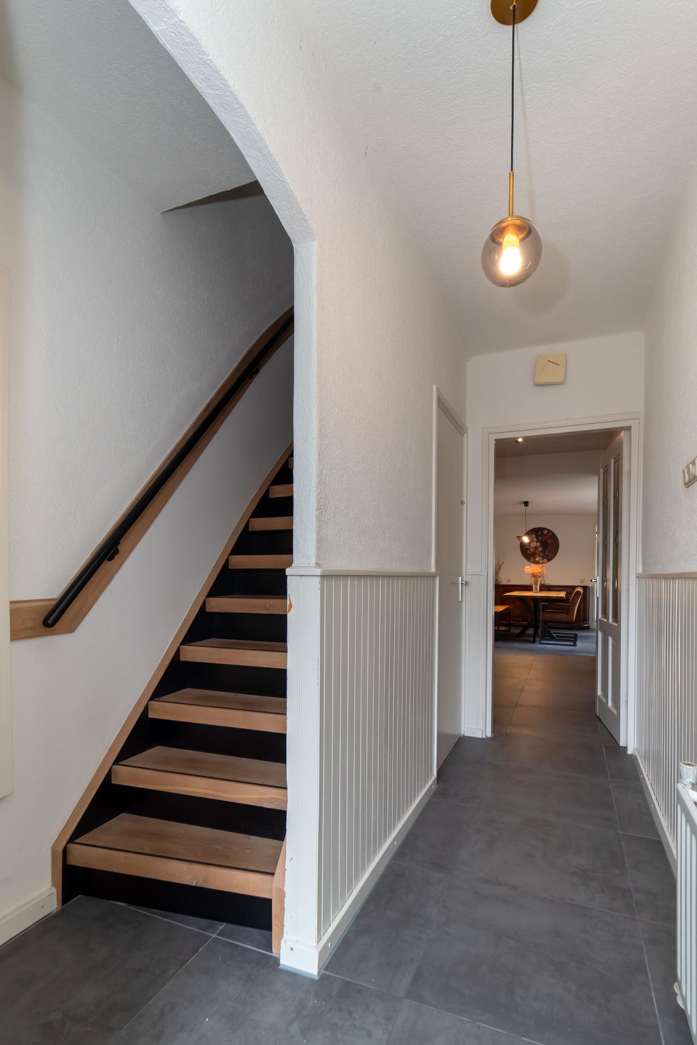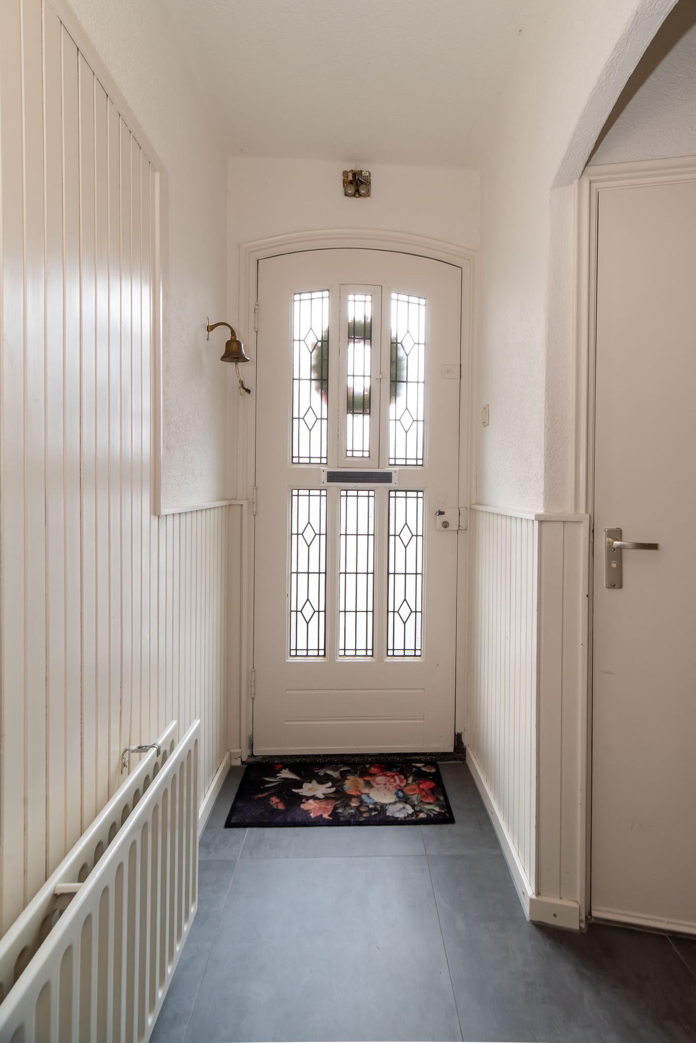 Je kunt je auto parkeren op je eigen oprit of in de garagekelder. Via de voordeur betreed je de woning en kom je in de hal. Hier heb je toegang tot de trap naar de kelder en de eerste verdieping, het toilet en de deur naar de woonkeuken.