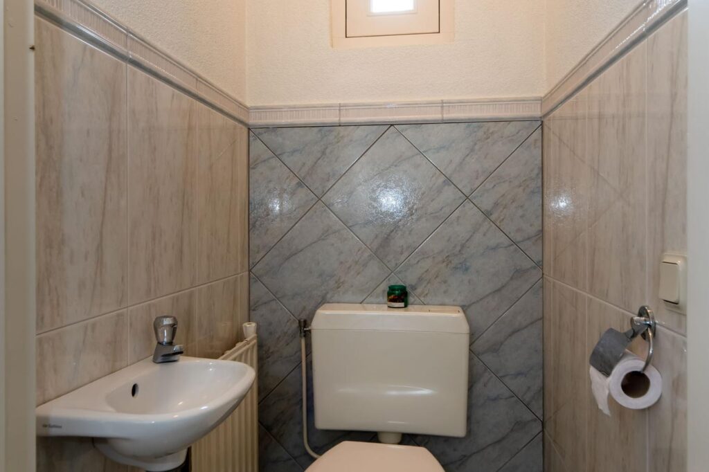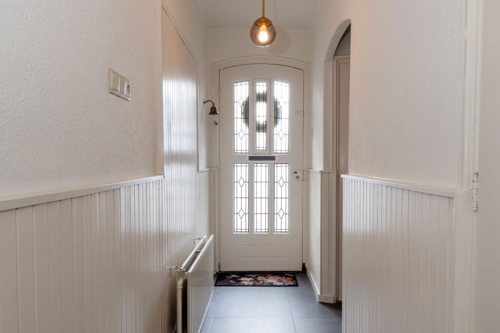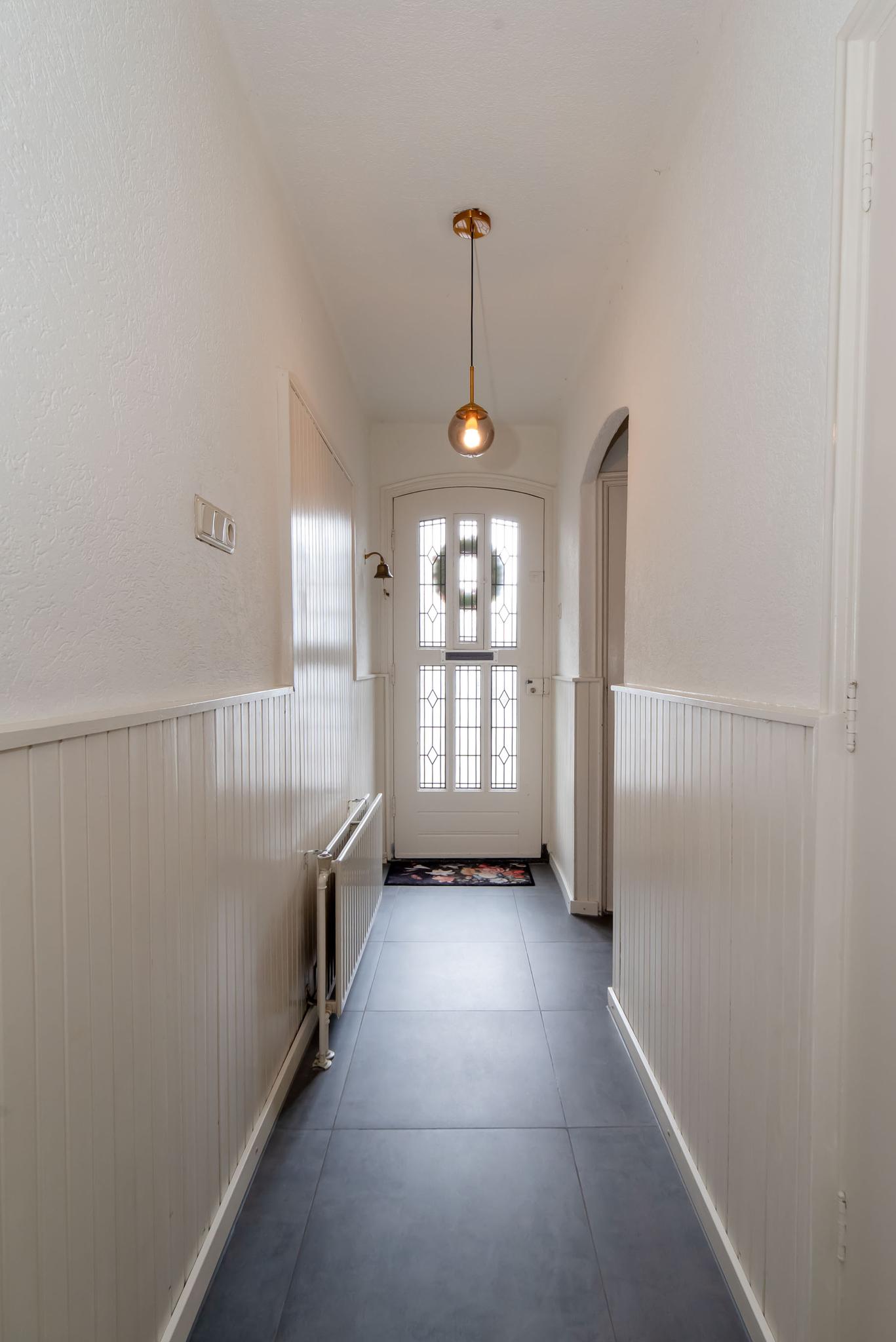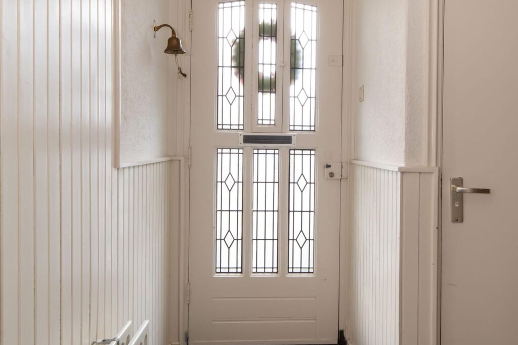 Je kunt je auto parkeren op je eigen oprit of in de garagekelder. Via de voordeur betreed je de woning en kom je in de hal. Hier heb je toegang tot de trap naar de kelder en de eerste verdieping, het toilet en de deur naar de woonkeuken.