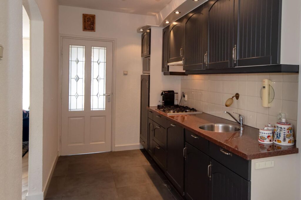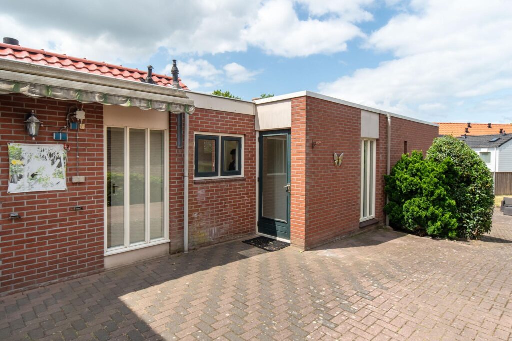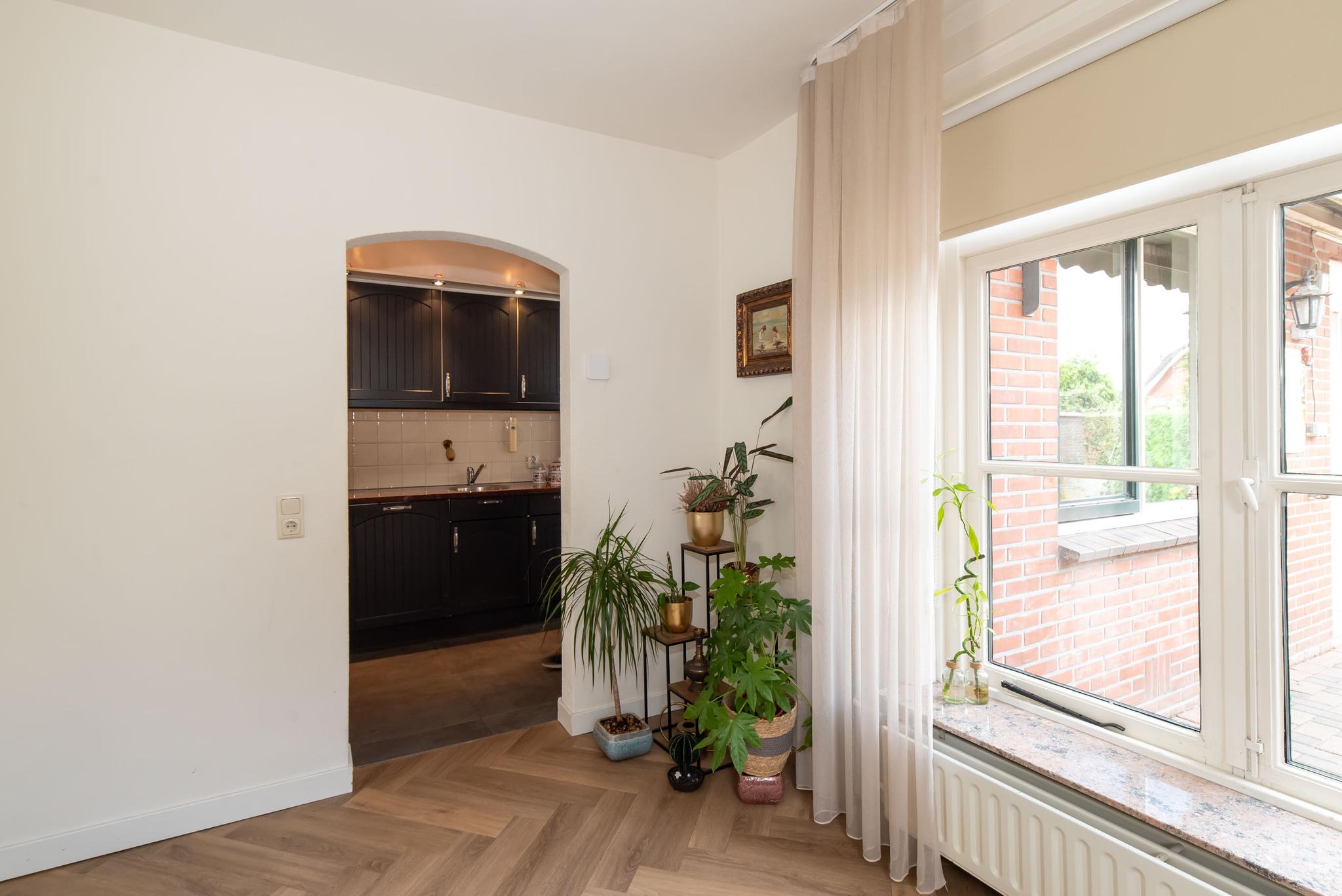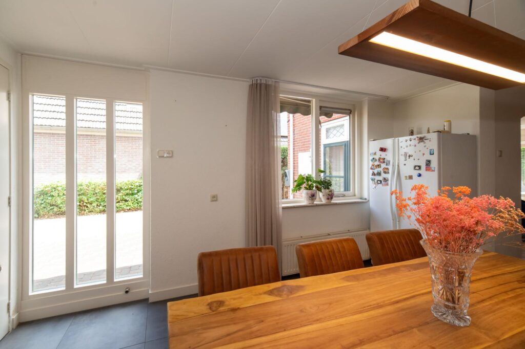 De woonkeuken is uitgebouwd en biedt daardoor ruimte voor een grote eettafel voor het hele gezin. De keuken is voorzien van inbouwapparatuur, zoals een gaskookplaat, vaatwasser, koelkast, magnetron en voldoende kastruimte. Vanuit de woonkeuken bereik je de gang en de woonkamer. De woonkamer heeft een visgraat pvc-vloer en veel lichtinval dankzij de grote raampartijen. In de gang heb je toegang tot de slaapkamer, inloopkast, het tweede toilet, de was- en stookruimte en de deur naar de tuin. De tuin is ingericht met een grasmat en een betegeld terras.