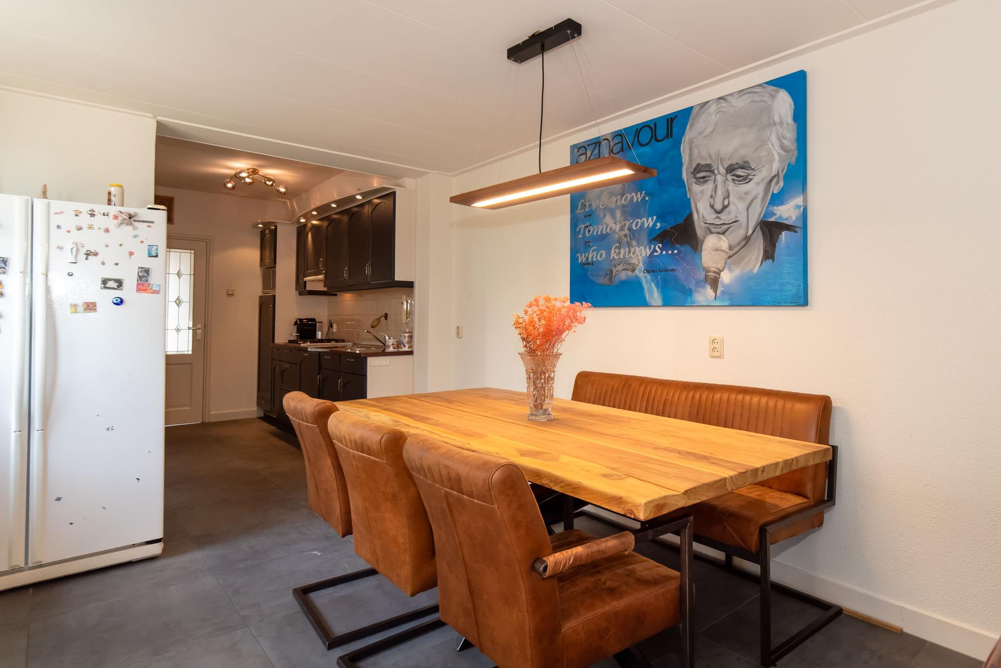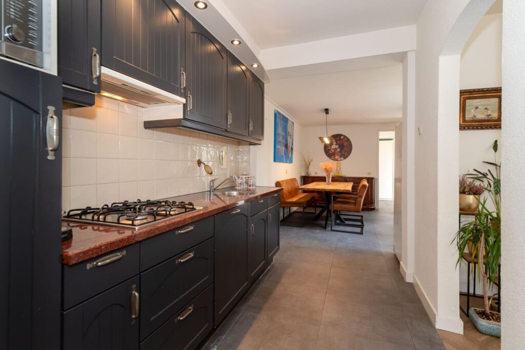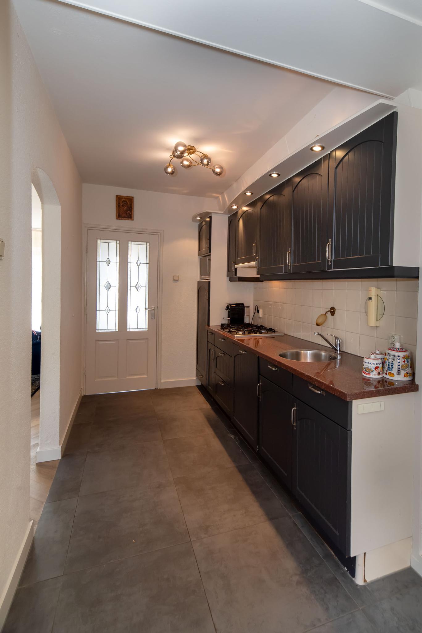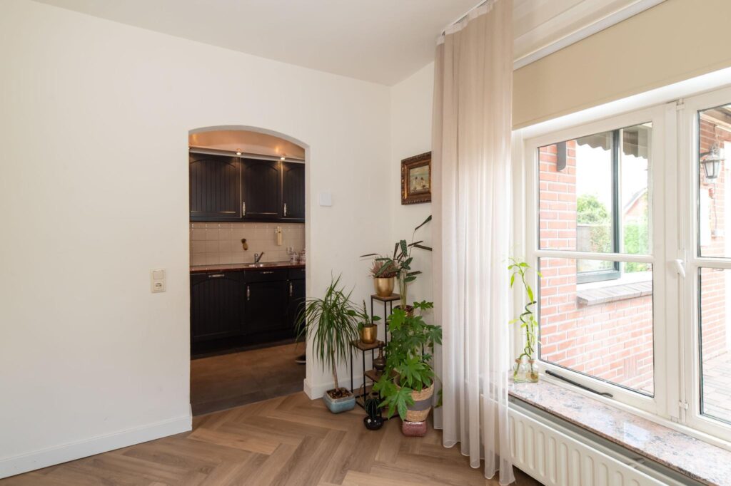 De woonkeuken is uitgebouwd en biedt daardoor ruimte voor een grote eettafel voor het hele gezin. De keuken is voorzien van inbouwapparatuur, zoals een gaskookplaat, vaatwasser, koelkast, magnetron en voldoende kastruimte. Vanuit de woonkeuken bereik je de gang en de woonkamer. De woonkamer heeft een visgraat pvc-vloer en veel lichtinval dankzij de grote raampartijen. In de gang heb je toegang tot de slaapkamer, inloopkast, het tweede toilet, de was- en stookruimte en de deur naar de tuin. De tuin is ingericht met een grasmat en een betegeld terras.