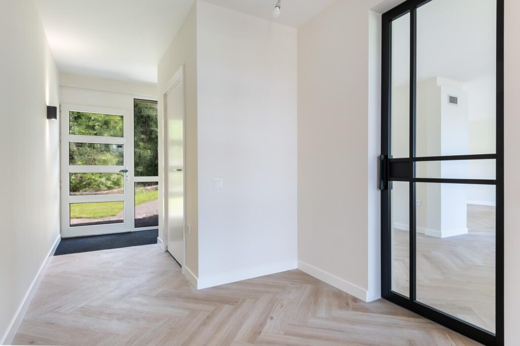 Via de voordeur kom je in de entree terecht. Vanuit hier heb je toegang tot alle vertrekken én tot de inpandige garage met berging. De woning