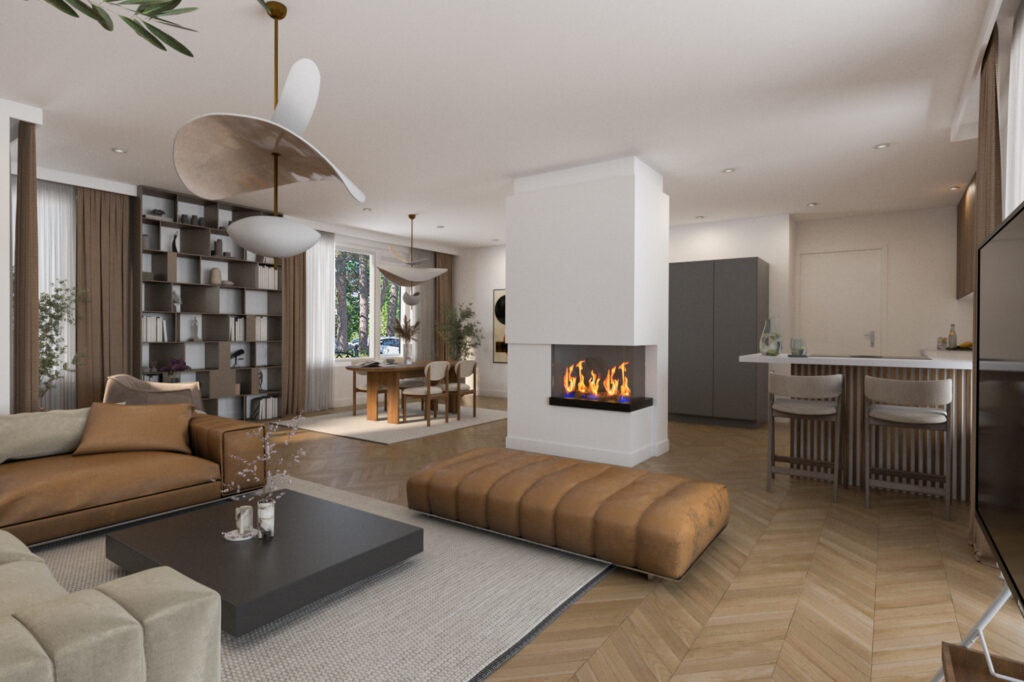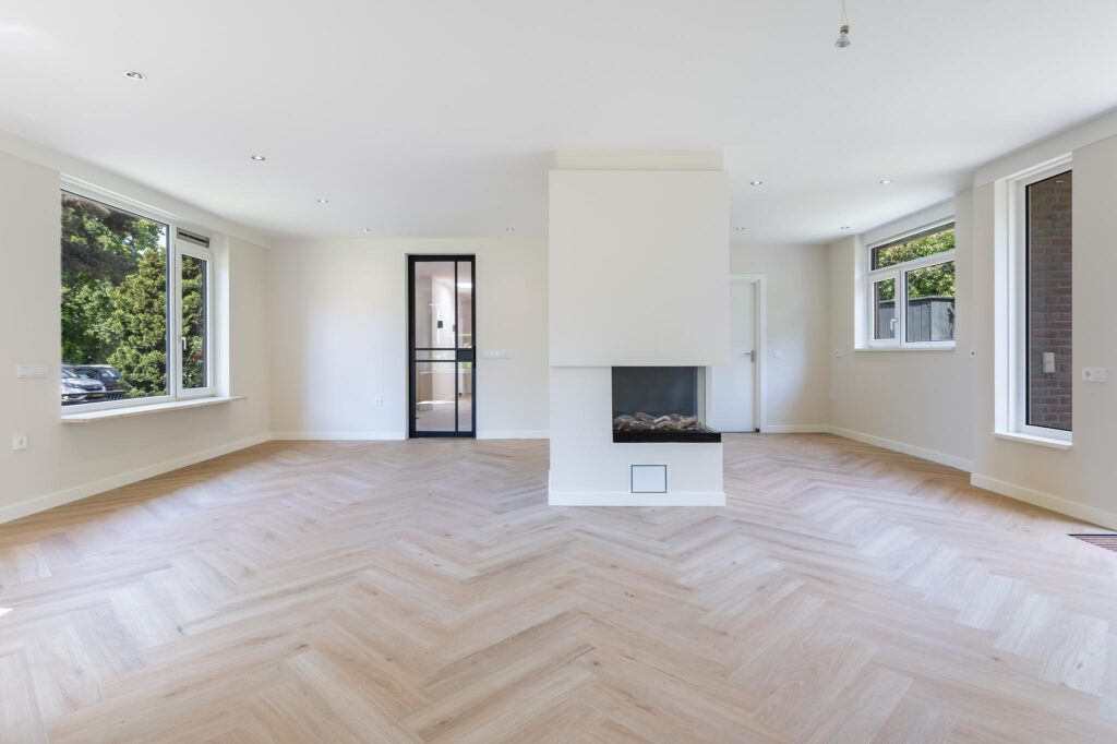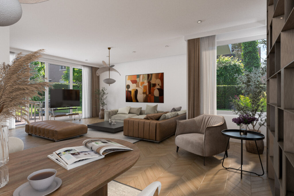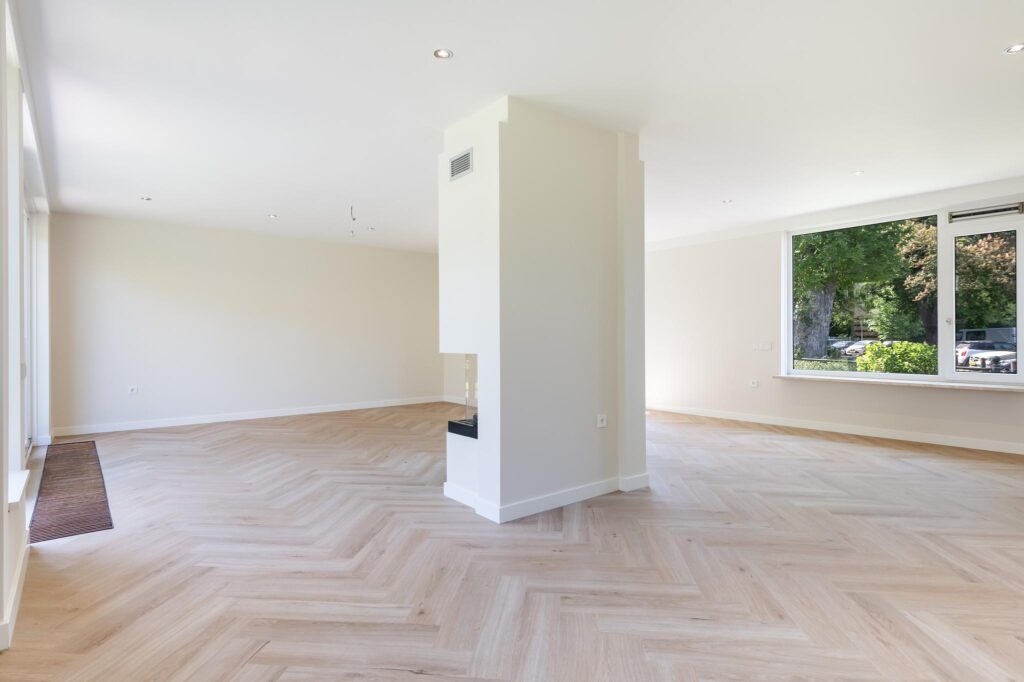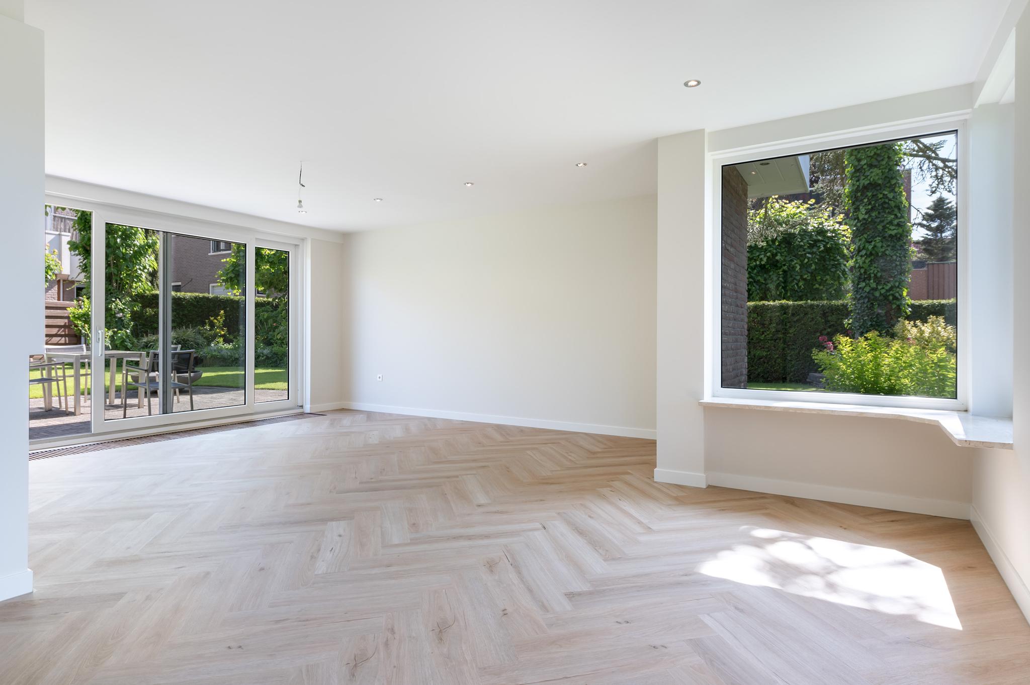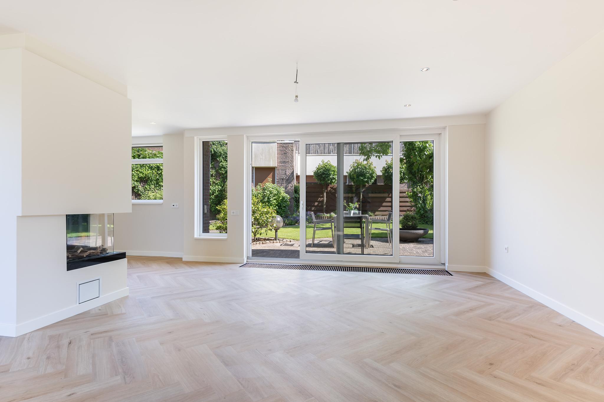 De keuken is recent verwijderd, zodat de nieuwe eigenaar hier een geheel nieuwe keuken kan plaatsen die volledig aansluit bij de eigen woonwensen en stijl. Alle benodigde aansluitingen zijn aanwezig. Vanuit de toekomstige keuken is de ruime woonkamer rechtstreeks bereikbaar. De woonkamer is licht en ruim opgezet en biedt voldoende ruimte voor een comfortabele zithoek en een eettafel. Via de schuifpui heb je direct toegang tot de tuin.