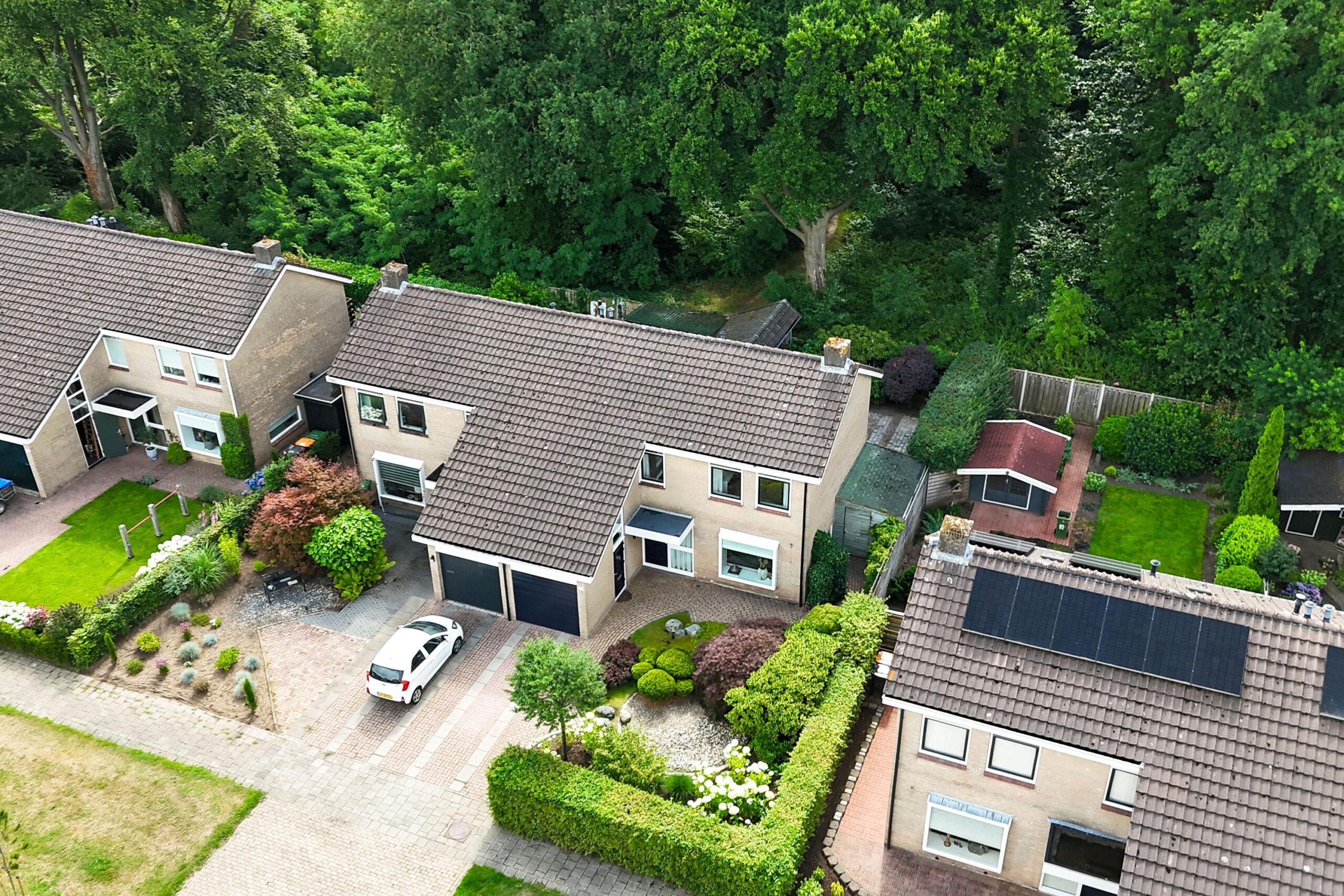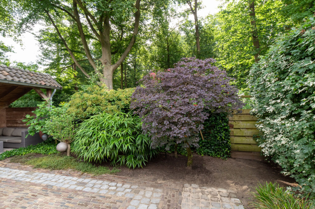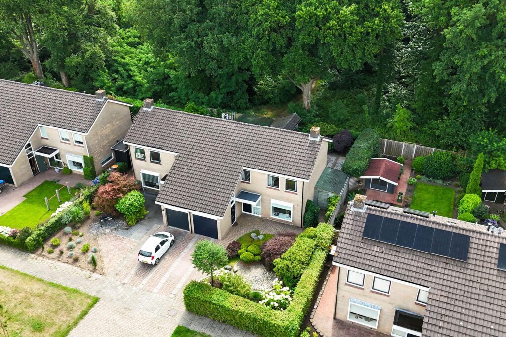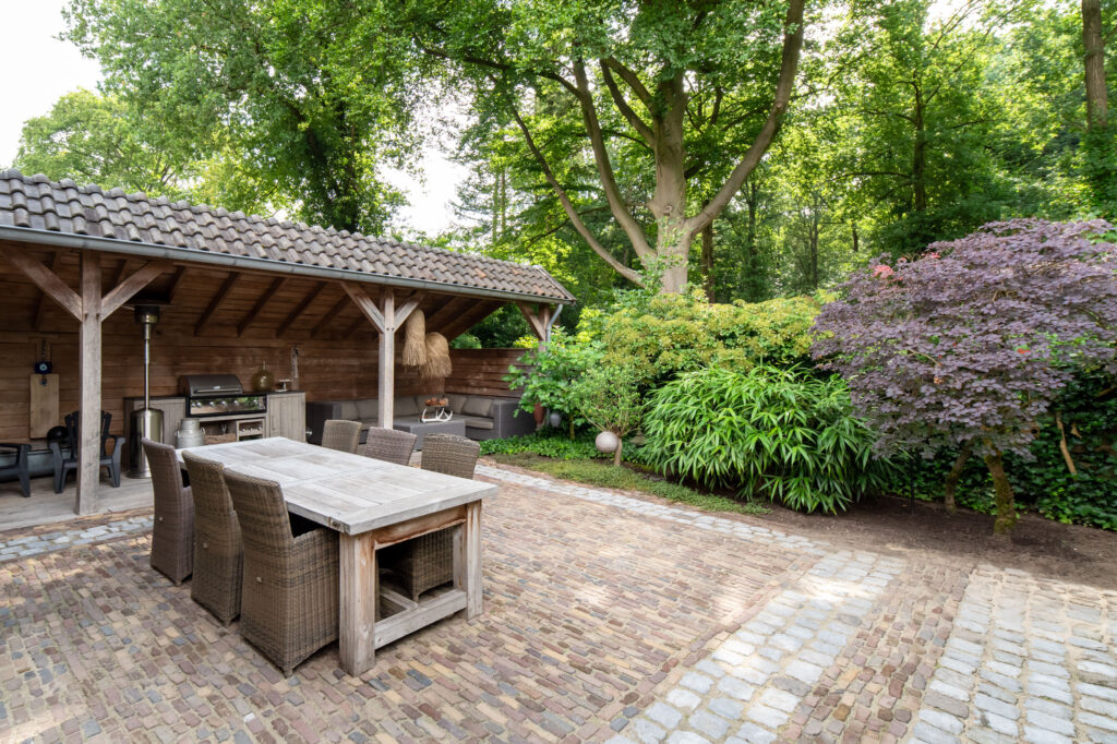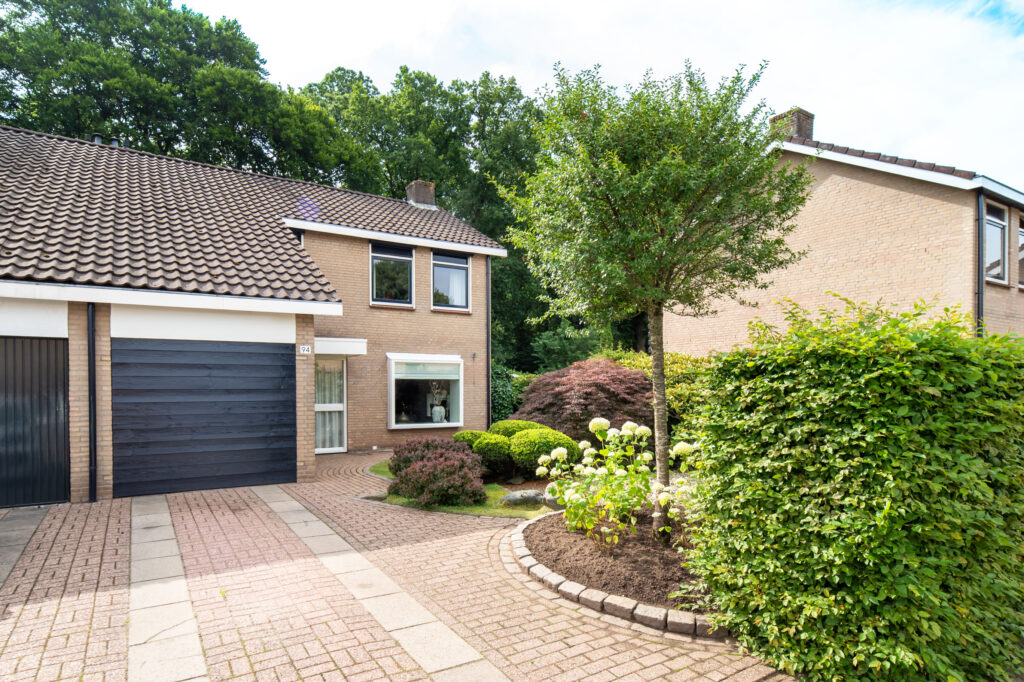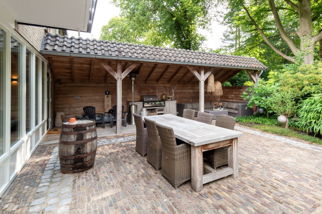 Hier beleef je het buitenleven op z’n best. De fraai aangelegde voor- en achtertuin is voorzien van diverse bomen en planten, waaronder een prachtige Japanse esdoorn, een olijf- en vijgenboom. De achtertuin biedt volledige privacy, een grote overkapping met zithoek én ruimte voor een buitenkeuken. Je wordt ‘s ochtends wakker met fluitende vogels en wandelt of fietst met je mountainbike zo het bos in. Koffie in de ochtendzon of borrelen met vrienden? Hier wil je niet meer weg.