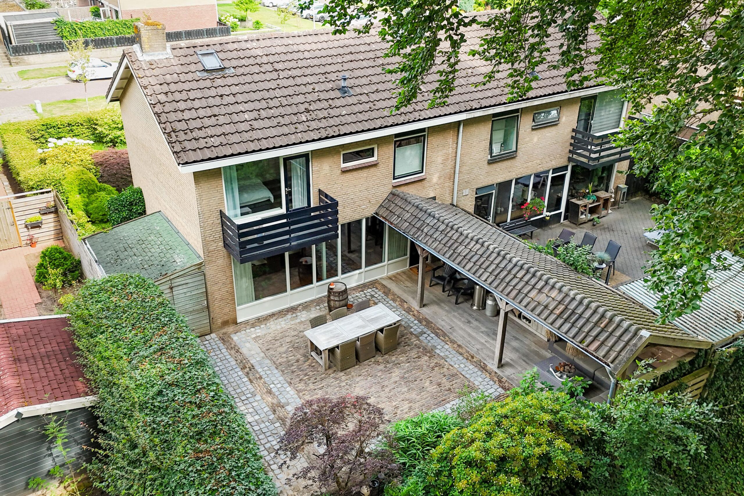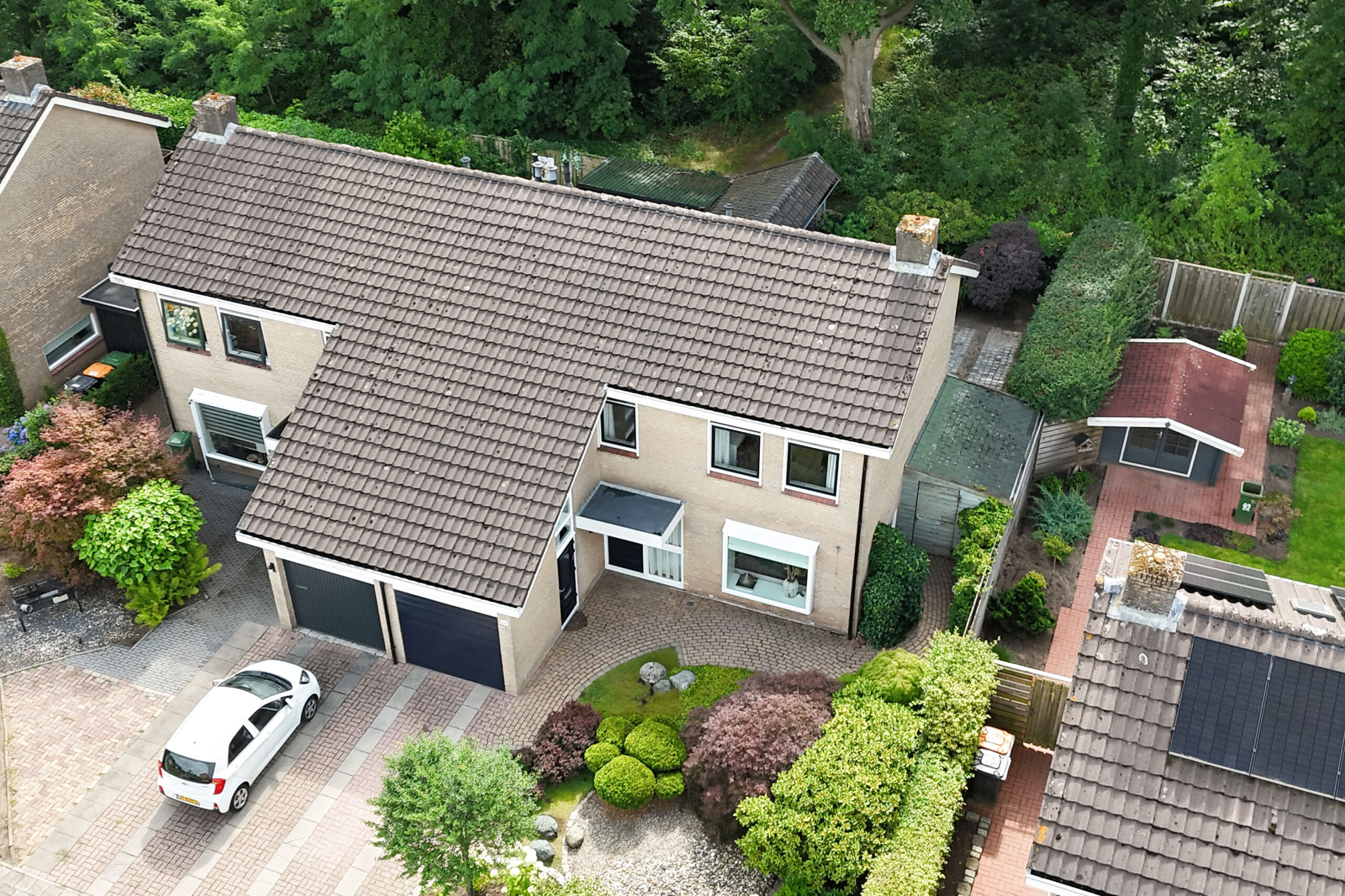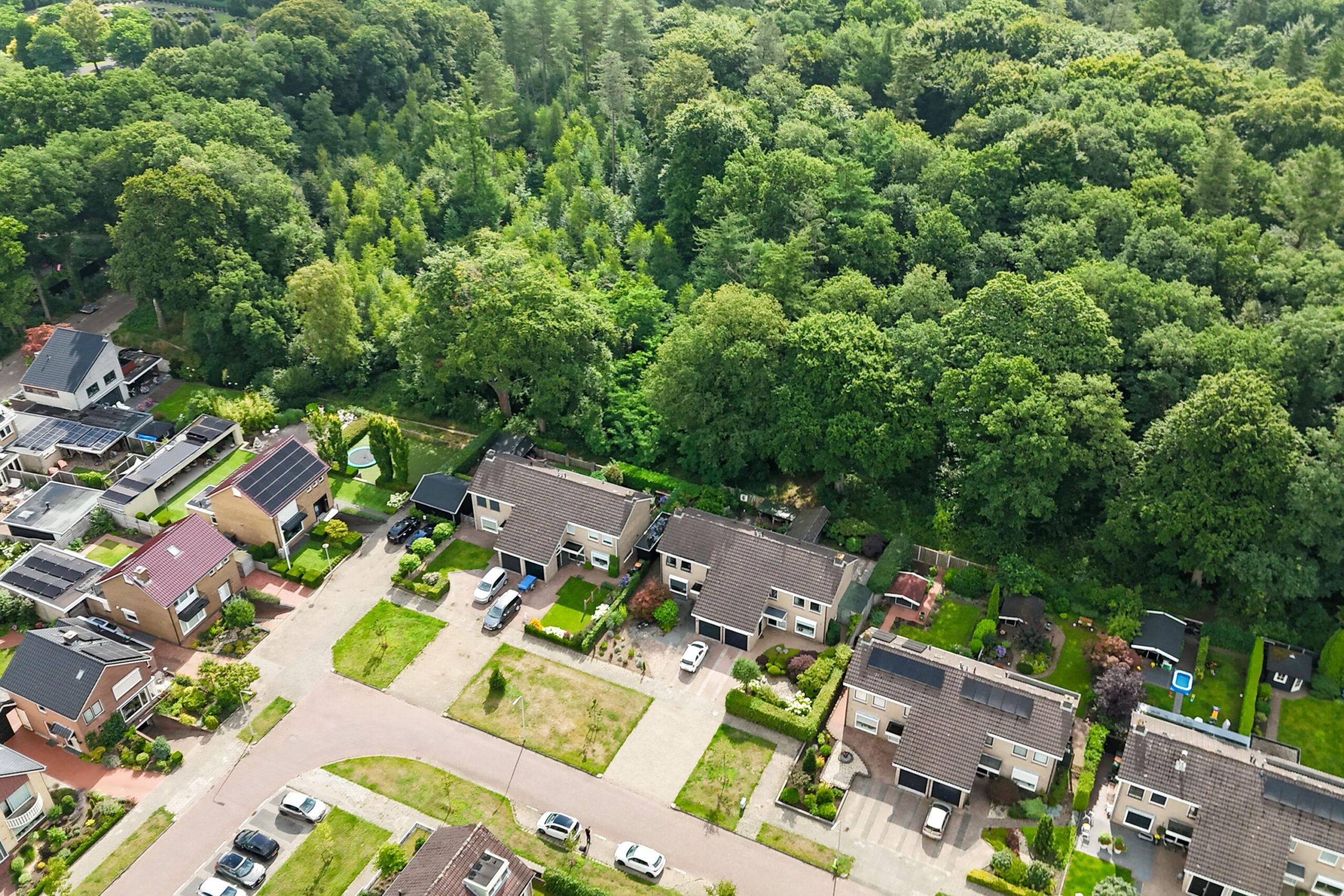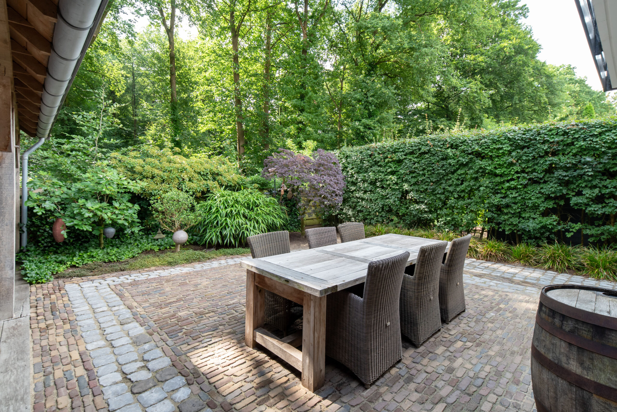 Hier beleef je het buitenleven op z’n best. De fraai aangelegde voor- en achtertuin is voorzien van diverse bomen en planten, waaronder een prachtige Japanse esdoorn, een olijf- en vijgenboom. De achtertuin biedt volledige privacy, een grote overkapping met zithoek én ruimte voor een buitenkeuken. Je wordt ‘s ochtends wakker met fluitende vogels en wandelt of fietst met je mountainbike zo het bos in. Koffie in de ochtendzon of borrelen met vrienden? Hier wil je niet meer weg.