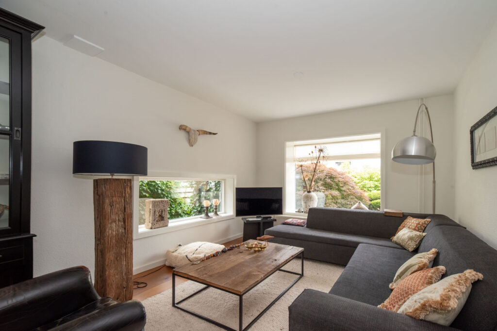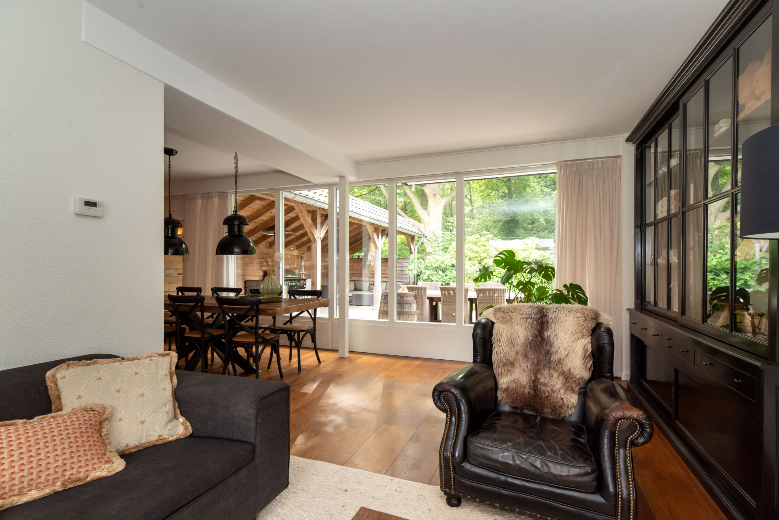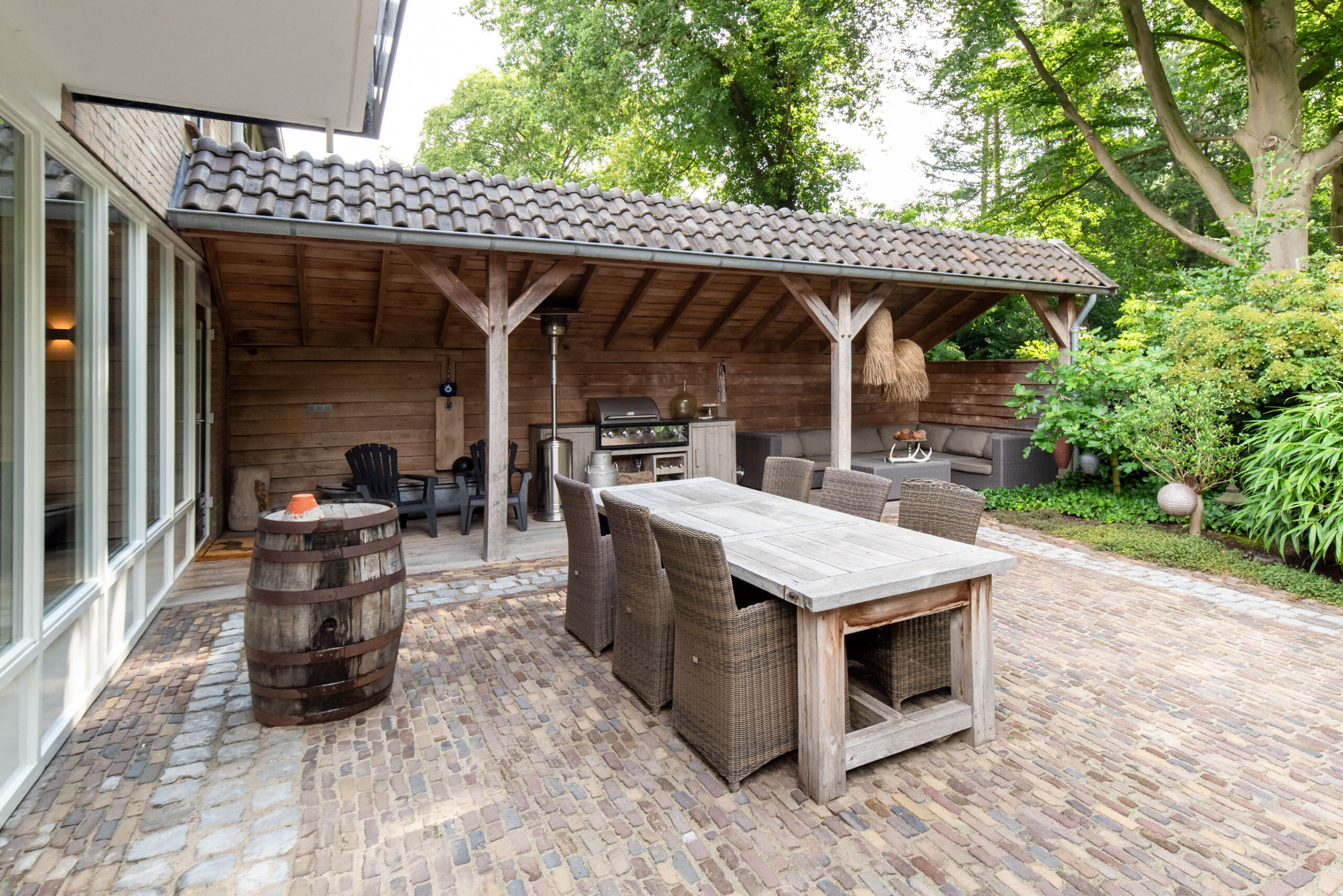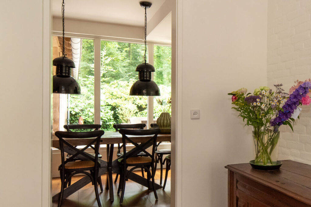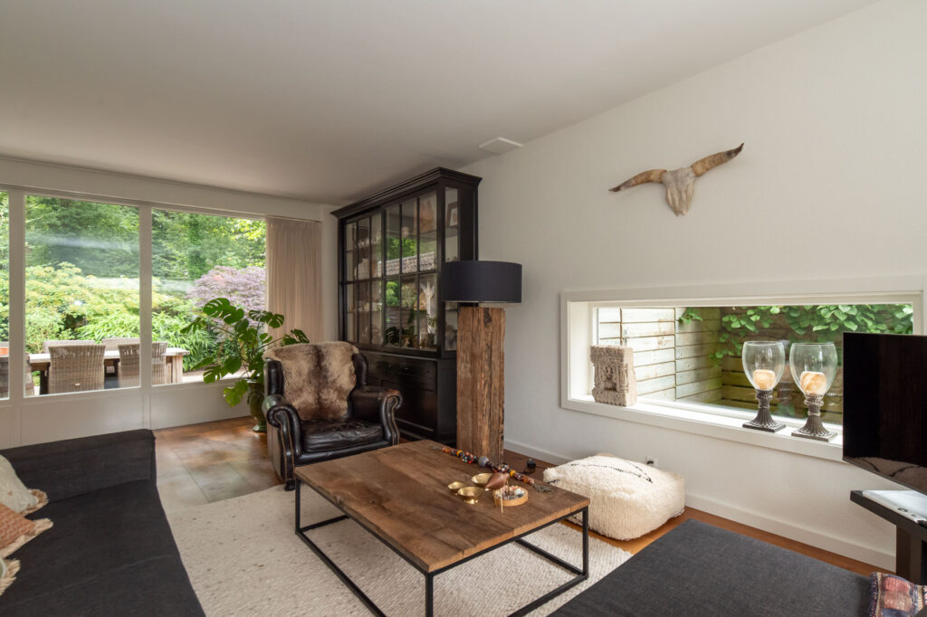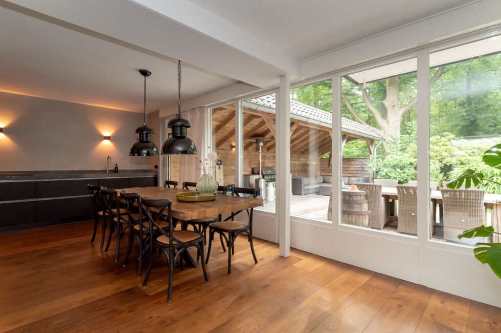 Grote raampartijen zorgen voor een schitterend uitzicht op het groen. De deur verbindt de woonkeuken met de overkapping aan het bos, een privéplek waar je je waant in een vrijstaande woning.