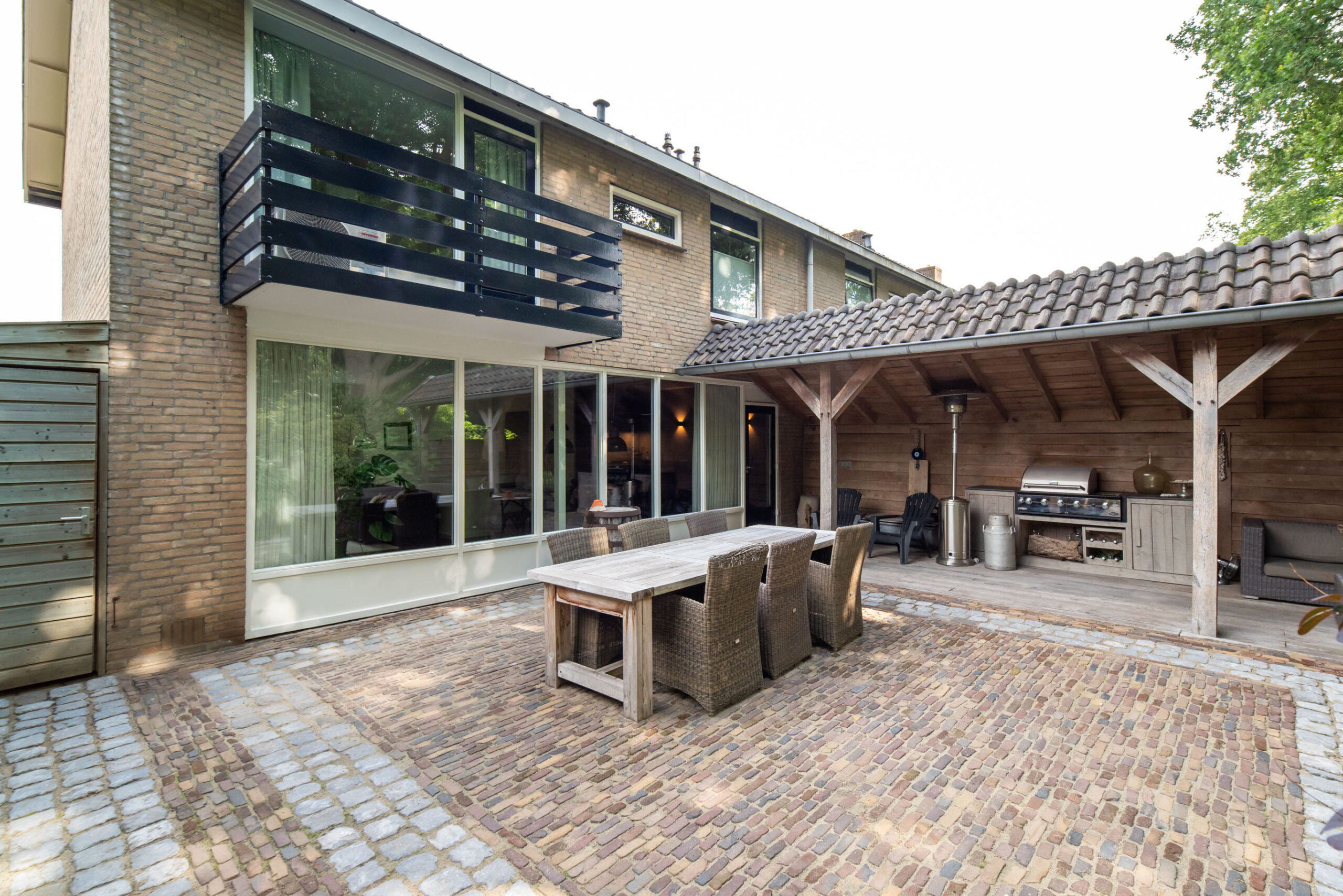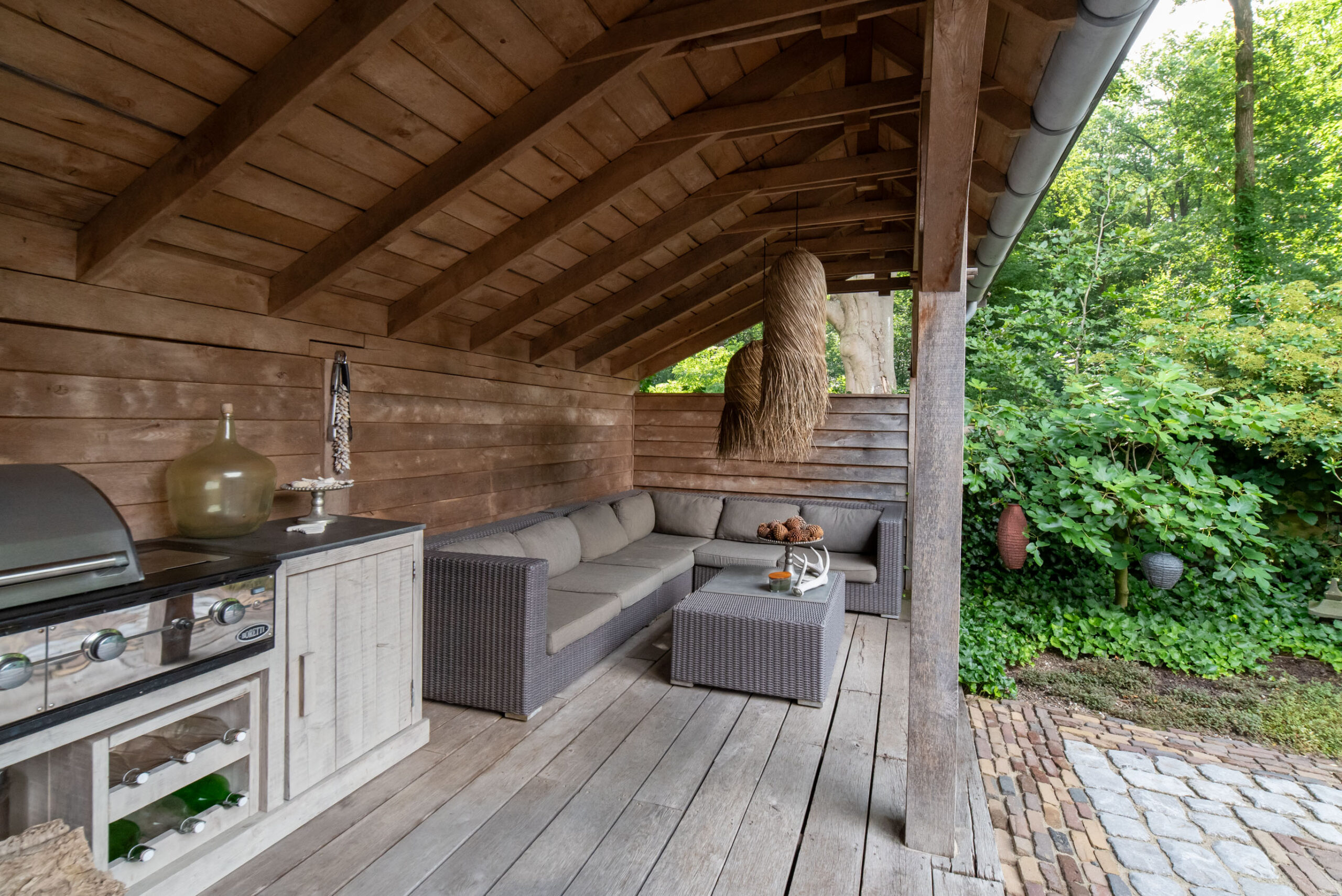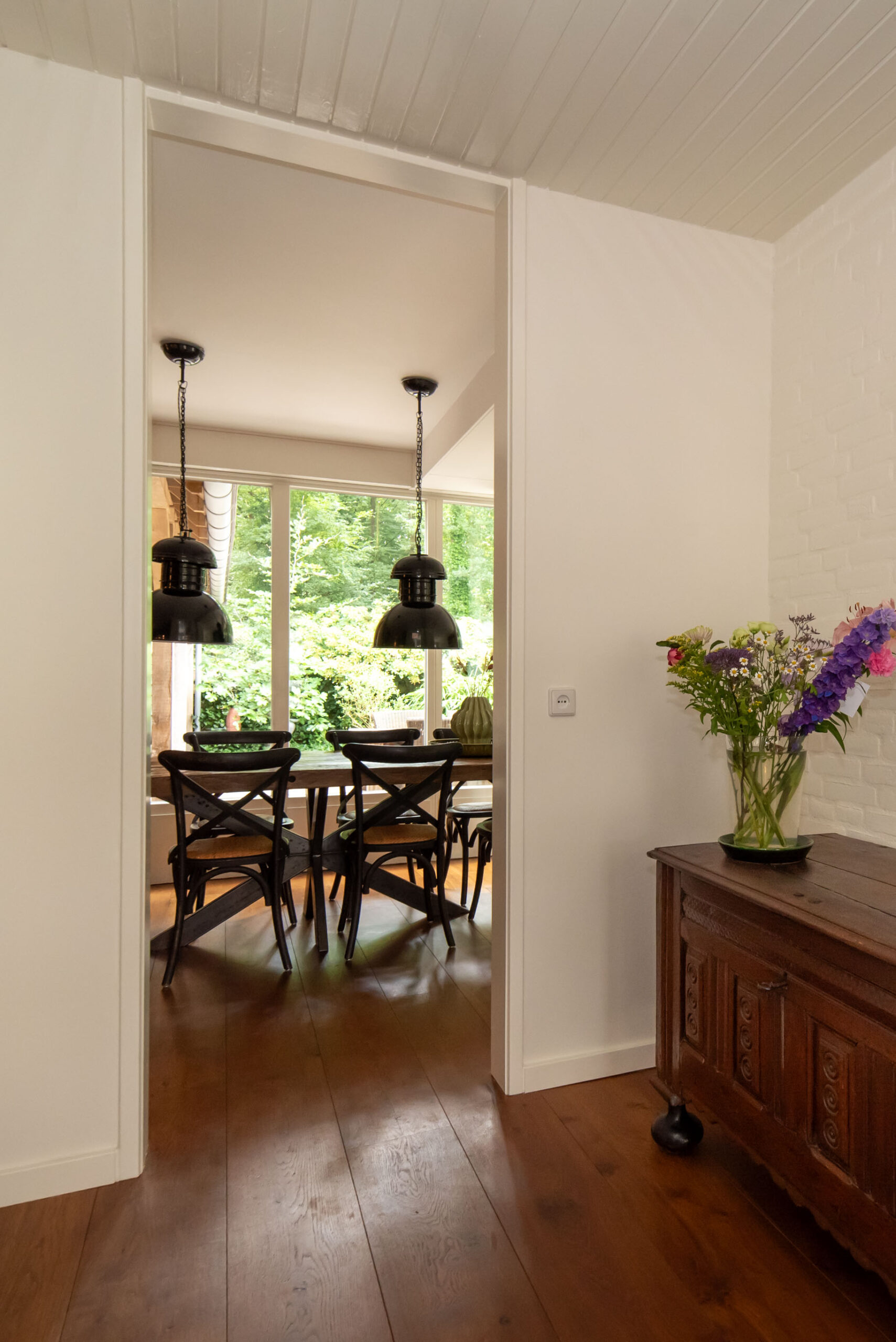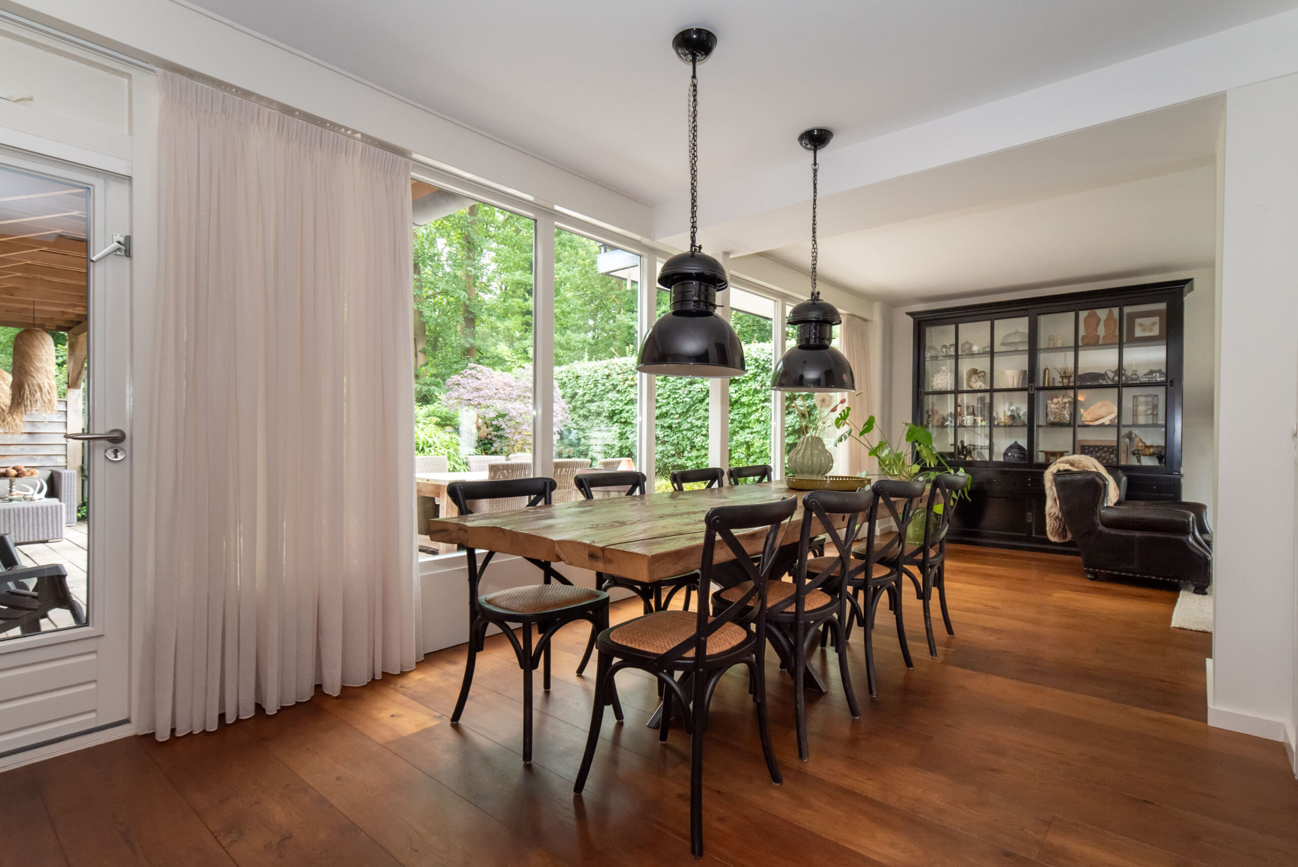 Grote raampartijen zorgen voor een schitterend uitzicht op het groen. De deur verbindt de woonkeuken met de overkapping aan het bos, een privéplek waar je je waant in een vrijstaande woning.