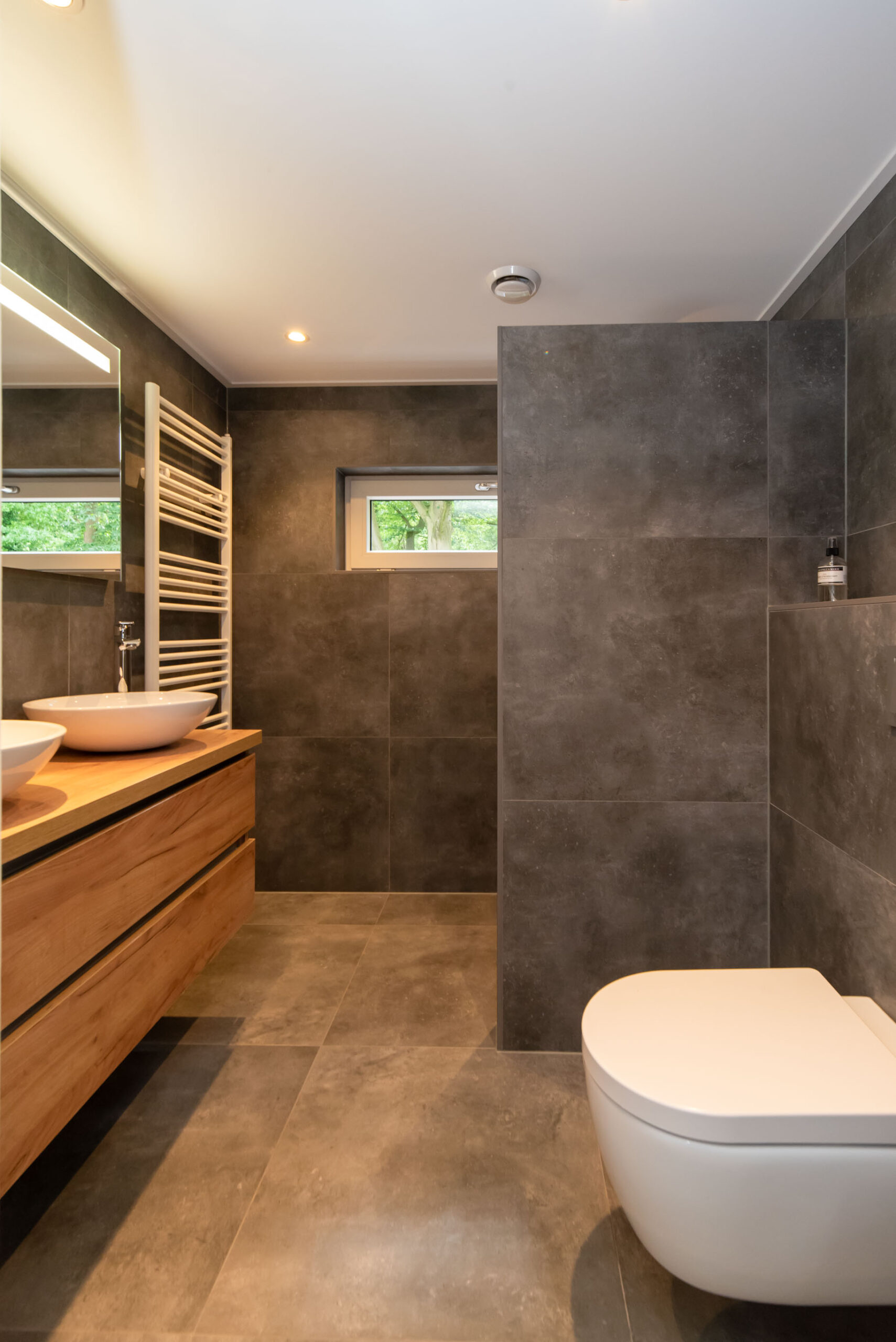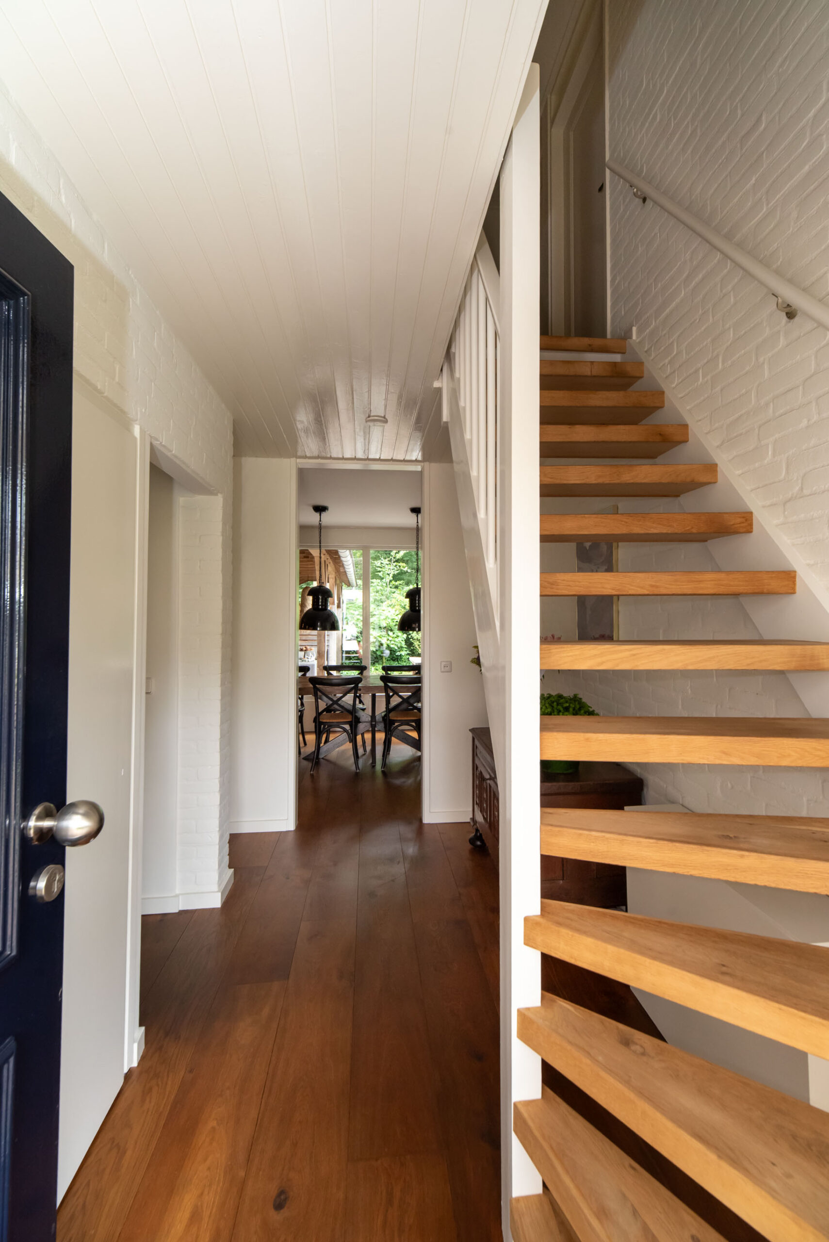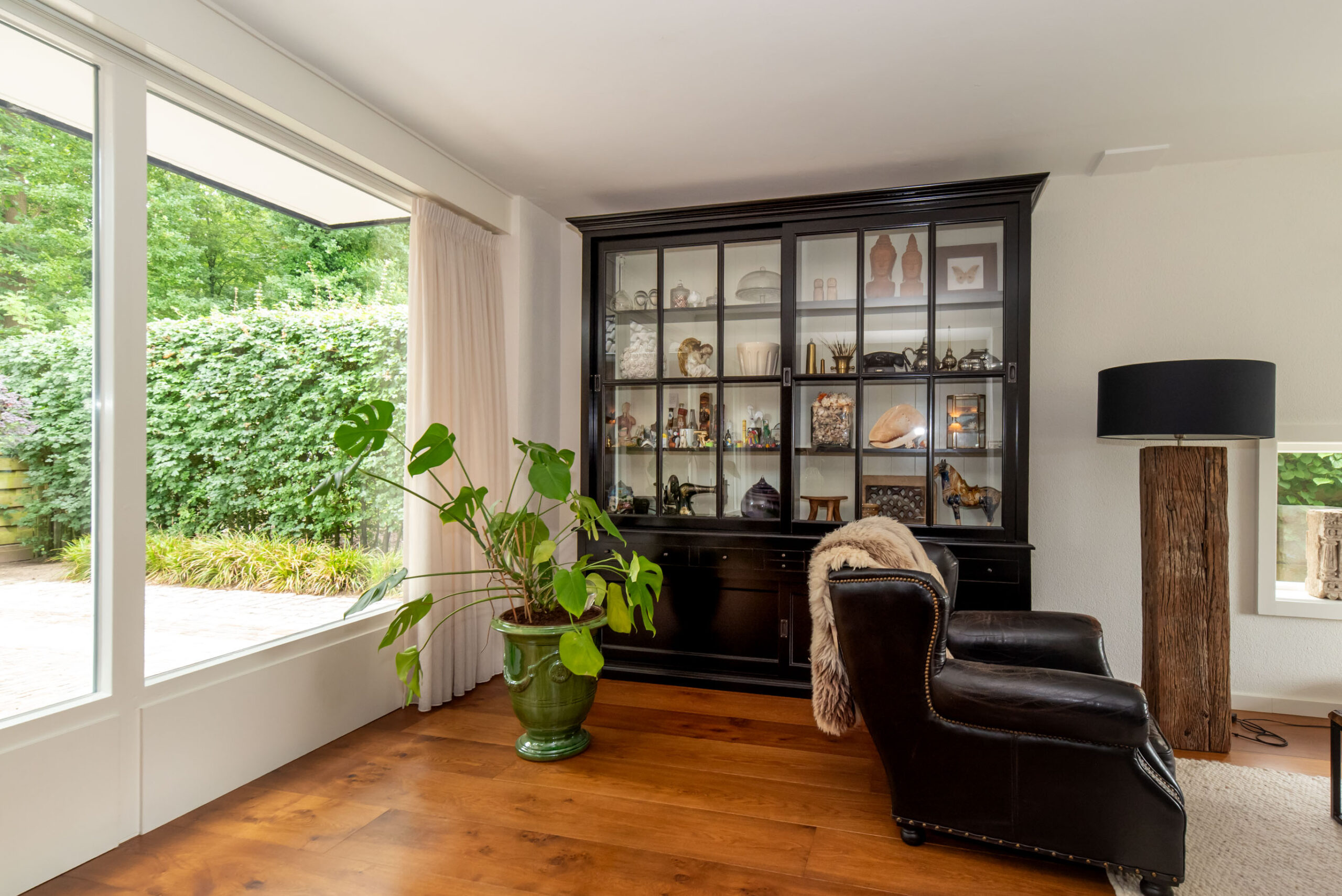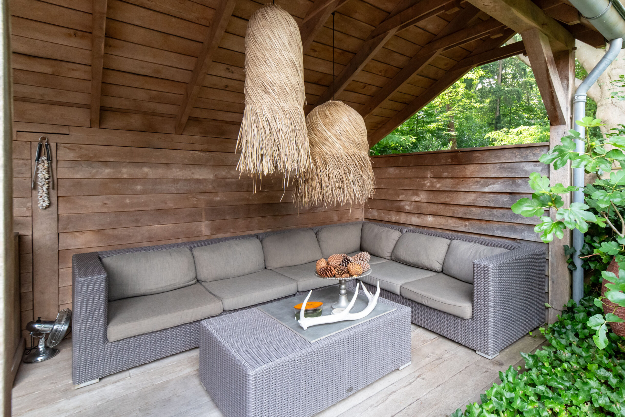 Grote raampartijen zorgen voor een schitterend uitzicht op het groen. De deur verbindt de woonkeuken met de overkapping aan het bos, een privéplek waar je je waant in een vrijstaande woning.