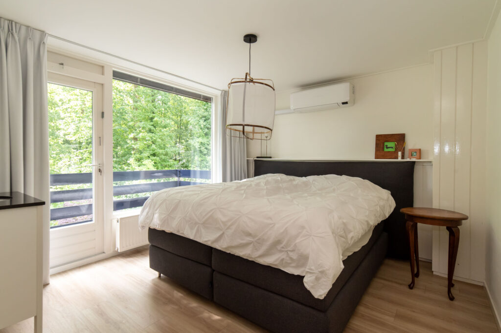 Op de bovenverdieping vind je vier ruime slaapkamers, waaronder eentje met een balkon, airco en een wastafel. De kamers aan de voorzijde zijn voorzien van mechanische rolluiken. De gehele verdieping heeft een moderne pvc-vloer die zorgt voor een strakke uitstraling. De luxe badkamer (2021) is uitgerust met een dubbele wastafel, toilet, inloopdouche en mechanische afzuiging. Tijdens het douchen heb je een prachtig uitzicht op het bos waar je kans hebt een ree te spotten.