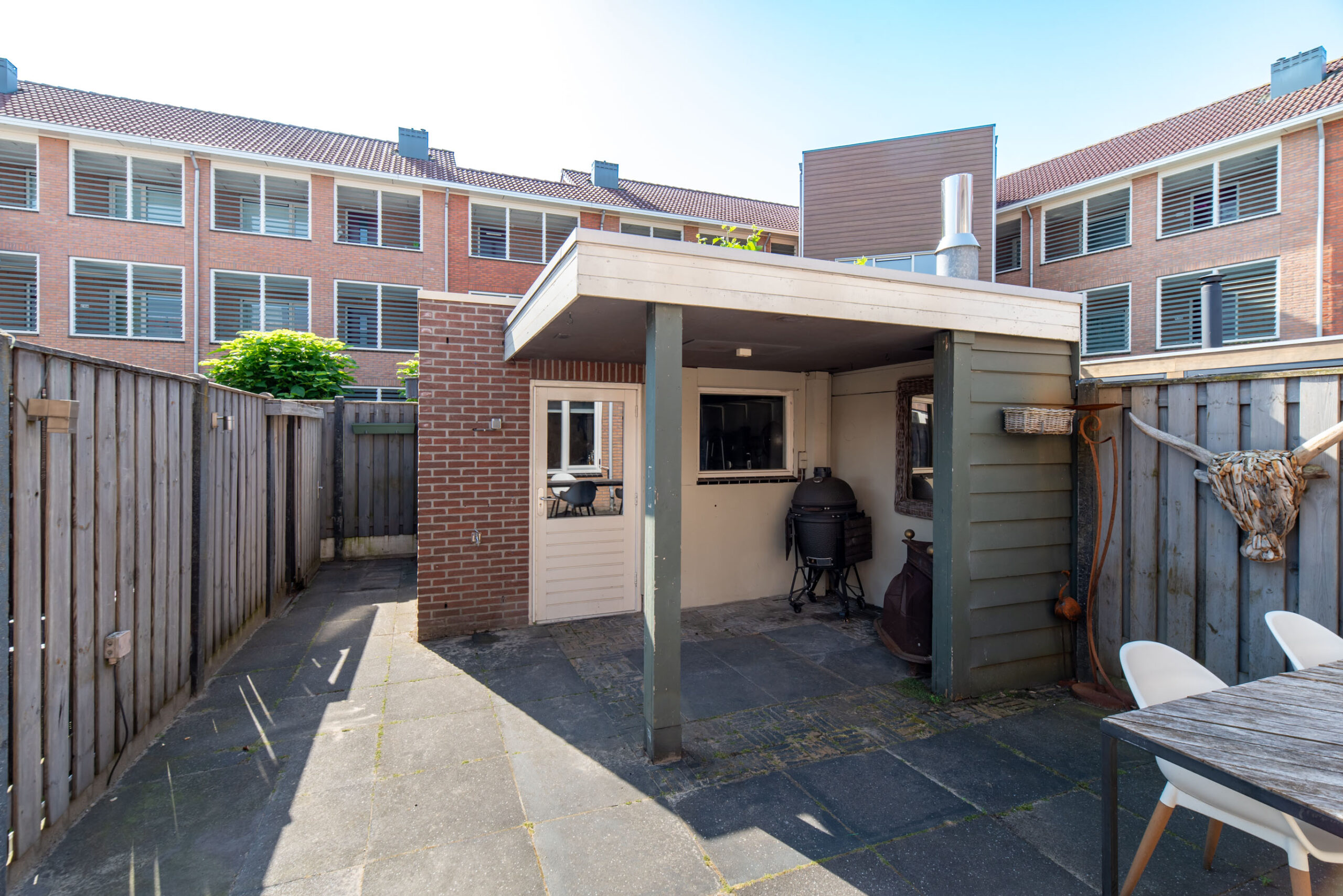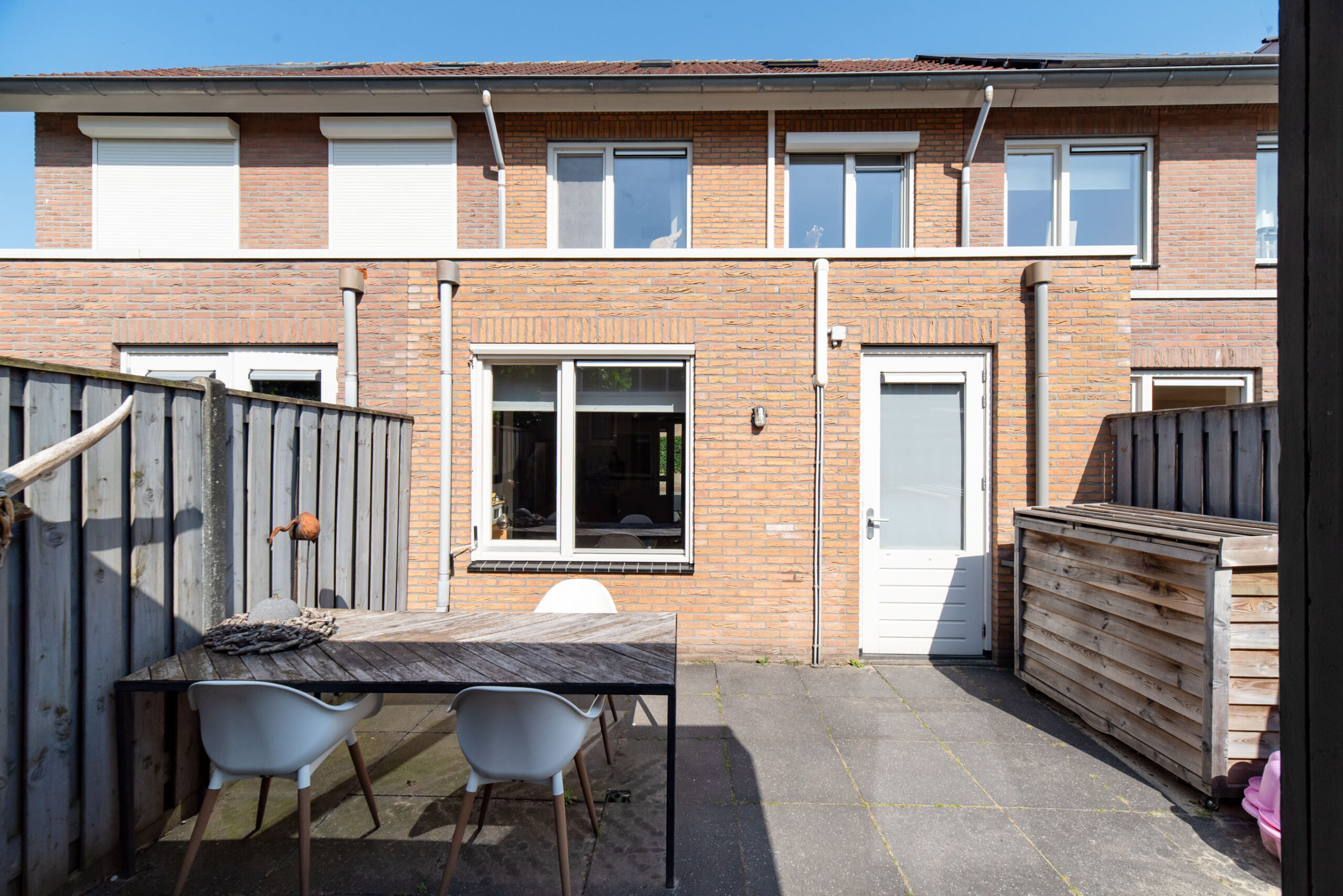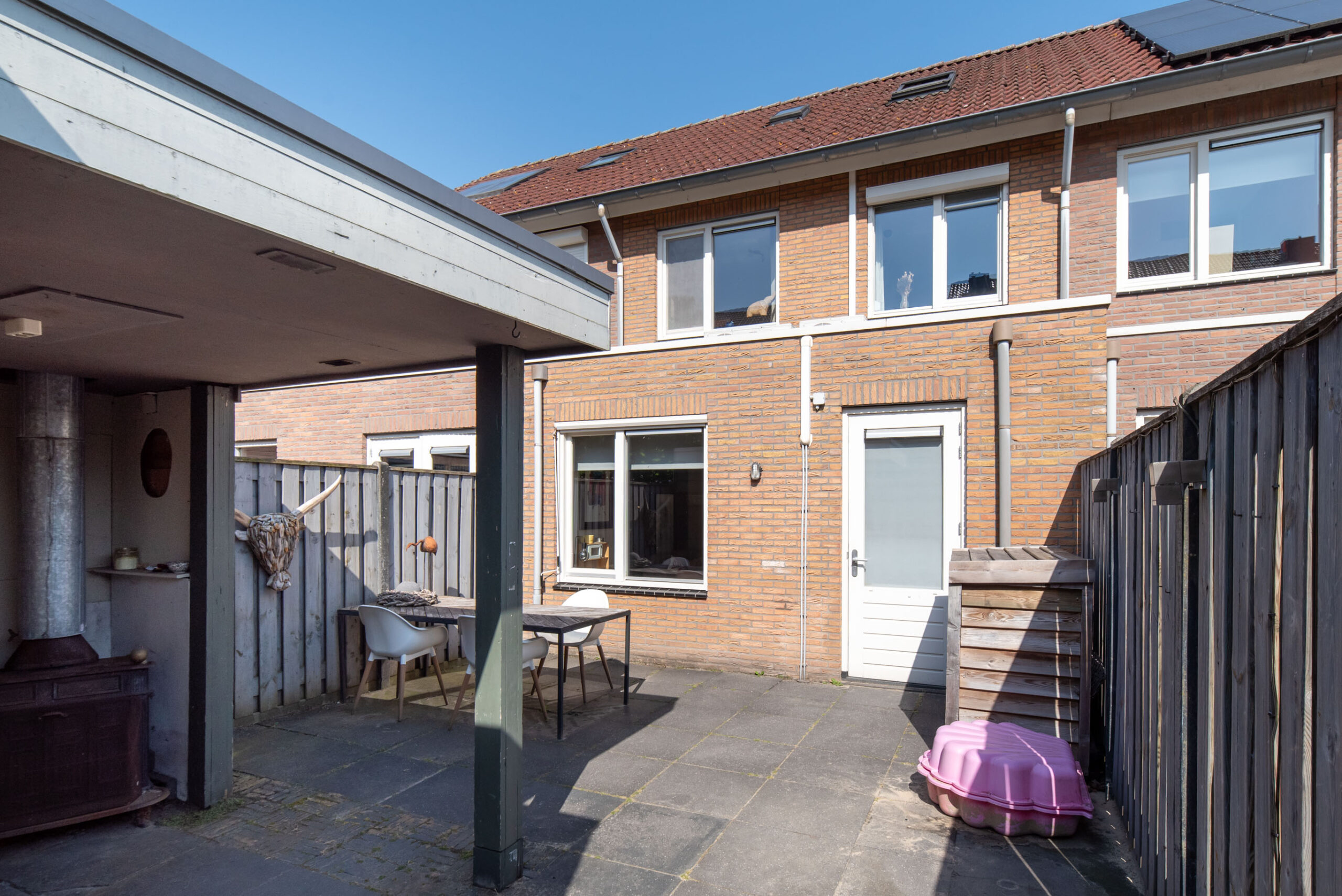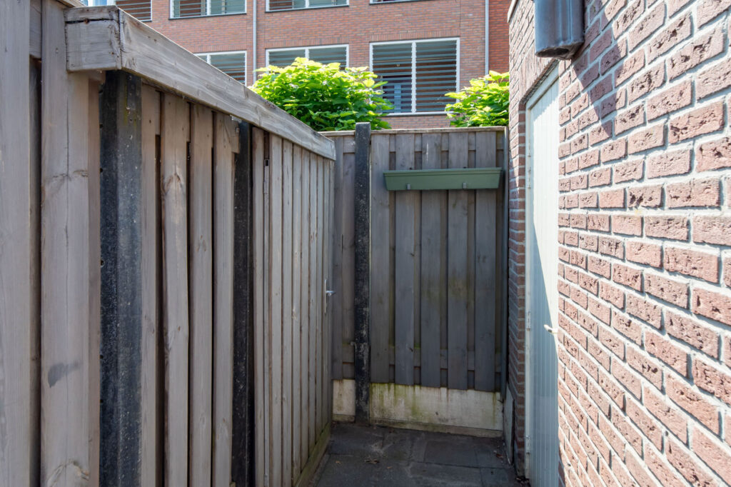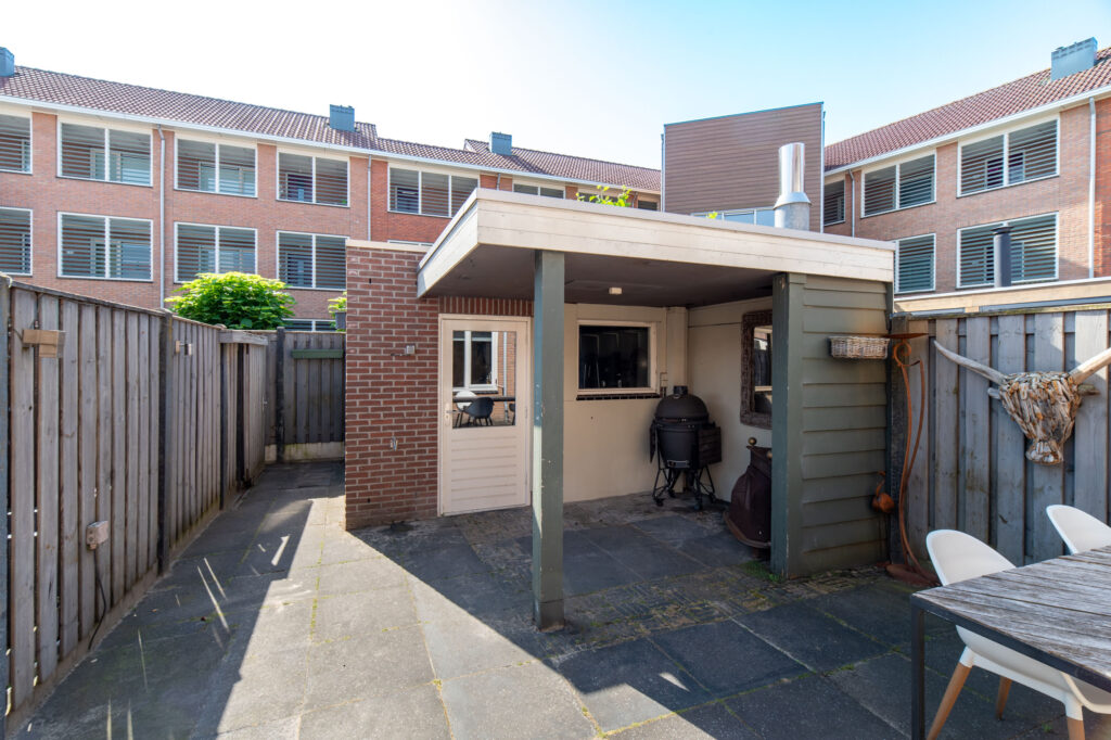 De tuin is onderhoudsvriendelijk en is voorzien van een berging met overkapping.