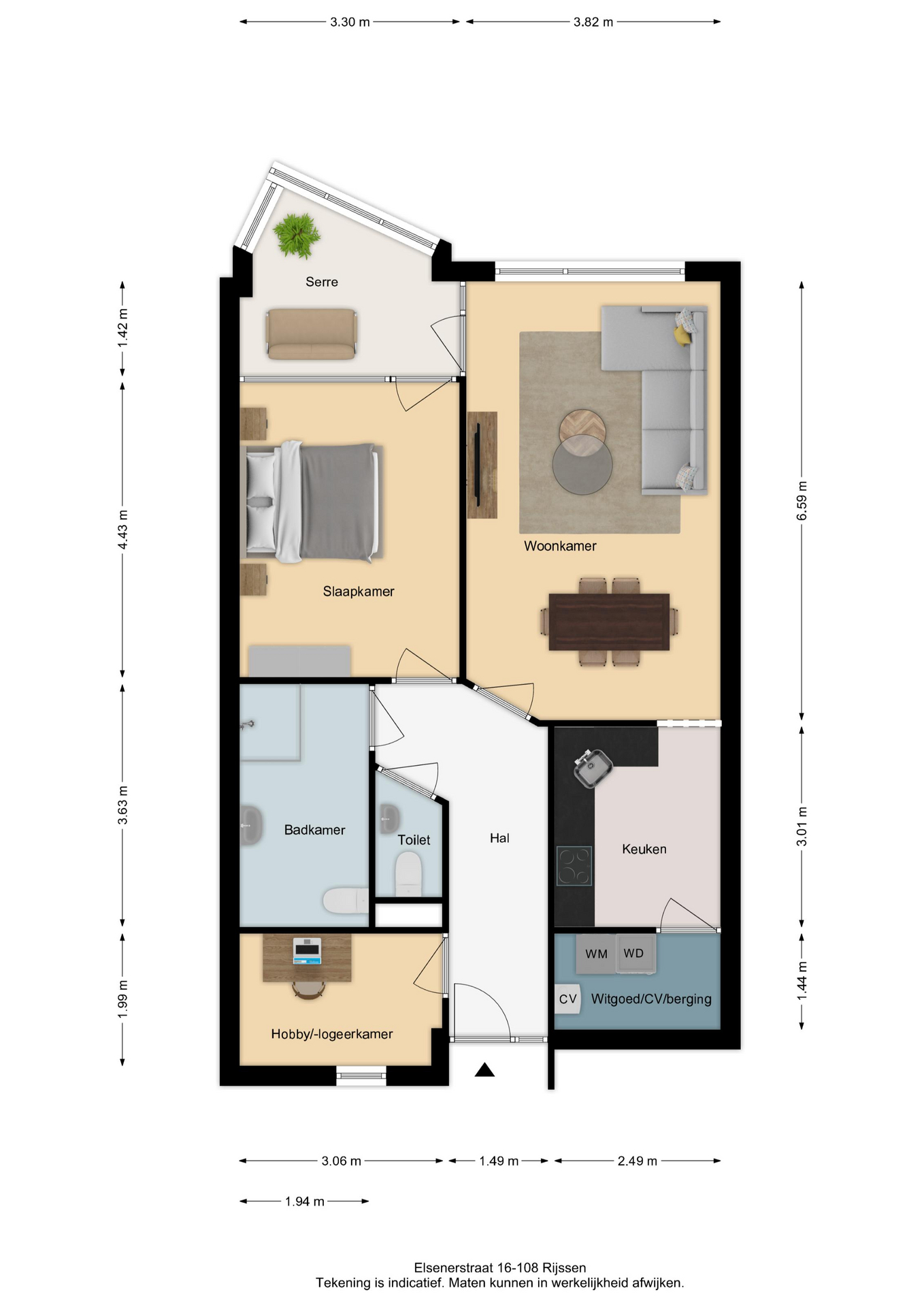 Vermelde maatvoeringen en gepubliceerde plattegronden zijn opgesteld binnen de kaders van de Branche Brede Meetinstructie; gebaseerd op NEN2580, met een onderverdeling in verschillende gebruiksoppervlakten. Omdat de publicatie ingevoerde gegevens via diverse, externe kanalen geschiedt, kan Daan Makelaars BV geen aansprakelijkheid aanvaarden voor onjuiste weergave van informatie.