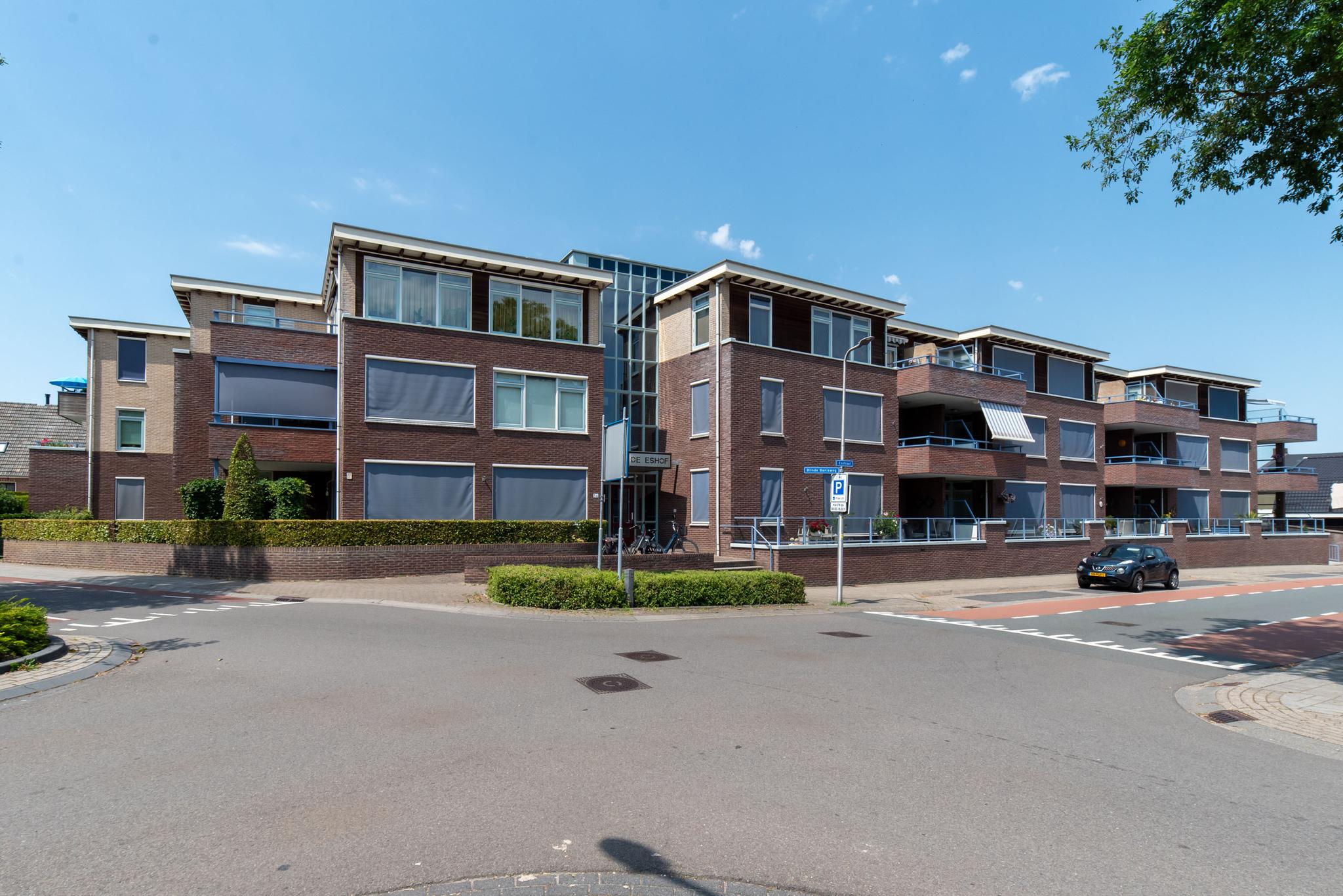 Middels de trap of lift bereik je de eerste verdieping van het appartementencomplex “de Eshof”. Via de galerij, met uitzicht op de prachtige groene binnentuin, kom je bij de voordeur van het appartement en stap je de hal binnen. Via deze hal zijn beide slaapkamers met vaste kasten, het aparte toilet, de wasruimte/berging, badkamer en de woonkamer te bereiken. De woonkamer geeft ruimte voor een aparte eetruimte en zithoek. Via de deur in de woonkamer kom je op het balkon terecht, dit royale balkon heeft ruimte voor een zithoek en je kijkt hier vrij uit over de Blinde Banisweg. Via de woonkamer kom je in de keuken terecht, deze keuken is voorzien van inbouwapparatuur zoals een koelkast, gaskookplaat en oven. De badkamer van het appartement is voorzien van een badmeubel met spiegel en wastafel, toilet en twee douches.