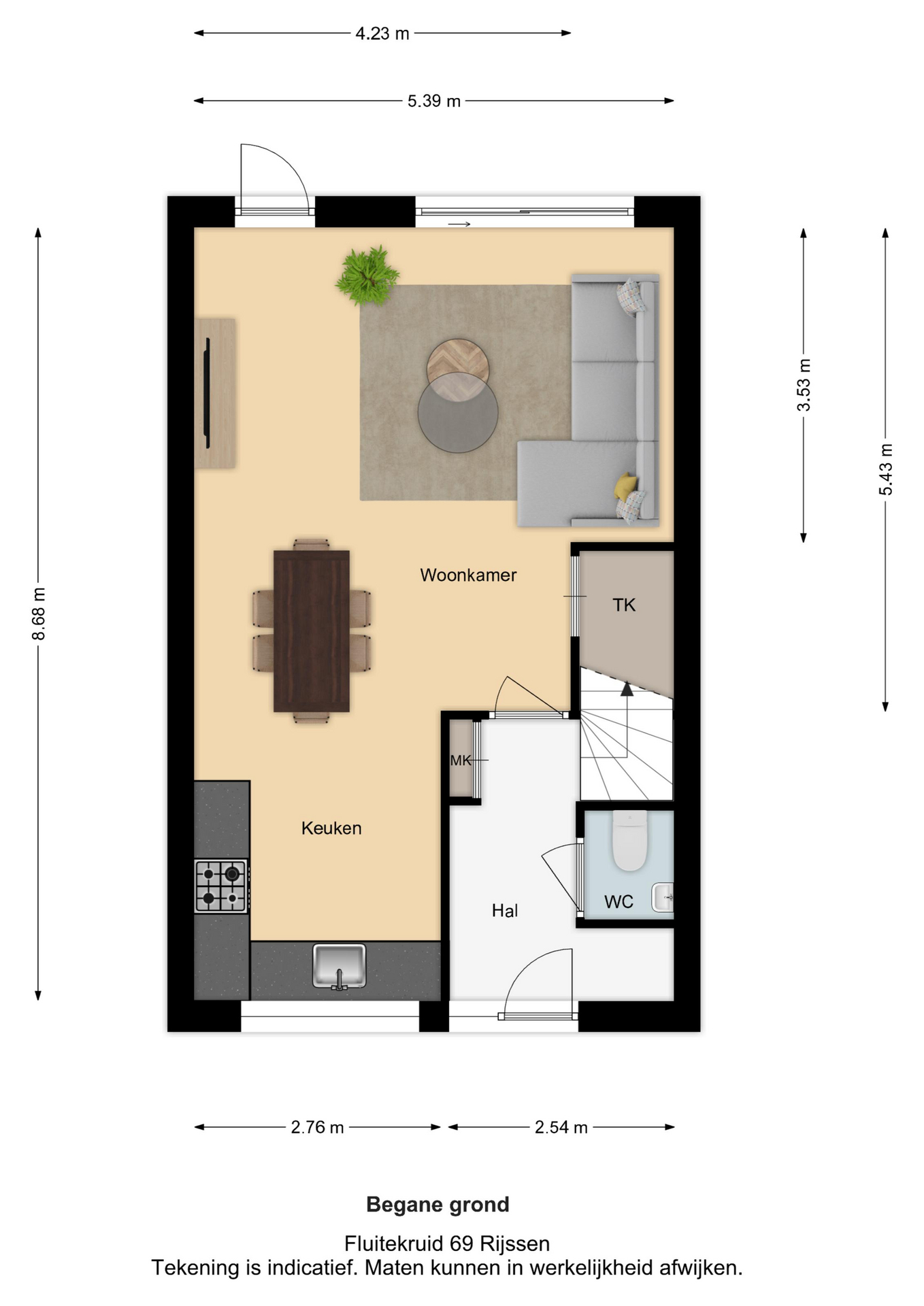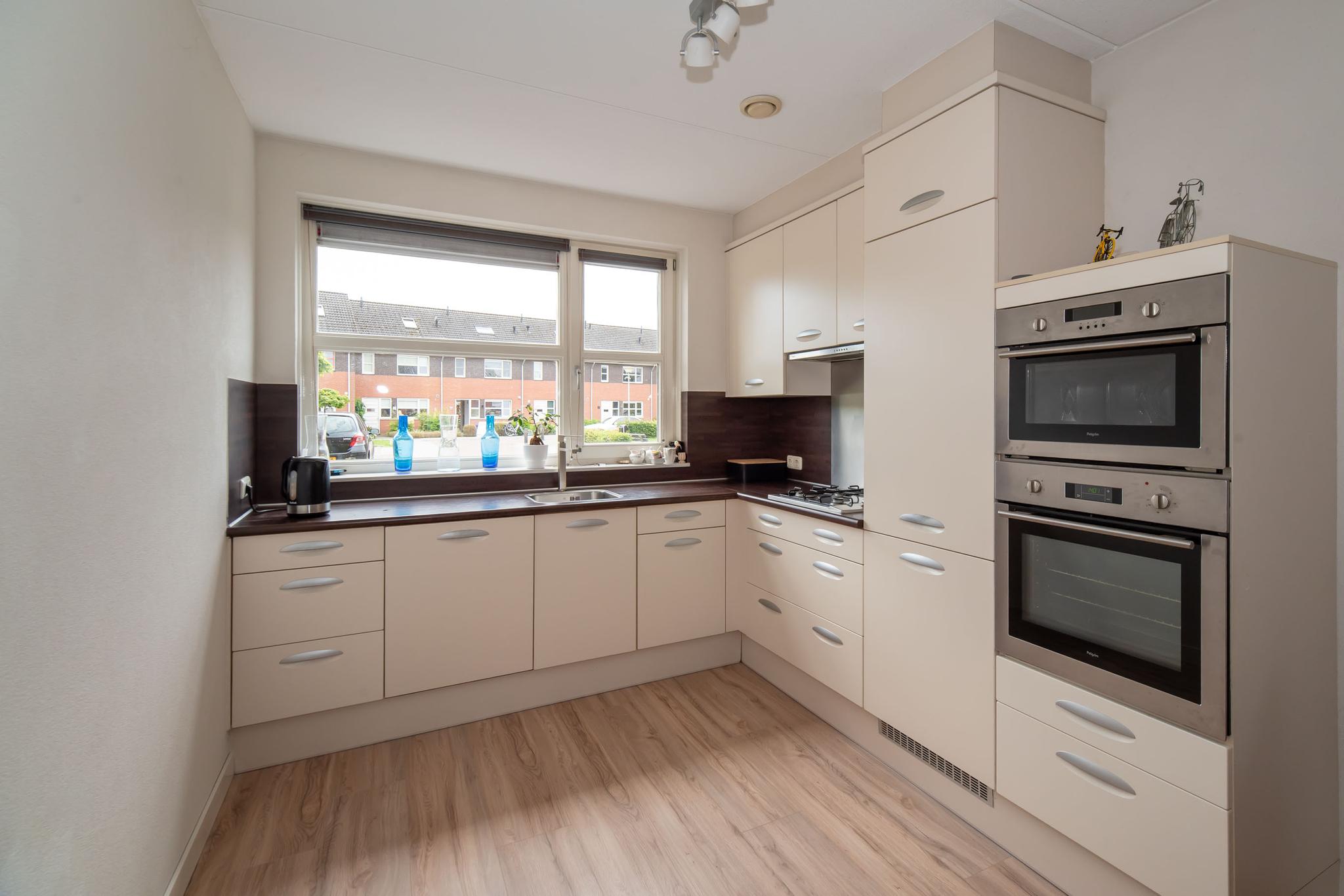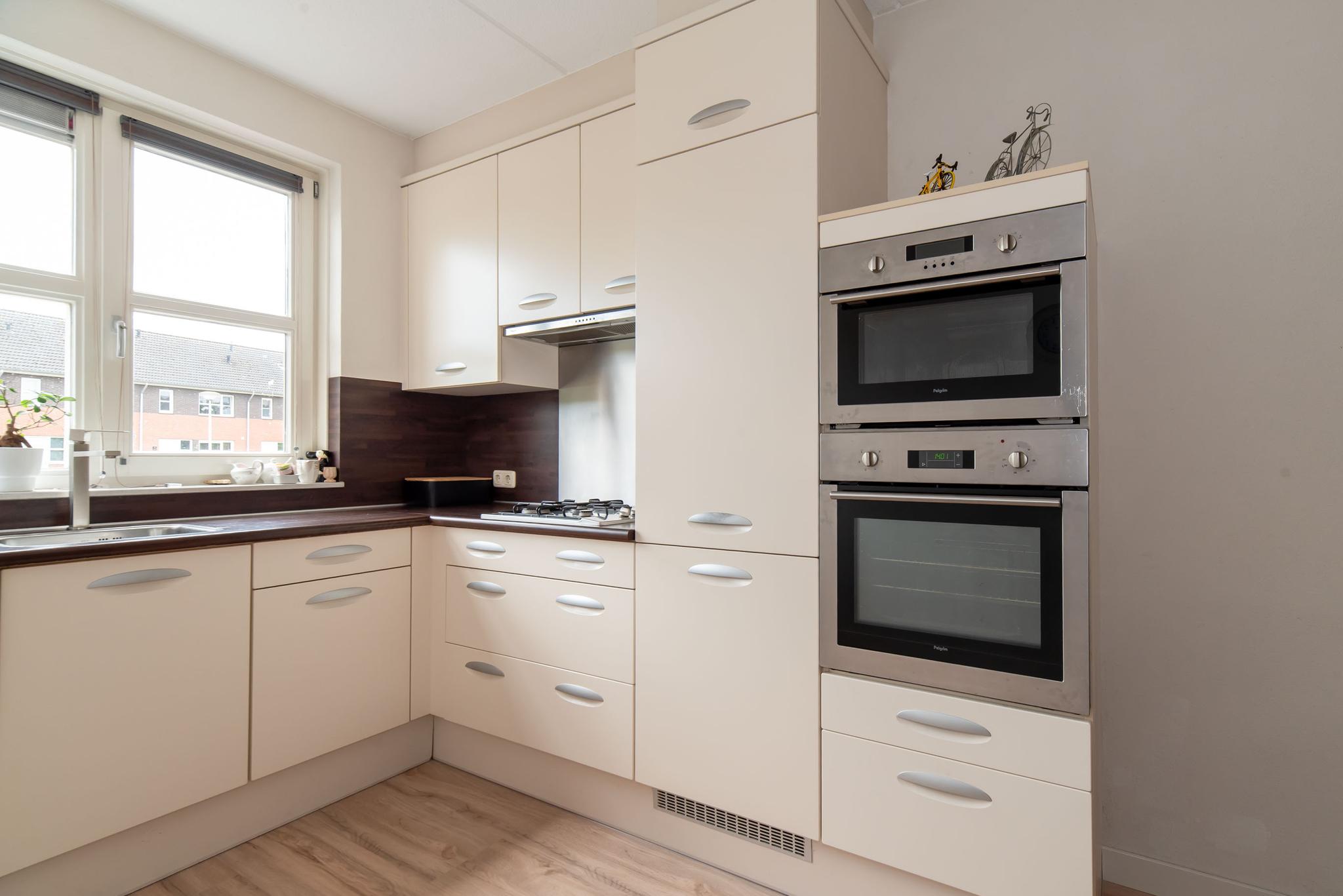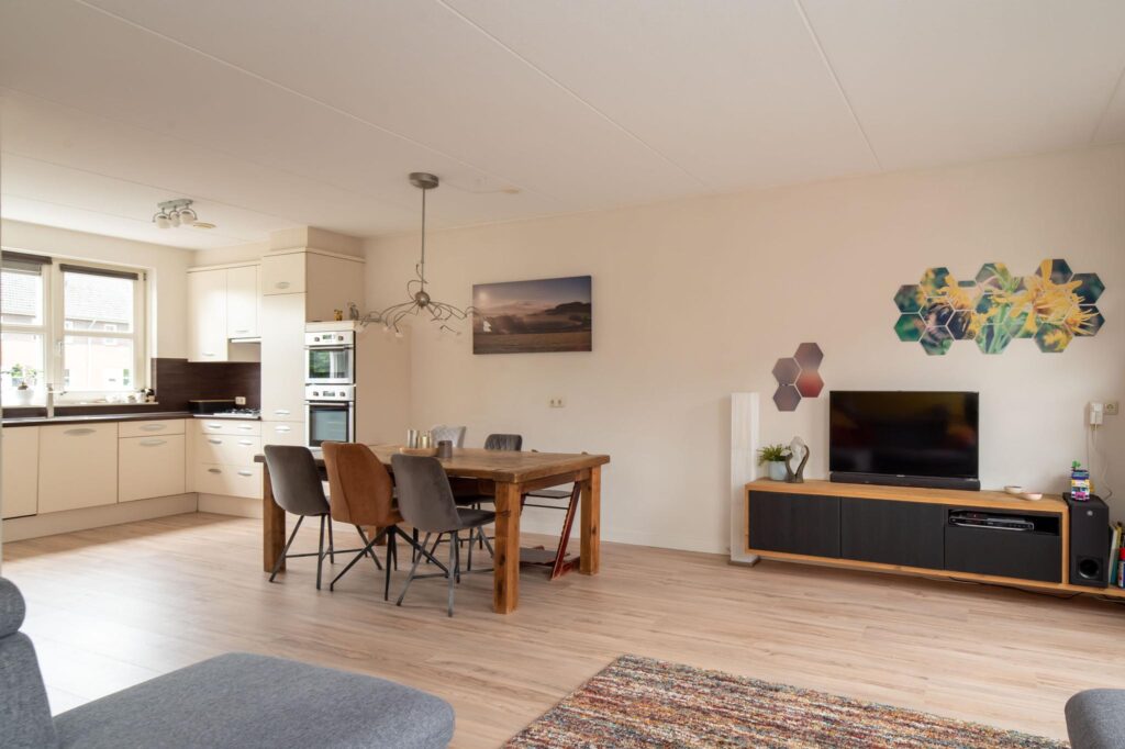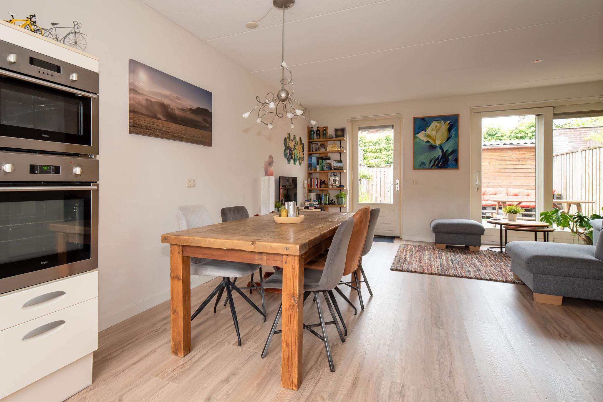 Bij binnenkomst in de hal vind je de trap naar de eerste verdieping, het toilet, de meterkast en deur naar de woonkamer. De woonkamer is ruim opgezet met veel natuurlijk lichtinval door de schuifdeuren die toegang geven tot de tuin. In de woonkamer bevindt zich tevens een praktische opbergkast. Vanuit de woonkamer is de open keuken bereikbaar, die voorzien is van alle benodigde inbouwapparatuur, zoals een oven, magnetron, vaatwassen en kookplaat.