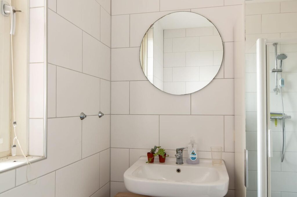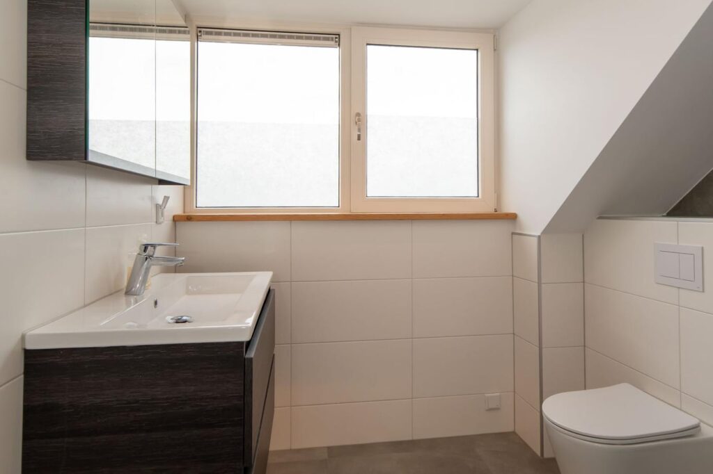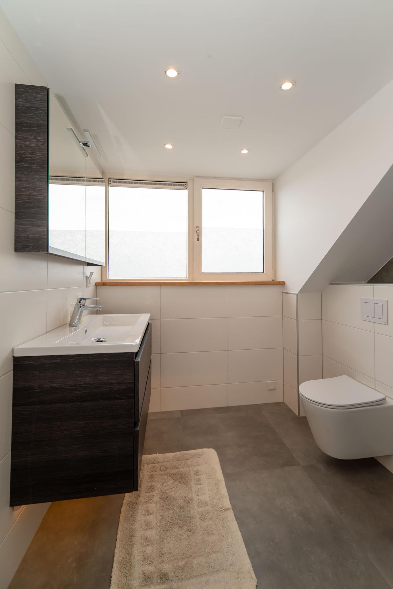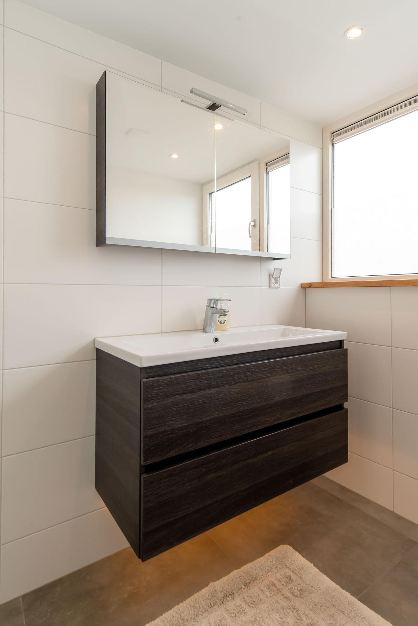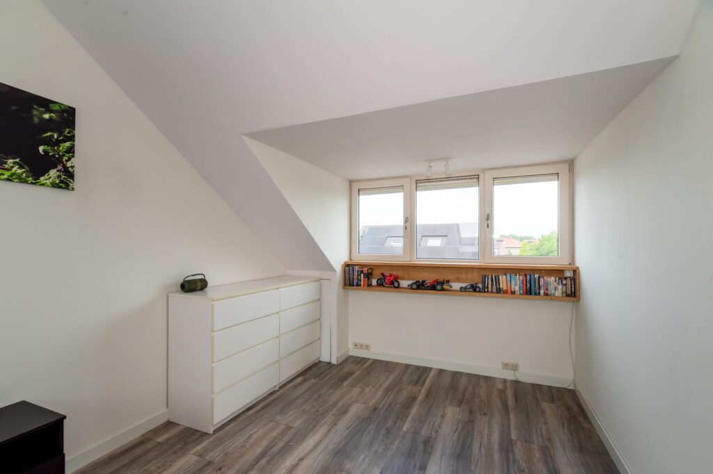 Op de eerste verdieping vinden we drie ruime slaapkamers, die allen voorzien zijn van draaikiepramen met rolluiken, en een badkamer met toilet, wastafel en douche.