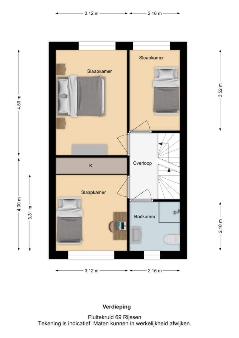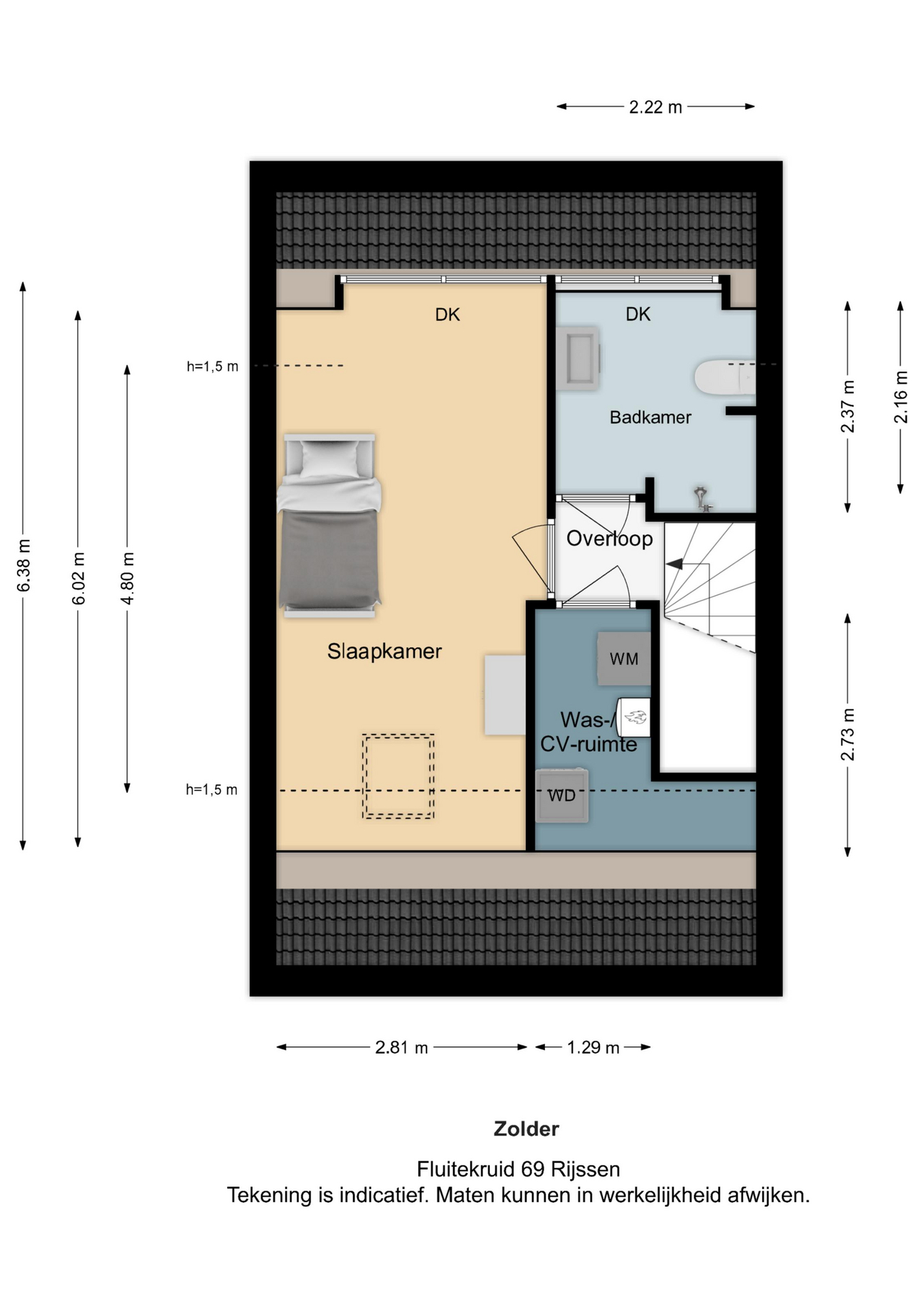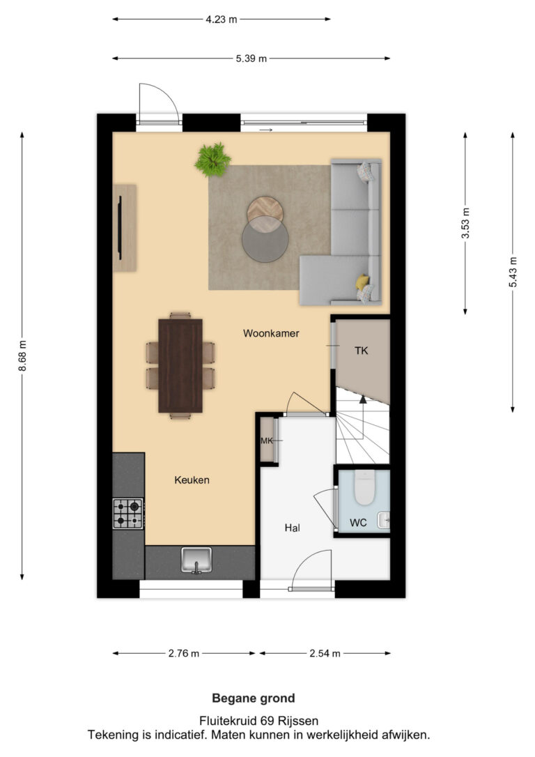 Vermelde maatvoeringen en gepubliceerde plattegronden zijn opgesteld binnen de kaders van de Branche Brede Meetinstructie; gebaseerd op NEN2580, met een onderverdeling in verschillende gebruiksoppervlakten. Omdat de publicatie ingevoerde gegevens via diverse, externe kanalen geschiedt, kan Daan Makelaars BV geen aansprakelijkheid aanvaarden voor onjuiste weergave van informatie.