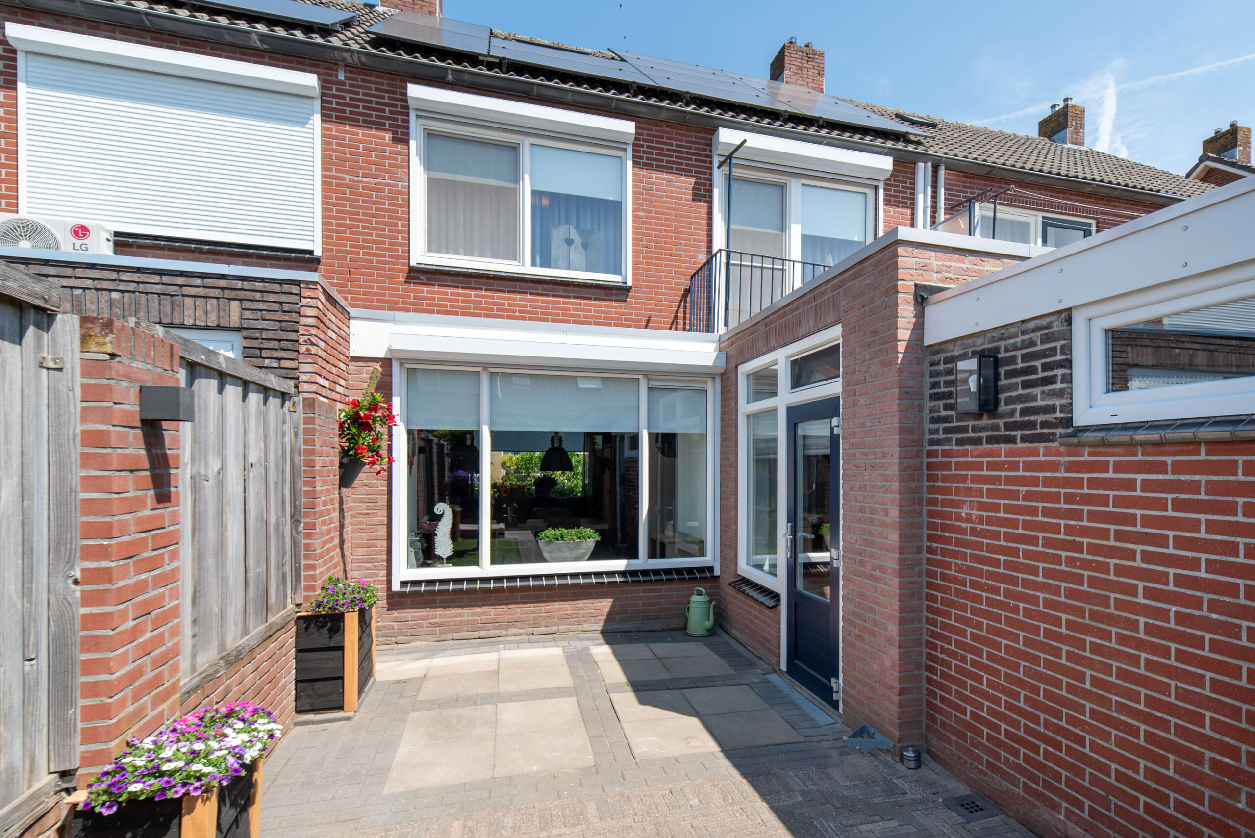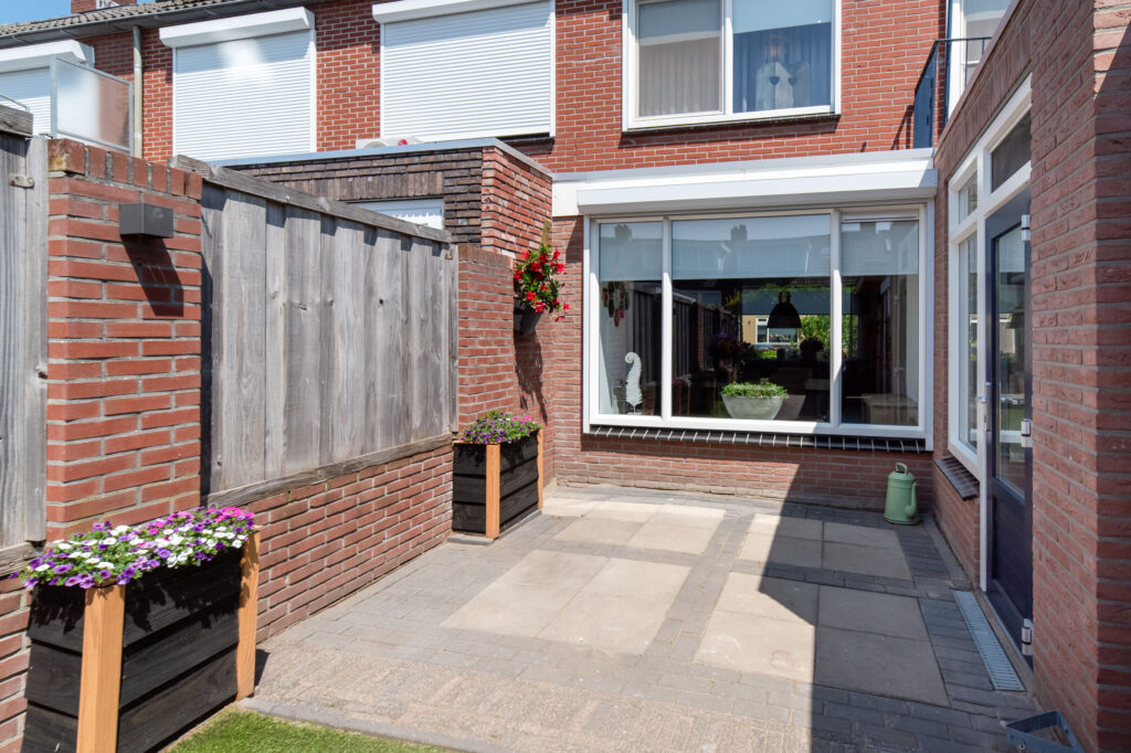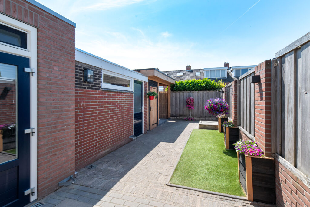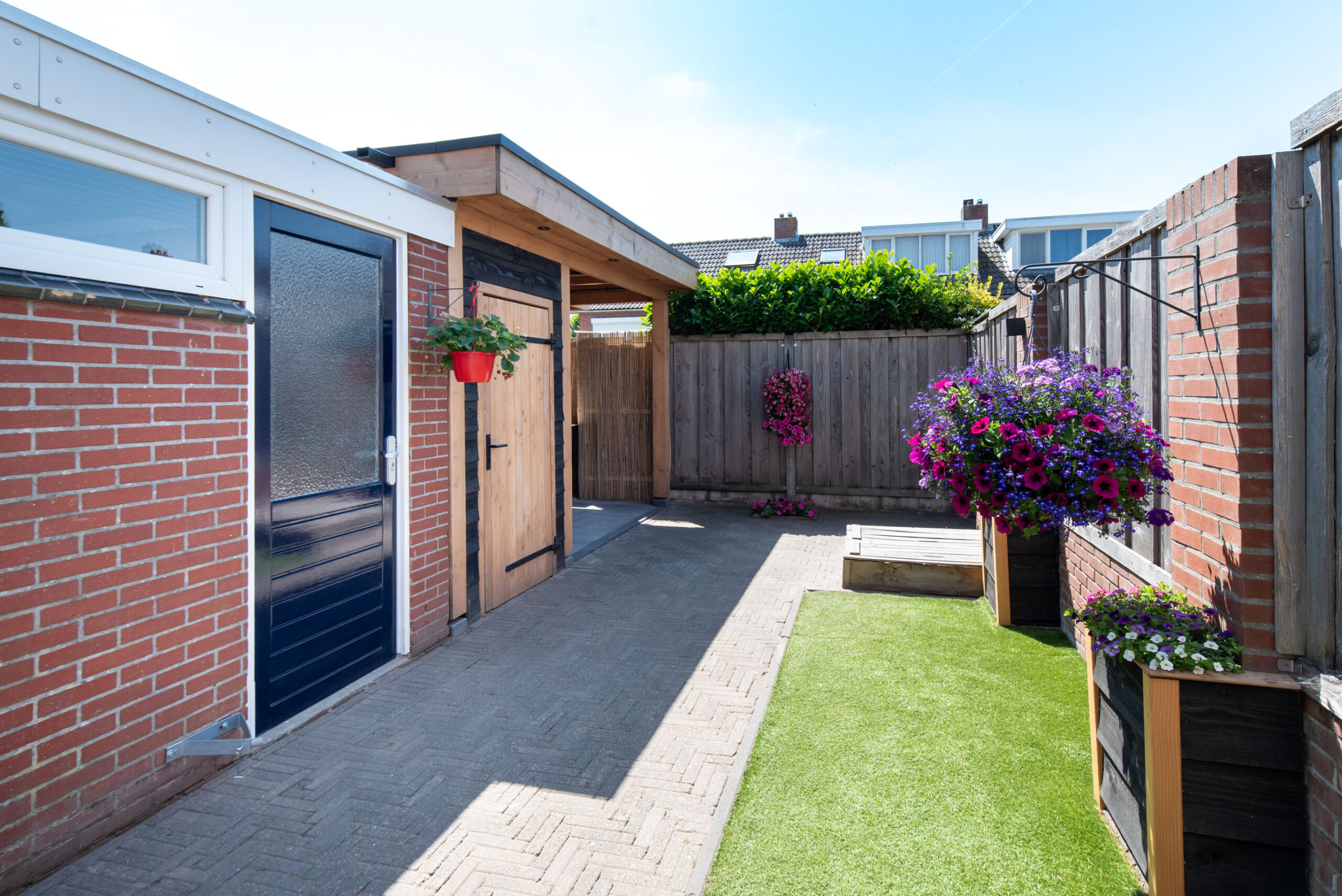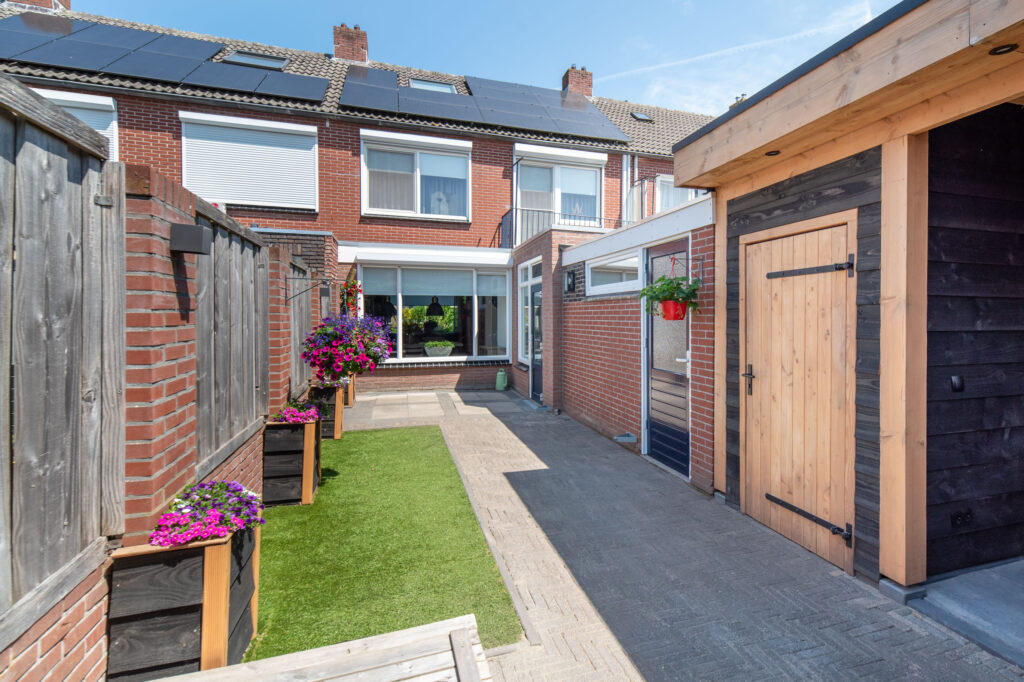 De onderhoudsvriendelijke achtertuin is netjes aangelegd met een kunstgrasmat, betegeld looppad, dubbele berging en een gezellige overkapping, perfect om in elk seizoen van het buitenleven te genieten.