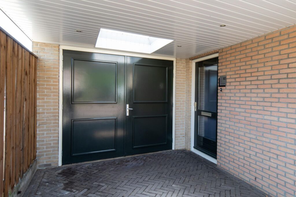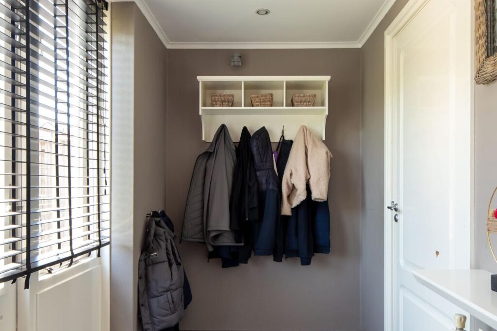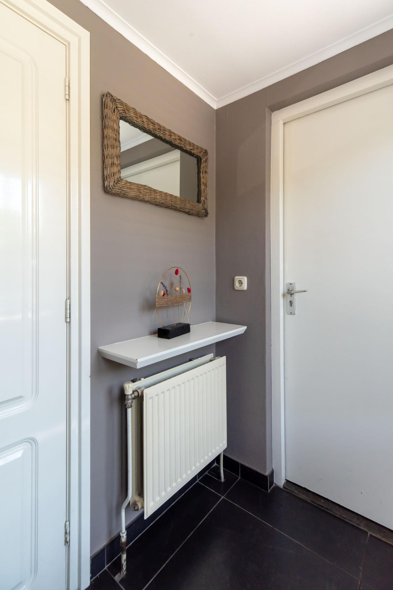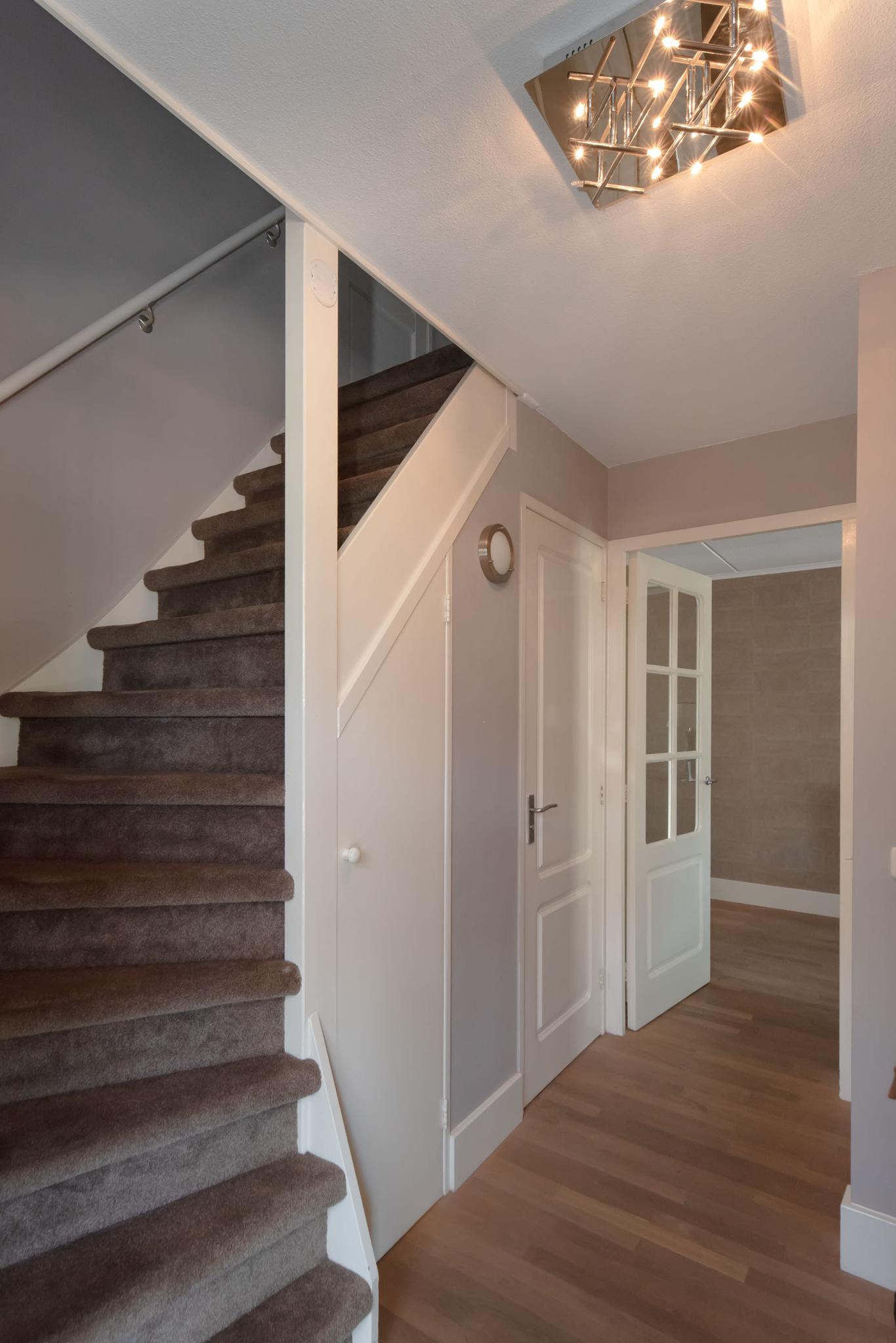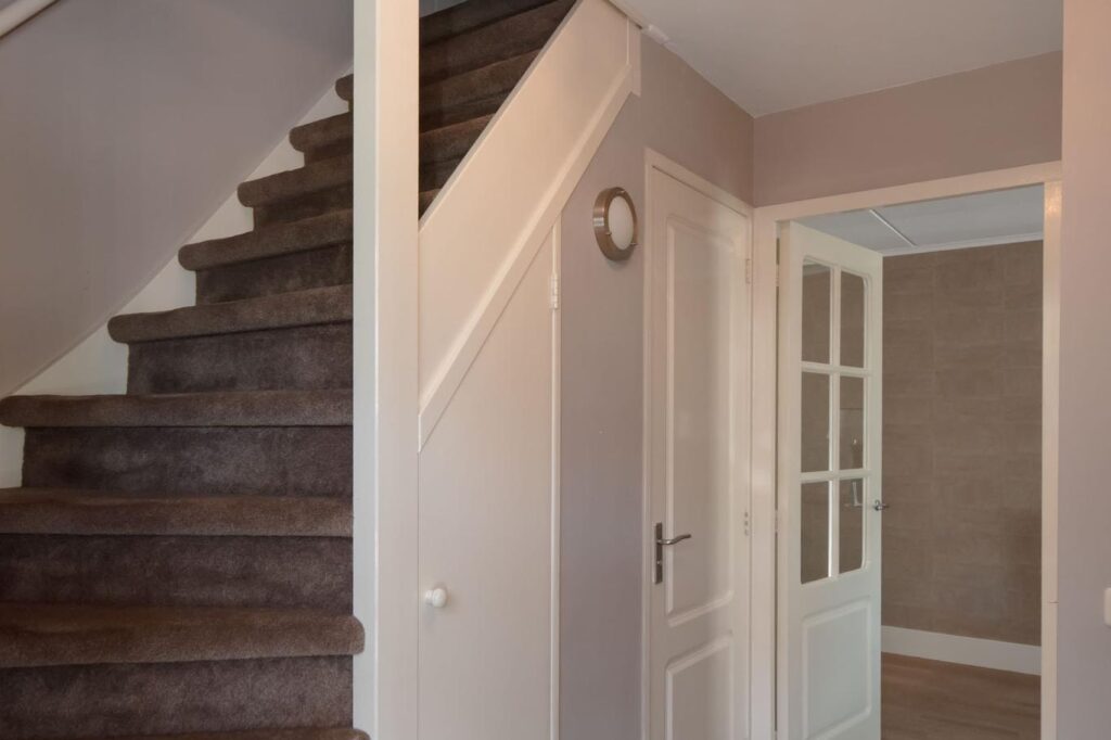 Je parkeert je auto onder de carport op de ruime oprit. Bij binnenkomst in de hal vind je de meterkast, het toilet, de trap naar de eerste verdieping en de deur naar de woonkamer.