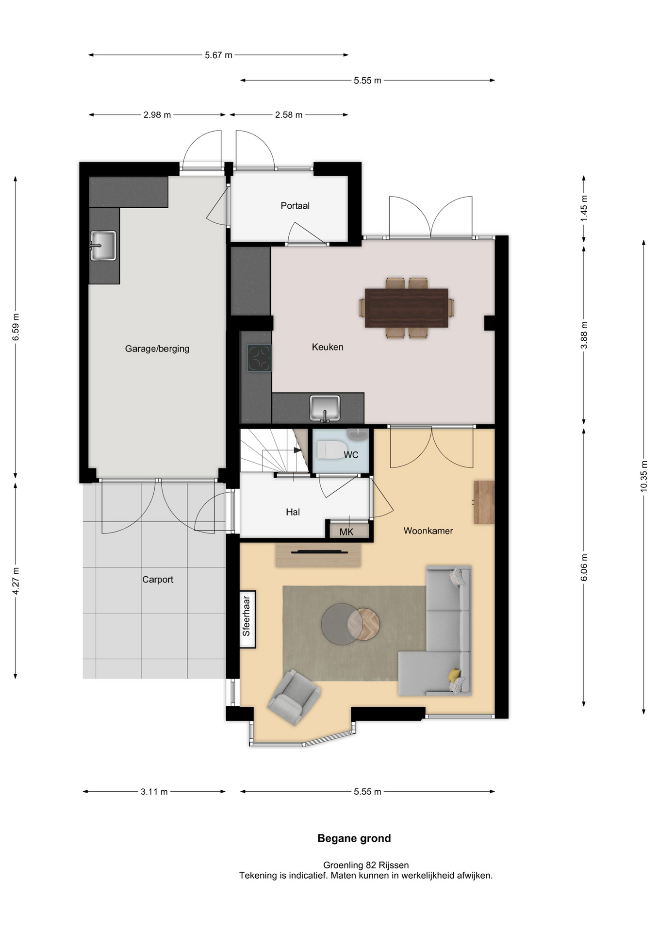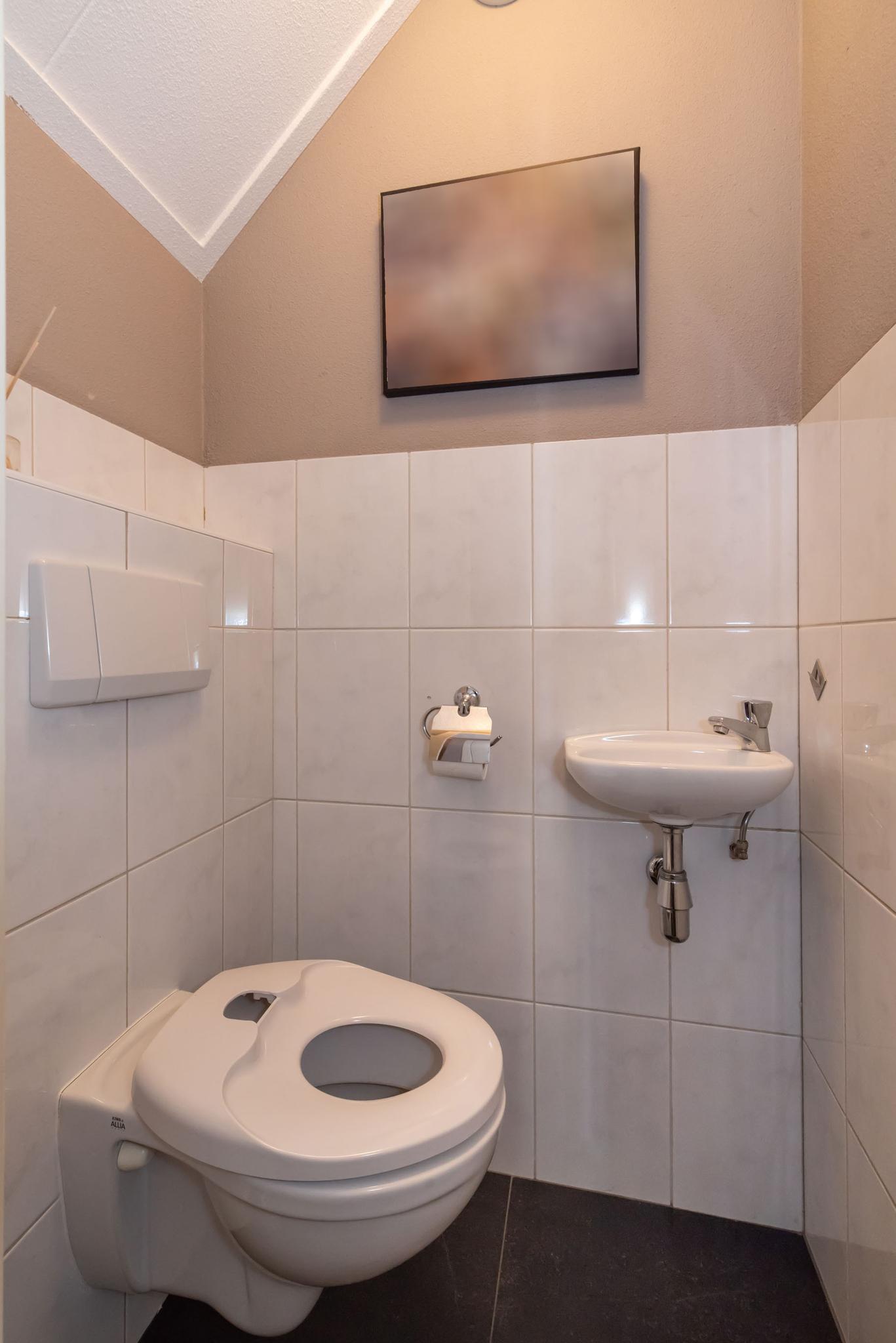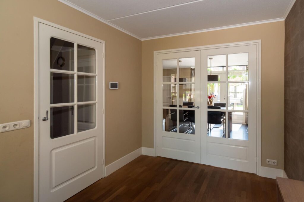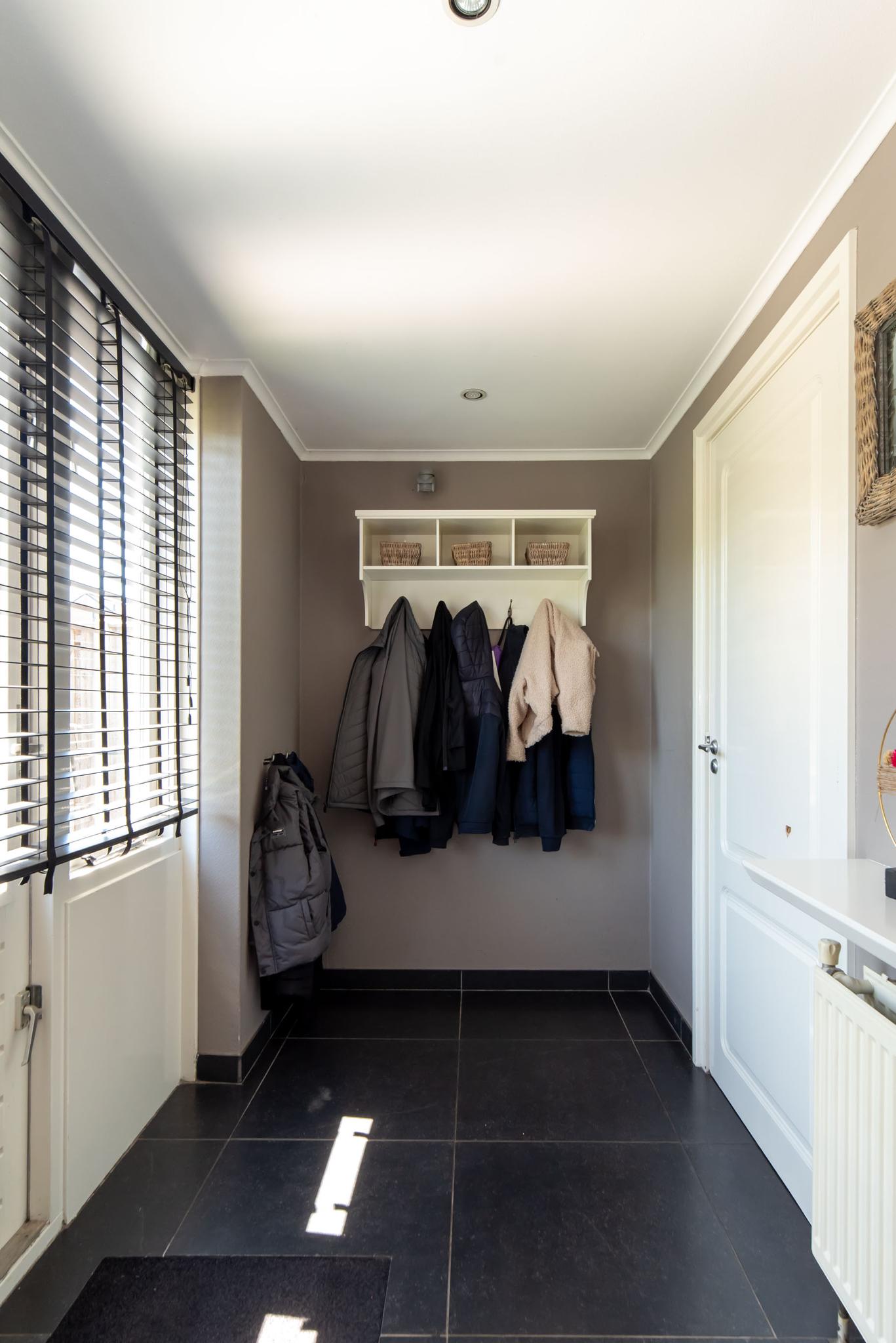 Je parkeert je auto onder de carport op de ruime oprit. Bij binnenkomst in de hal vind je de meterkast, het toilet, de trap naar de eerste verdieping en de deur naar de woonkamer.
