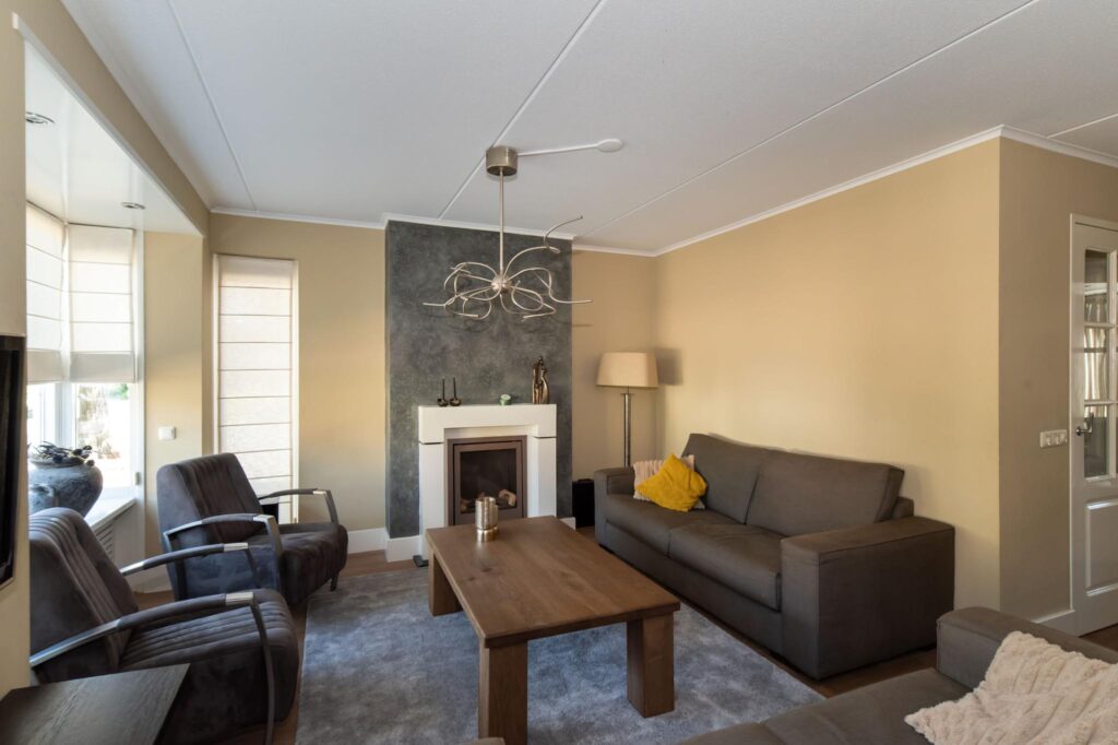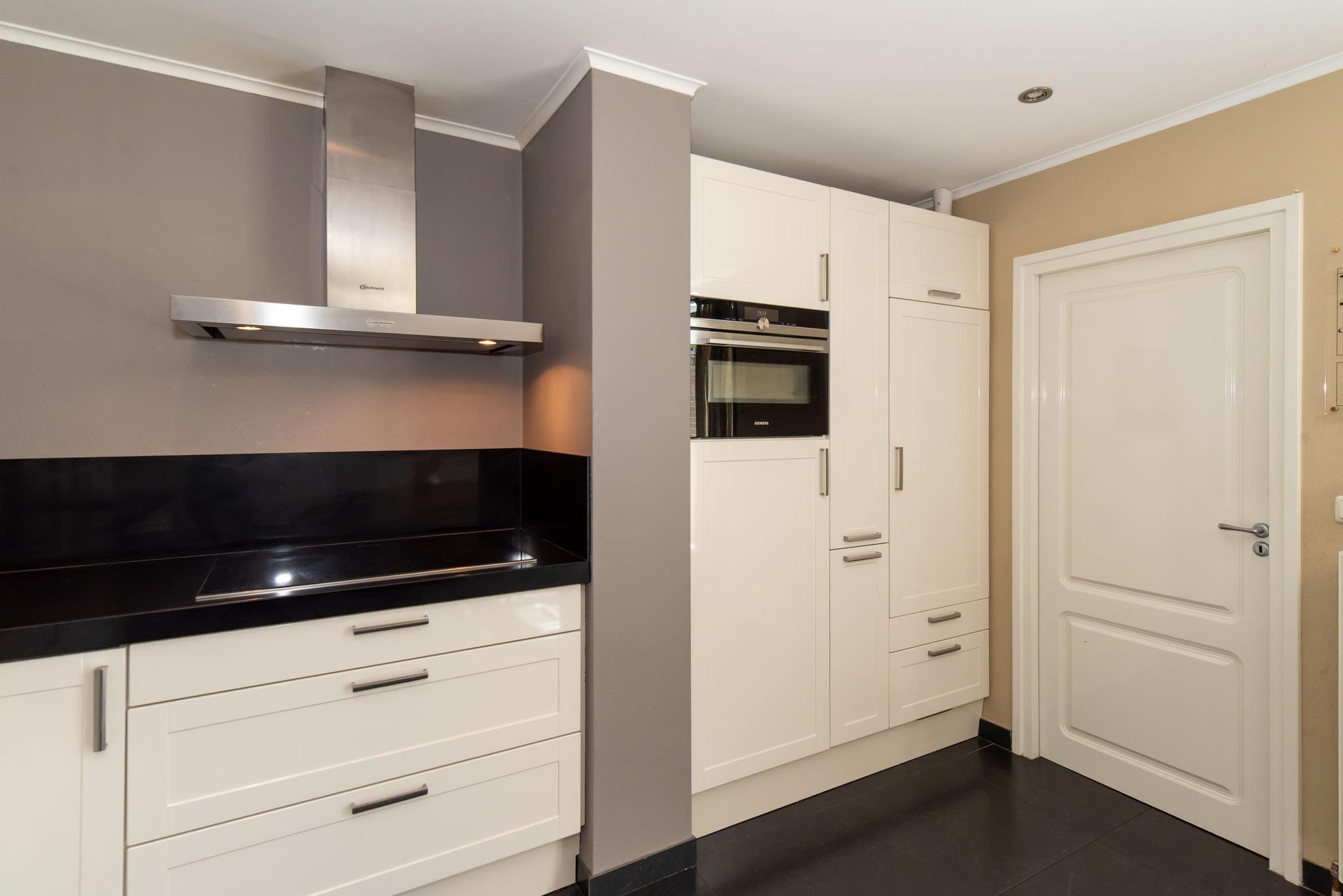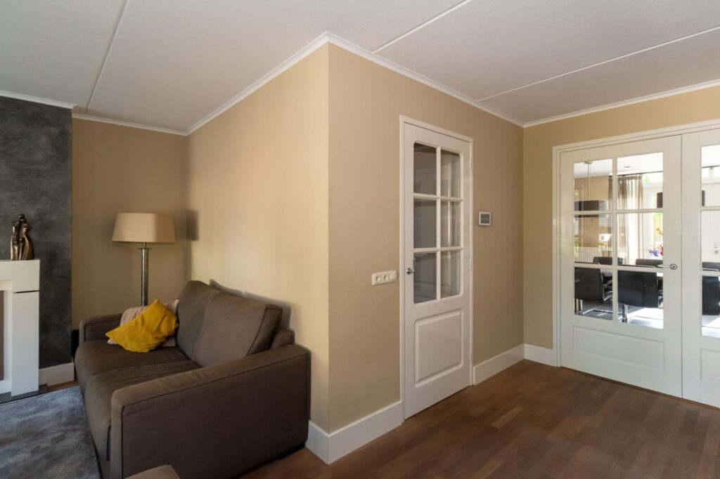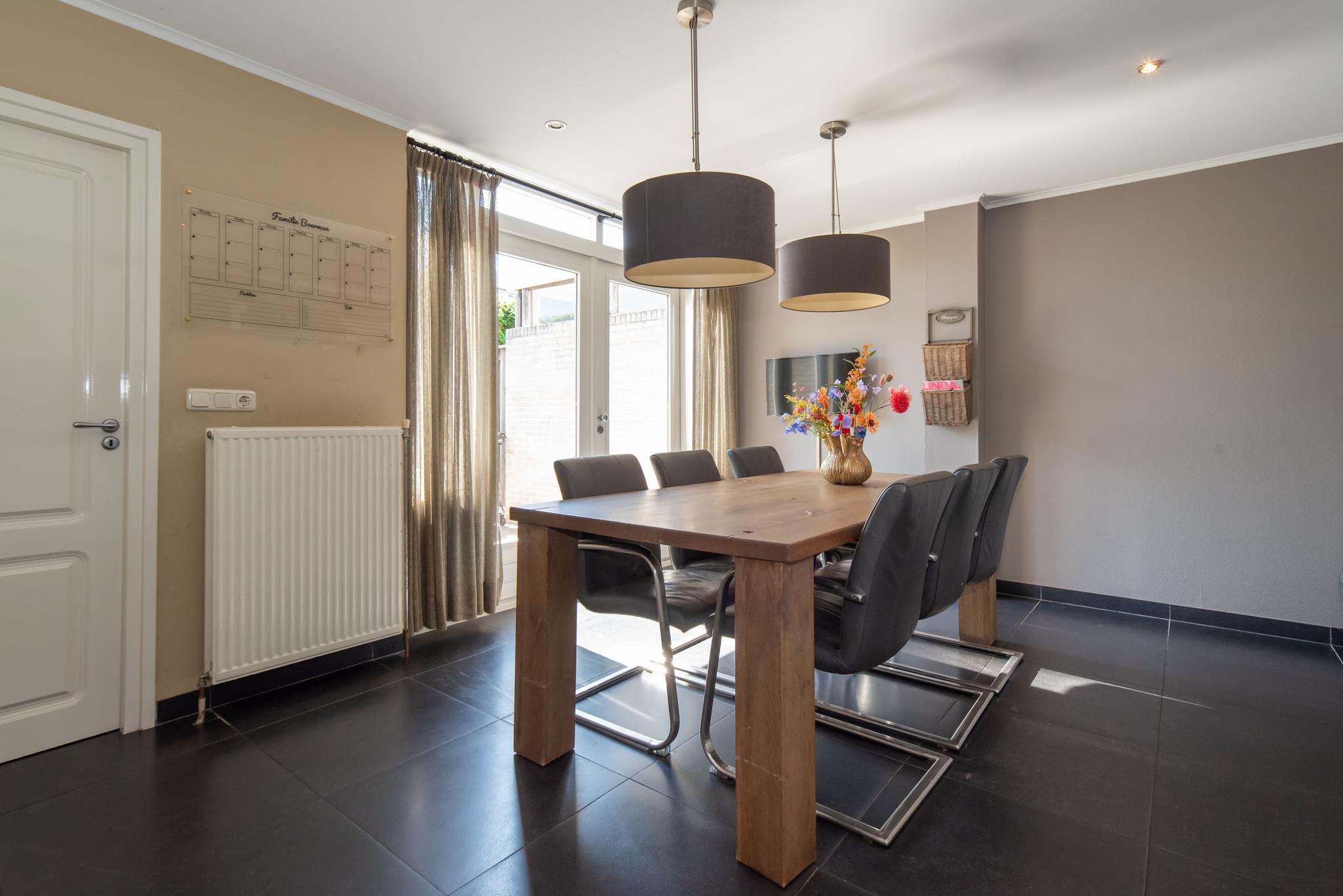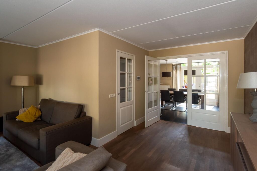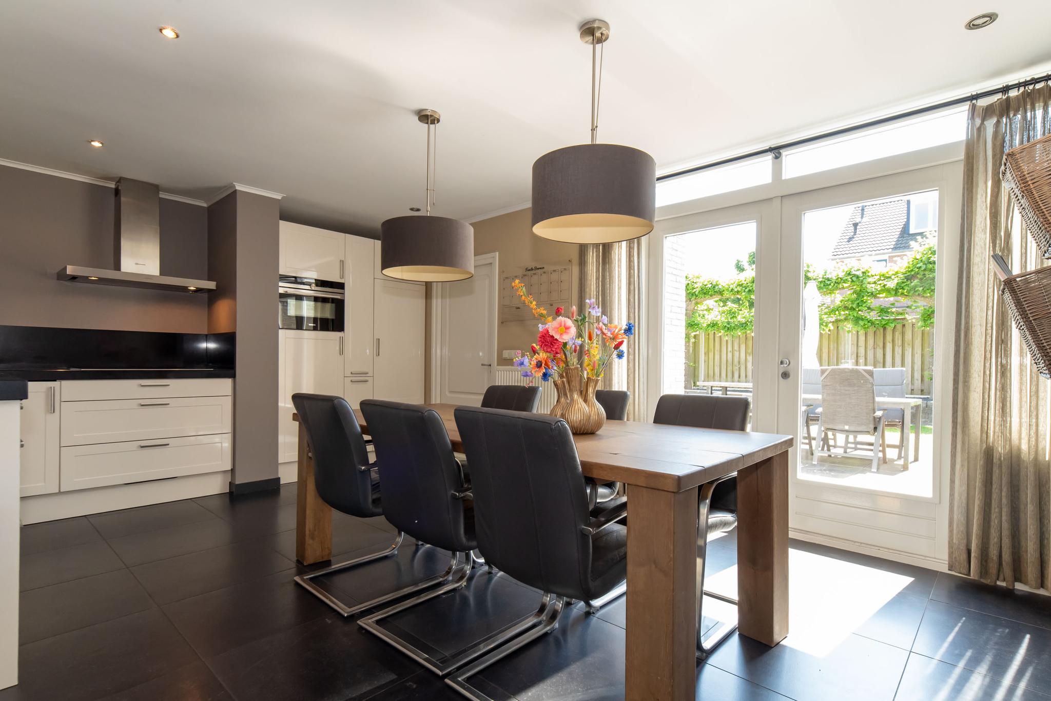 De ruime woonkamer beschikt over een sfeervolle gashaard en een erker aan de voorzijde. Via dubbele deuren bereik je de woonkeuken. Hier is voldoende ruimte voor een royale eethoek en dankzij de openslaande tuindeuren stap je zo de tuin in. De keuken is recent voorzien van nieuwe inbouwapparatuur. Daarnaast is er een praktische bijkeuken aanwezig, die tevens toegang geeft tot de ruime garage.