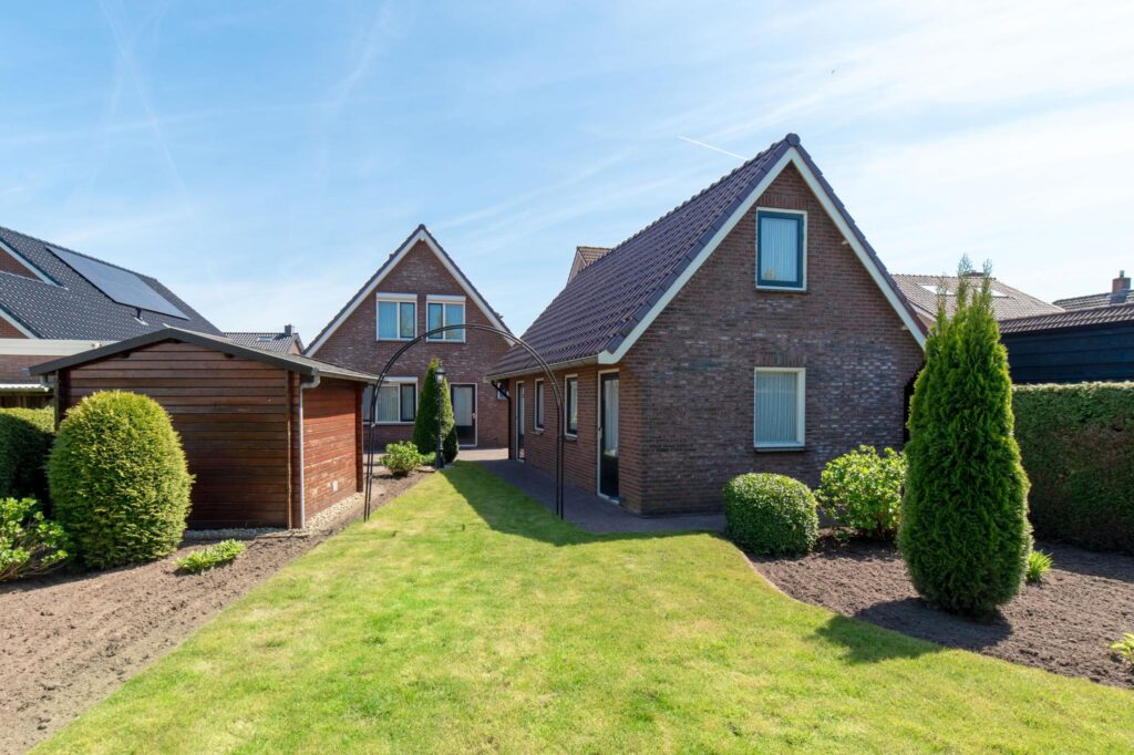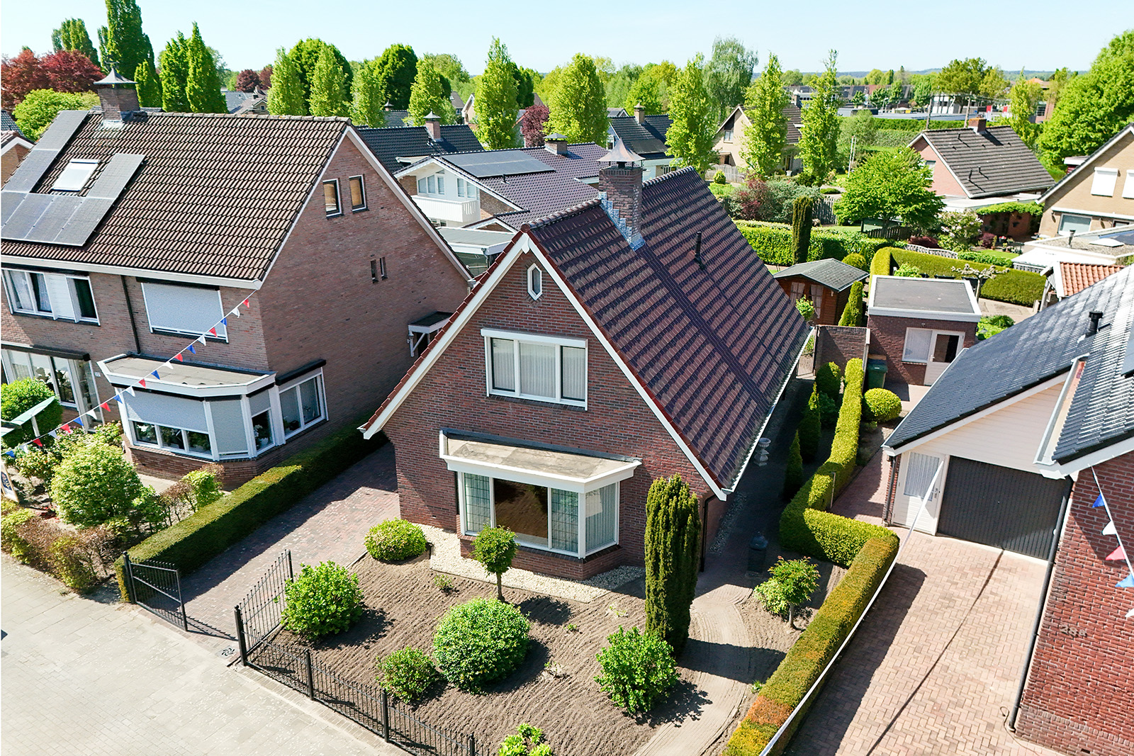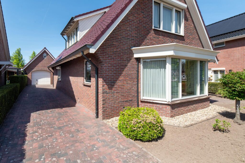 Bij aankomst valt meteen de fraaie voortuin op, omheind met een elegant sierhek dat volledig afsluitbaar is, waardoor je geniet van extra privacy en veiligheid. De royale oprit biedt genoeg ruimte voor meerdere auto’s en leidt naar de garage met elektrische deur, zo rijdt je eenvoudig de garage in. Via de voordeur kom je binnen in de centrale hal van de woning. Hier bevinden zich het toilet, de vaste trap naar de eerste verdieping, de deur naar de keuken en toegang tot een ruime slaapkamer en een eigen badkamer. Ideaal voor wie gelijkvloers wil wonen of juist op zoek is naar een rustige, eigen plek in huis. De keuken is een centrale plek in de woning en geeft toegang tot de tweede hal waar zich een praktische kastenwand bevindt, een bijkeuken met wasruimte en de deur naar de ruime achtertuin. Vanuit de keuken is middels dubbele deuren de woonkamer te bereiken, zo is de keuken afsluitbaar van de woonkamer, waardoor je in alle rust kunt koken of gewoon lekker gezellig apart kunt gaan zitten. De woonkamer beschikt over een fijne ruimte en veel natuurlijk lichtinval door de prachtige erker aan de voorzijde van de woning.