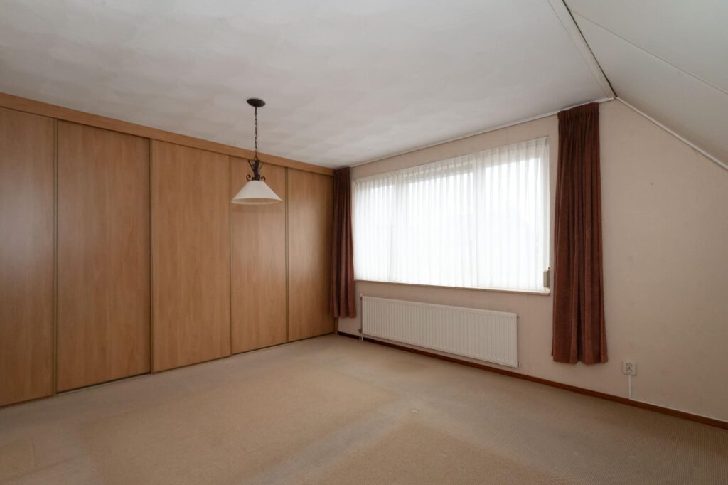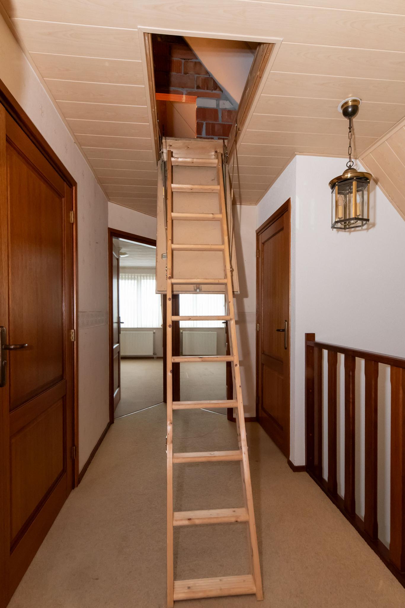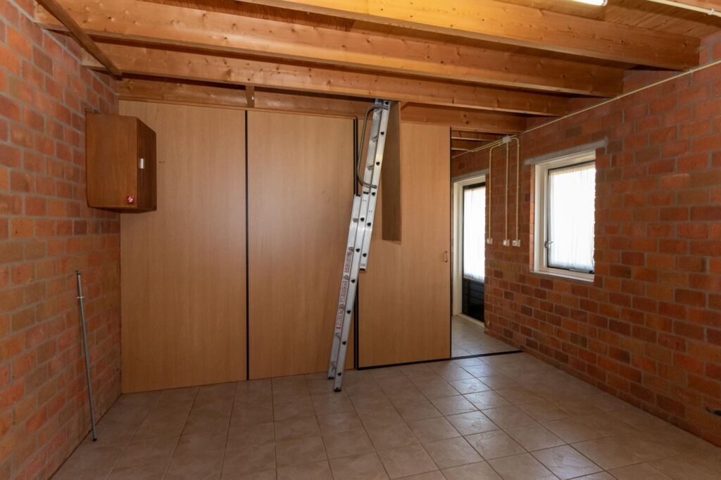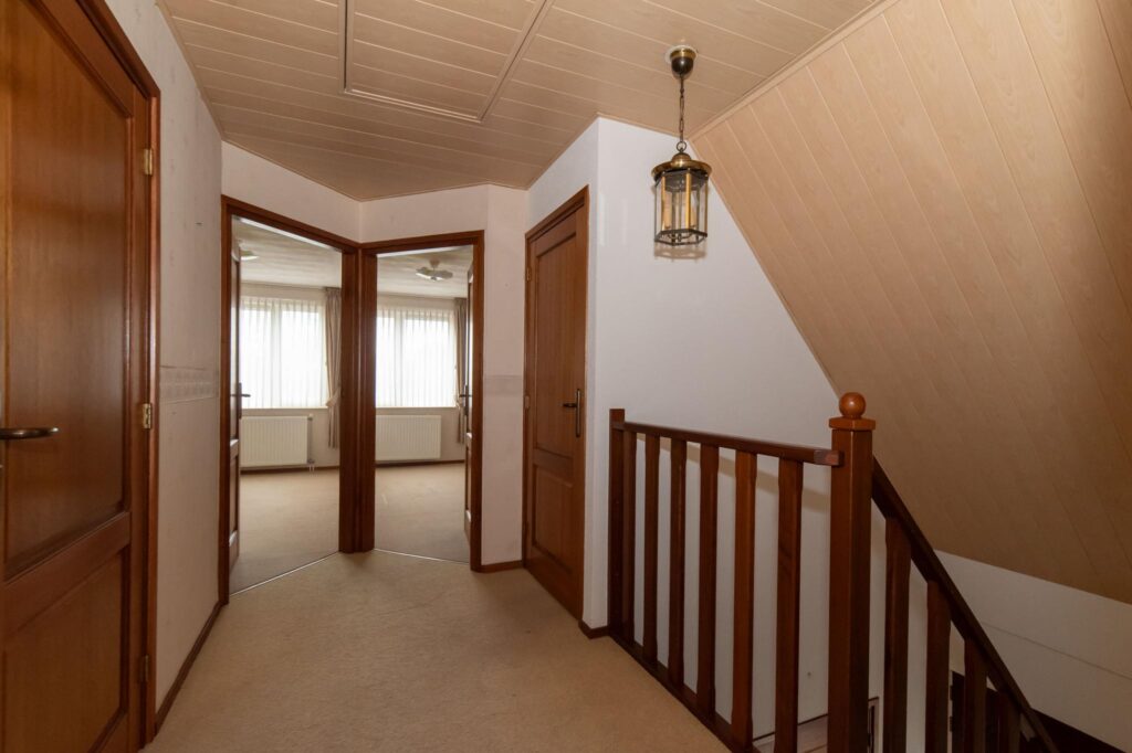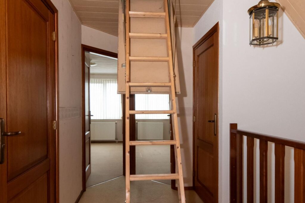 Op de eerste verdieping vind je de tweede badkamer en drie fijne slaapkamers, allemaal met handige bergruimte. Twee van de kamers hebben extra opslagruimte onder de knieschotten, terwijl de derde slaapkamer een ruime kastenwand heeft. Via een vlizotrap bereik je de bergzolder.