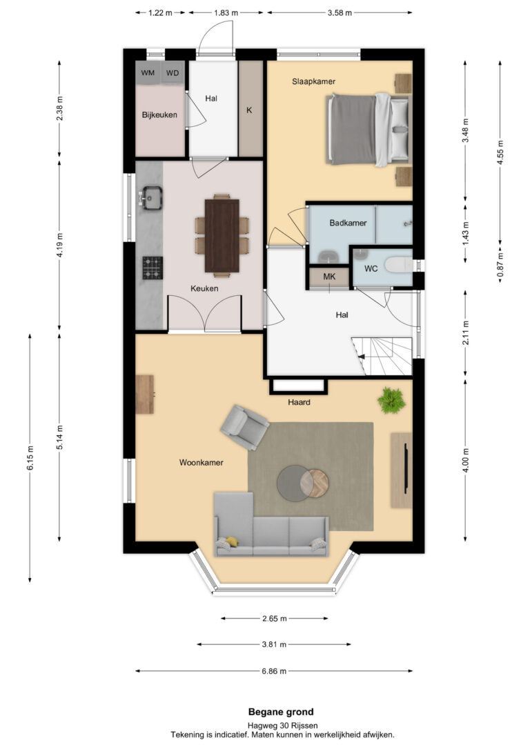 Vermelde maatvoeringen en gepubliceerde plattegronden zijn opgesteld binnen de kaders van de Branche Brede Meetinstructie; gebaseerd op NEN2580, met een onderverdeling in verschillende gebruiksoppervlakten. Omdat de publicatie ingevoerde gegevens via diverse, externe kanalen geschiedt, kan Daan Makelaars BV geen aansprakelijkheid aanvaarden voor onjuiste weergave van informatie.