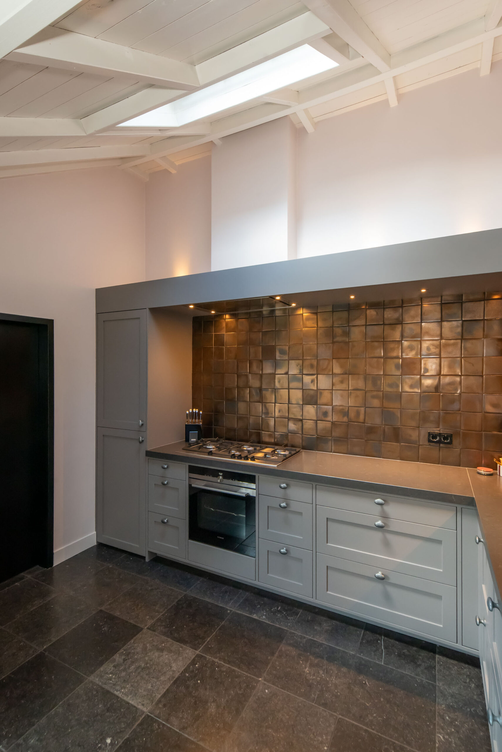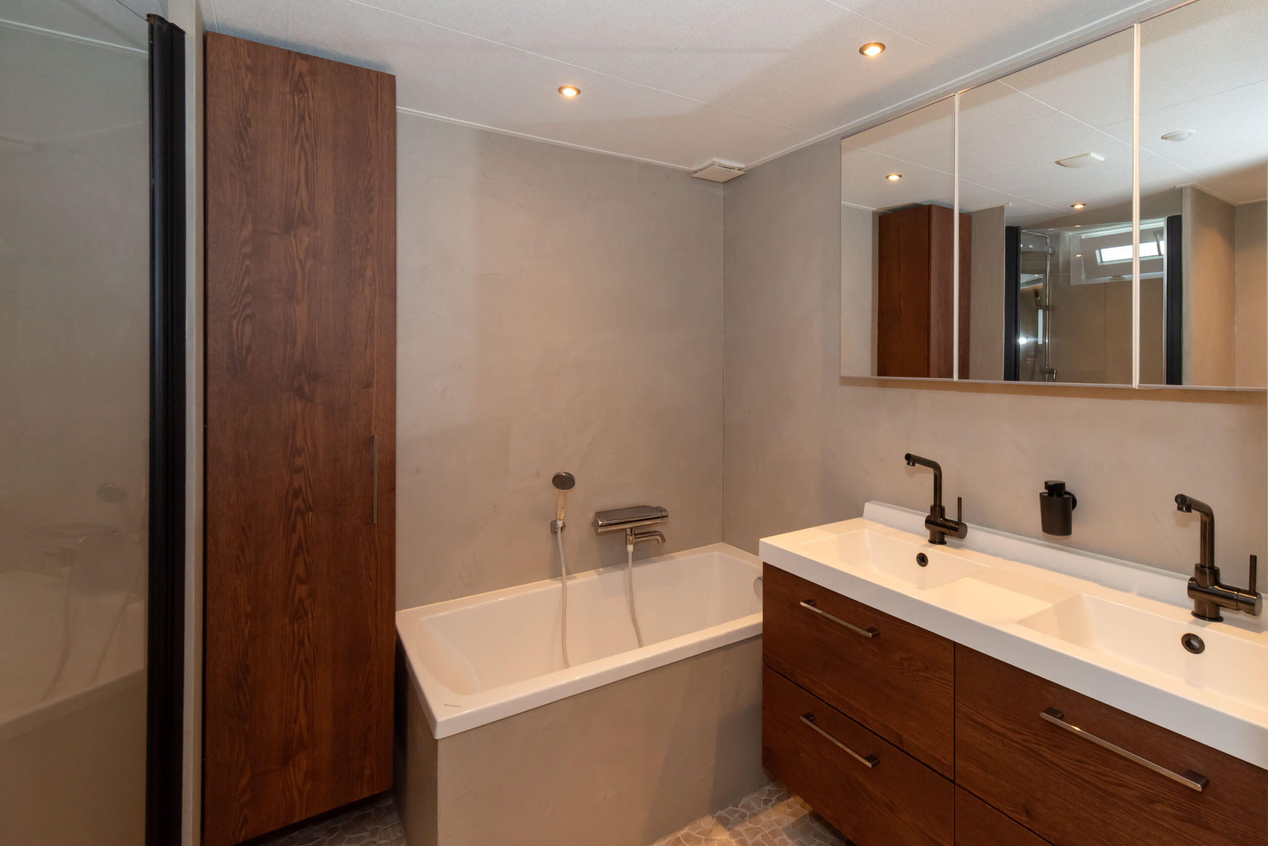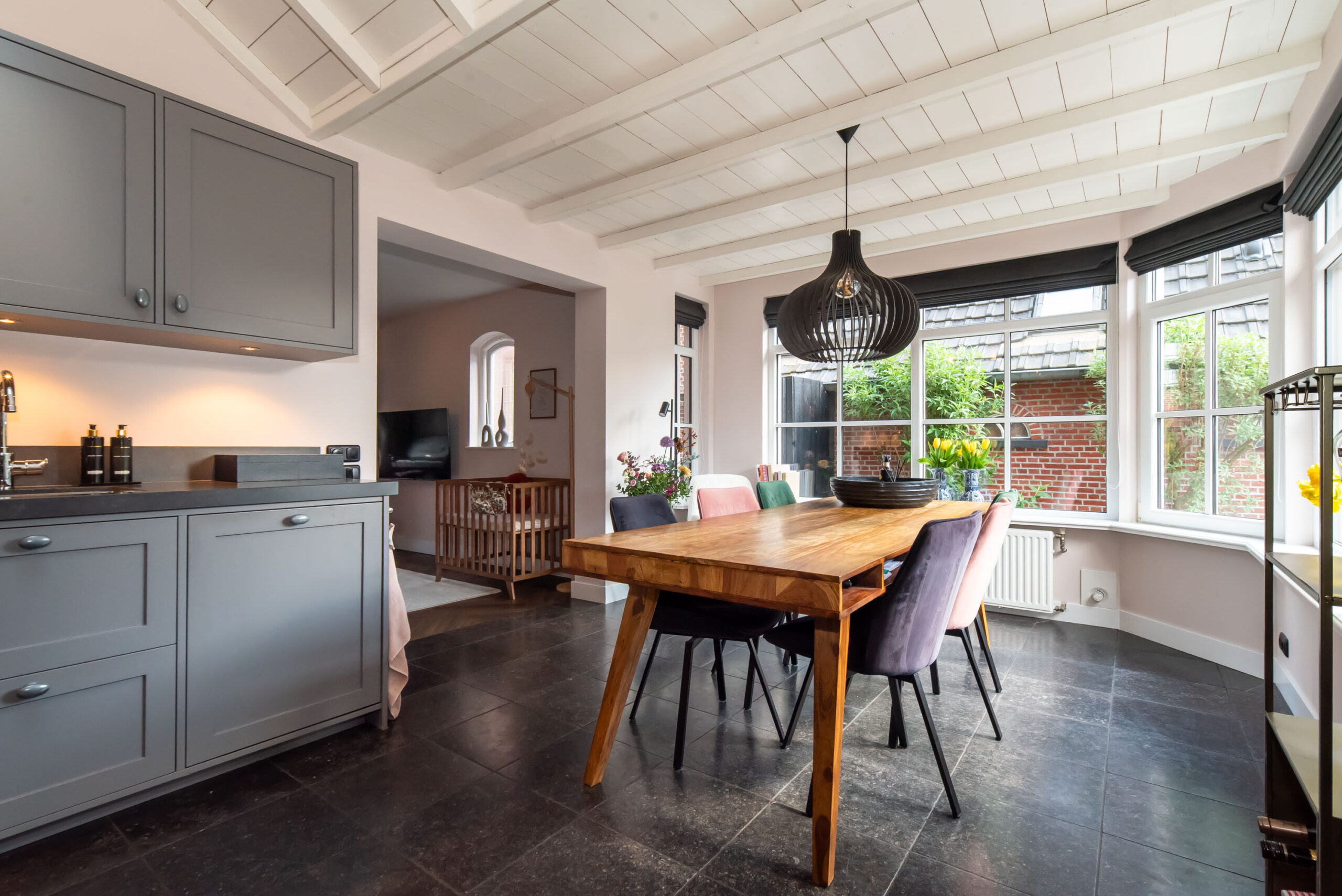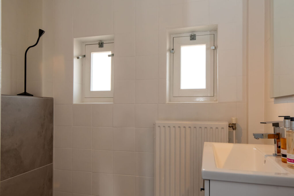Aan de achterzijde bevindt zich de royaal uitgebouwde woonkeuken. Deze moderne keuken is voorzien van diverse inbouwapparatuur, waaronder een stoomoven, koel-vriescombinatie, vaatwasser en 5-pits gaskookplaat. Vanuit de keuken is de praktische bijkeuken / achterentree bereikbaar. Hier bevinden zich vaste kastenwanden en de witgoedaansluitingen op comfortabele hoogte. De badkamer is eveneens aan de achterzijde gelegen en is in december 2020 volledig vernieuwd. De moderne badkamer is instapklaar en stijlvol afgewerkt.