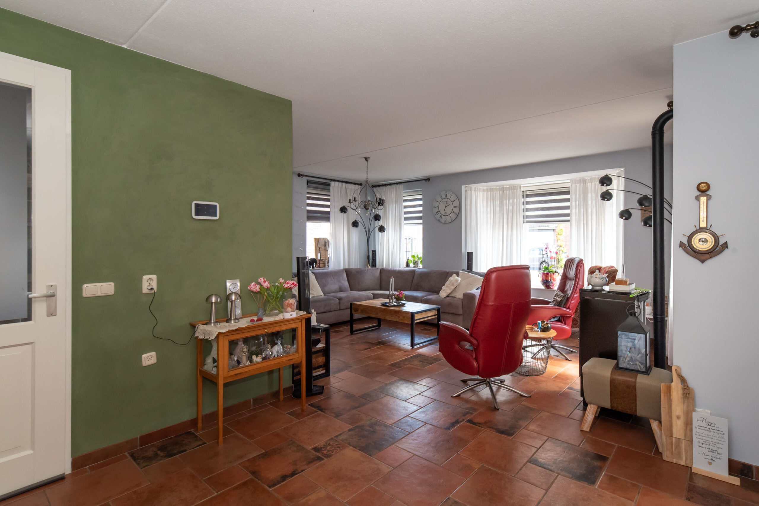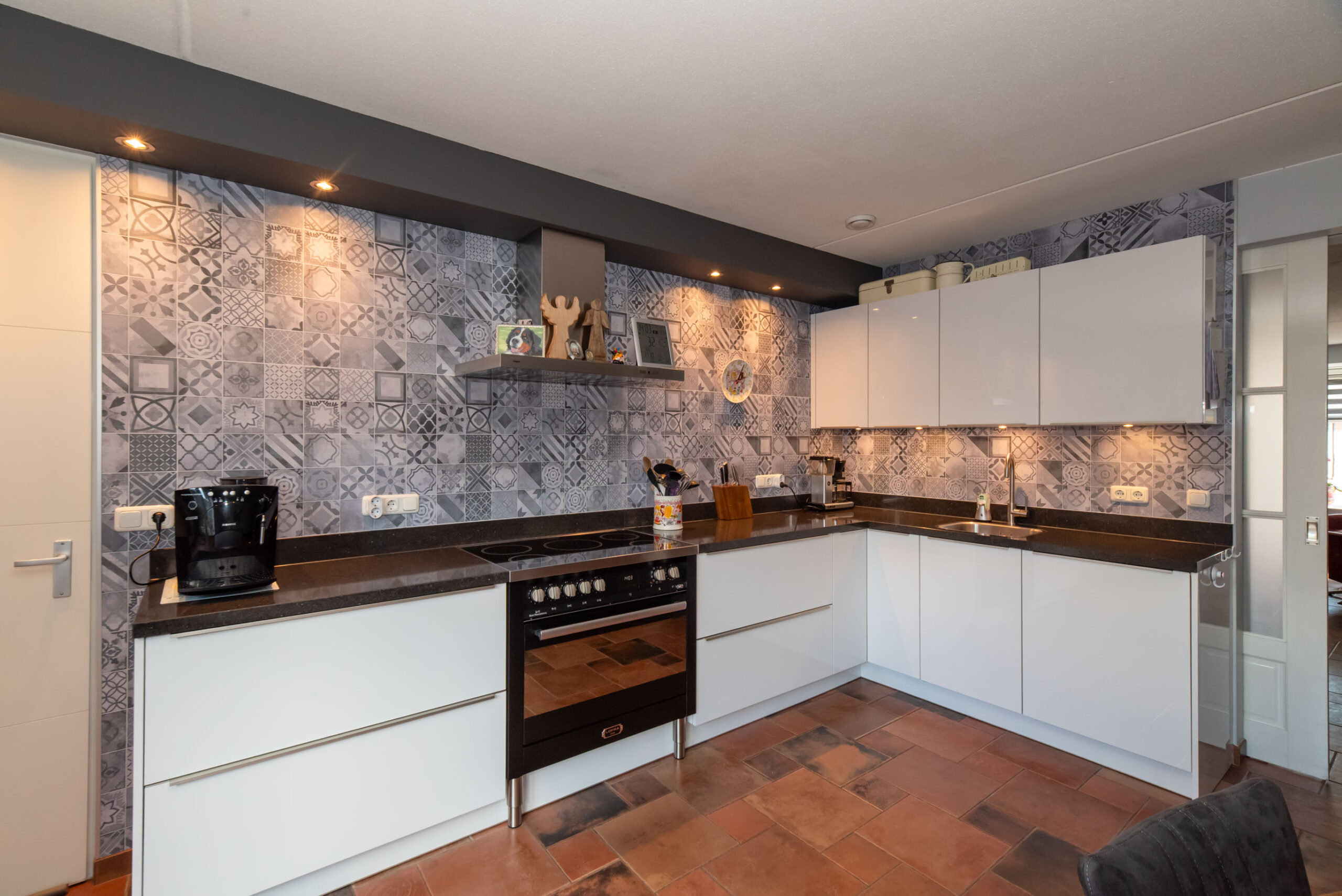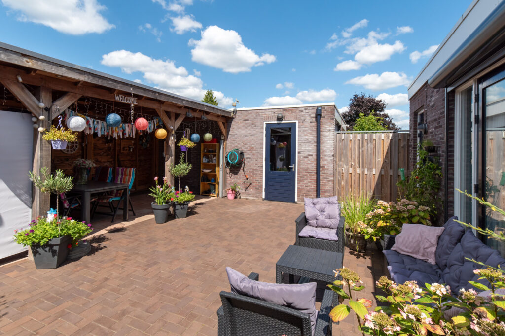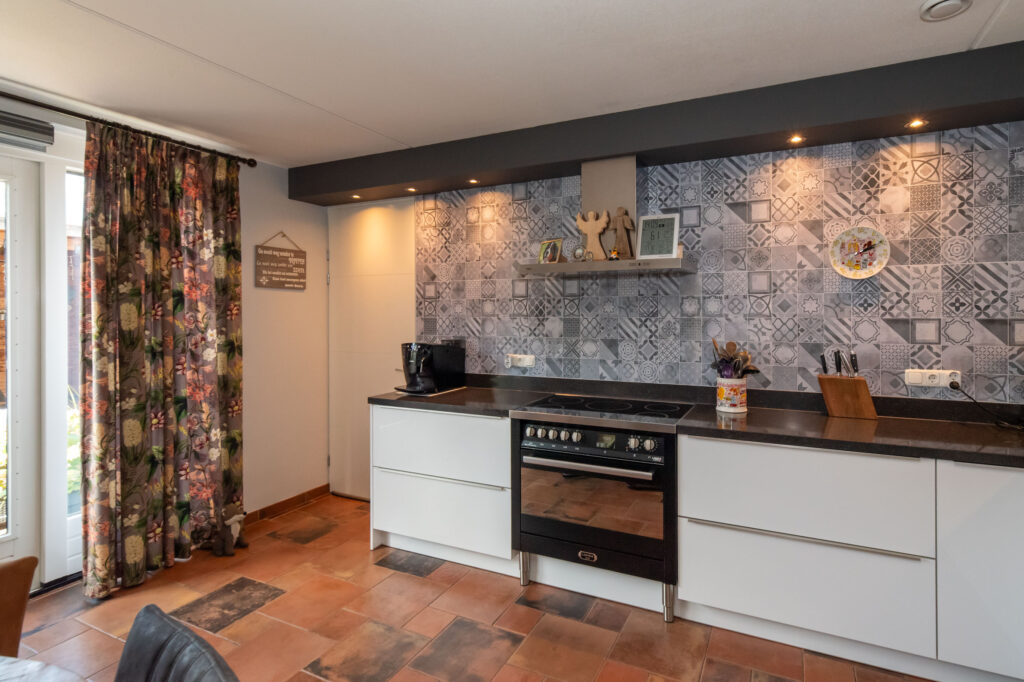 Je parkeert je auto op je eigen oprit en loopt via de voordeur de woning binnen. In de hal vind je het toilet, de meterkast, de vaste trap naar de eerste verdieping en de deur naar de woonkamer. De woonkamer is ruim opgezet, heeft veel raampartijen en is voorzien van een gezellige pelletkachel voor de koude winterdagen. Via schuifdeuren is de woonkamer gescheiden van de woonkeuken. De woonkeuken is voorzien van een inbouwkeuken met apparatuur zoals een kookplaat, oven, vaatwasser en veel kastruimte. Vanuit de woonkeuken heb je toegang tot de bijkeuken. Via de openslaande deuren stap je zo de zonnige tuin in. De tuin is onderhoudsvriendelijk ingericht en onder de overkapping kun je ook op regenachtige dagen heerlijk buiten zitten. In de bijkeuken vind je de aansluiting voor de wasmachine en toegang tot de werkkamer.