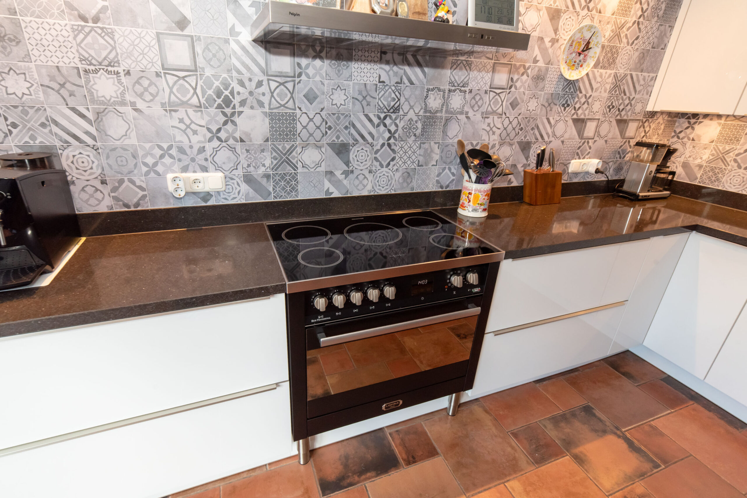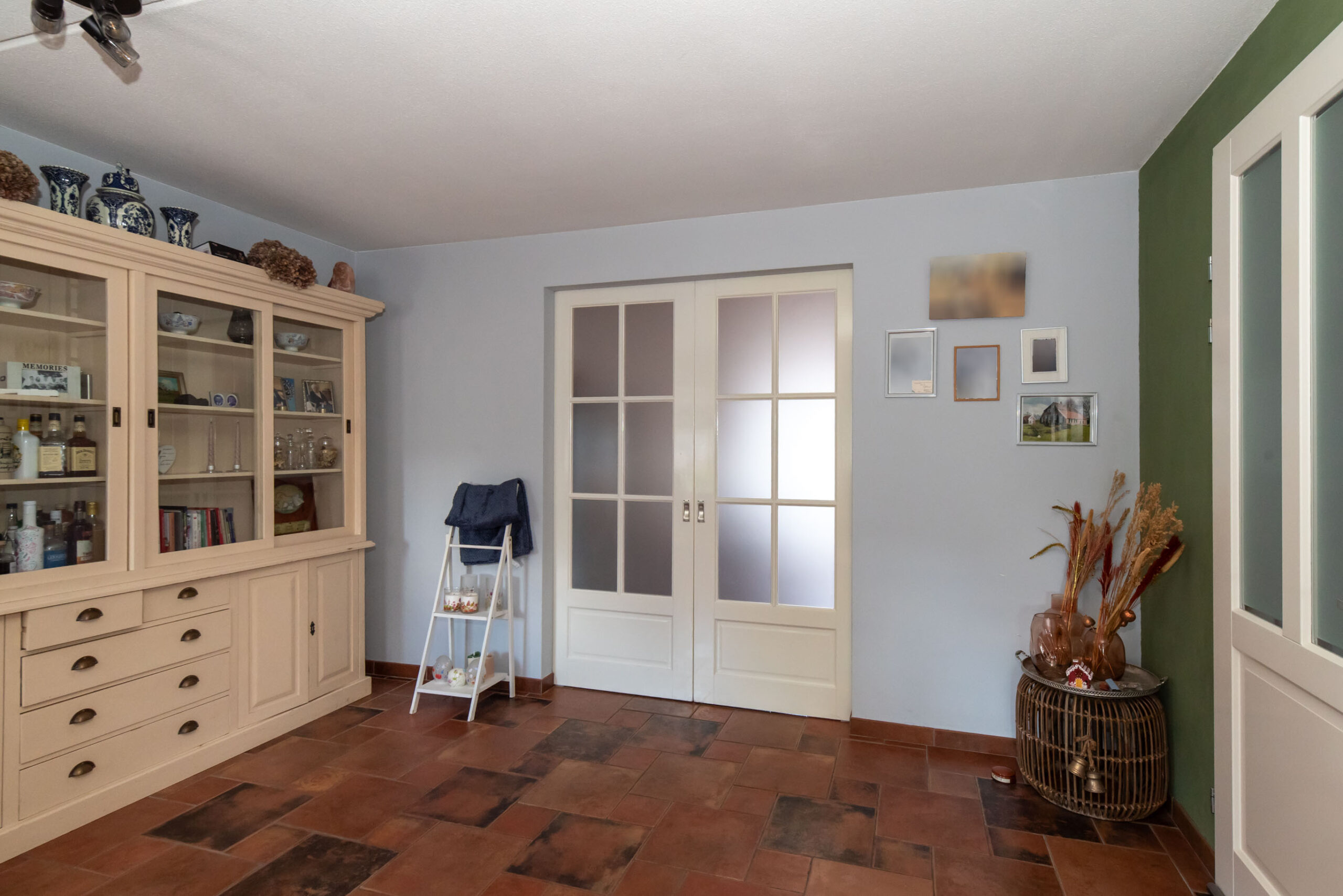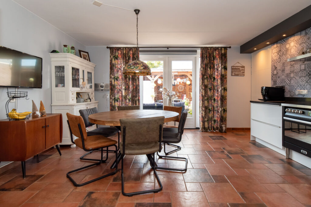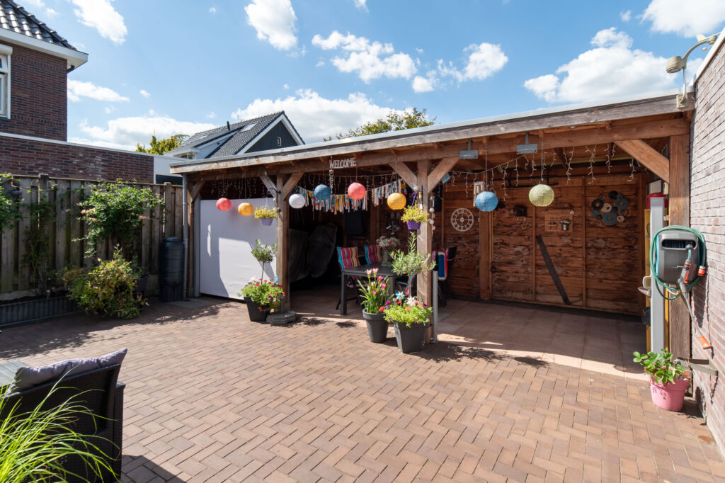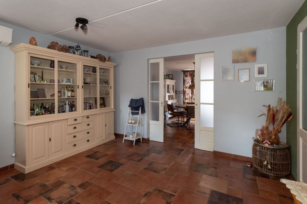 Je parkeert je auto op je eigen oprit en loopt via de voordeur de woning binnen. In de hal vind je het toilet, de meterkast, de vaste trap naar de eerste verdieping en de deur naar de woonkamer. De woonkamer is ruim opgezet, heeft veel raampartijen en is voorzien van een gezellige pelletkachel voor de koude winterdagen. Via schuifdeuren is de woonkamer gescheiden van de woonkeuken. De woonkeuken is voorzien van een inbouwkeuken met apparatuur zoals een kookplaat, oven, vaatwasser en veel kastruimte. Vanuit de woonkeuken heb je toegang tot de bijkeuken. Via de openslaande deuren stap je zo de zonnige tuin in. De tuin is onderhoudsvriendelijk ingericht en onder de overkapping kun je ook op regenachtige dagen heerlijk buiten zitten. In de bijkeuken vind je de aansluiting voor de wasmachine en toegang tot de werkkamer.