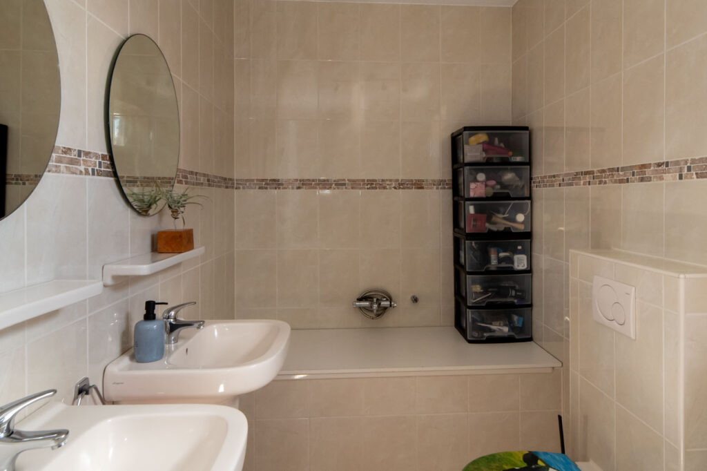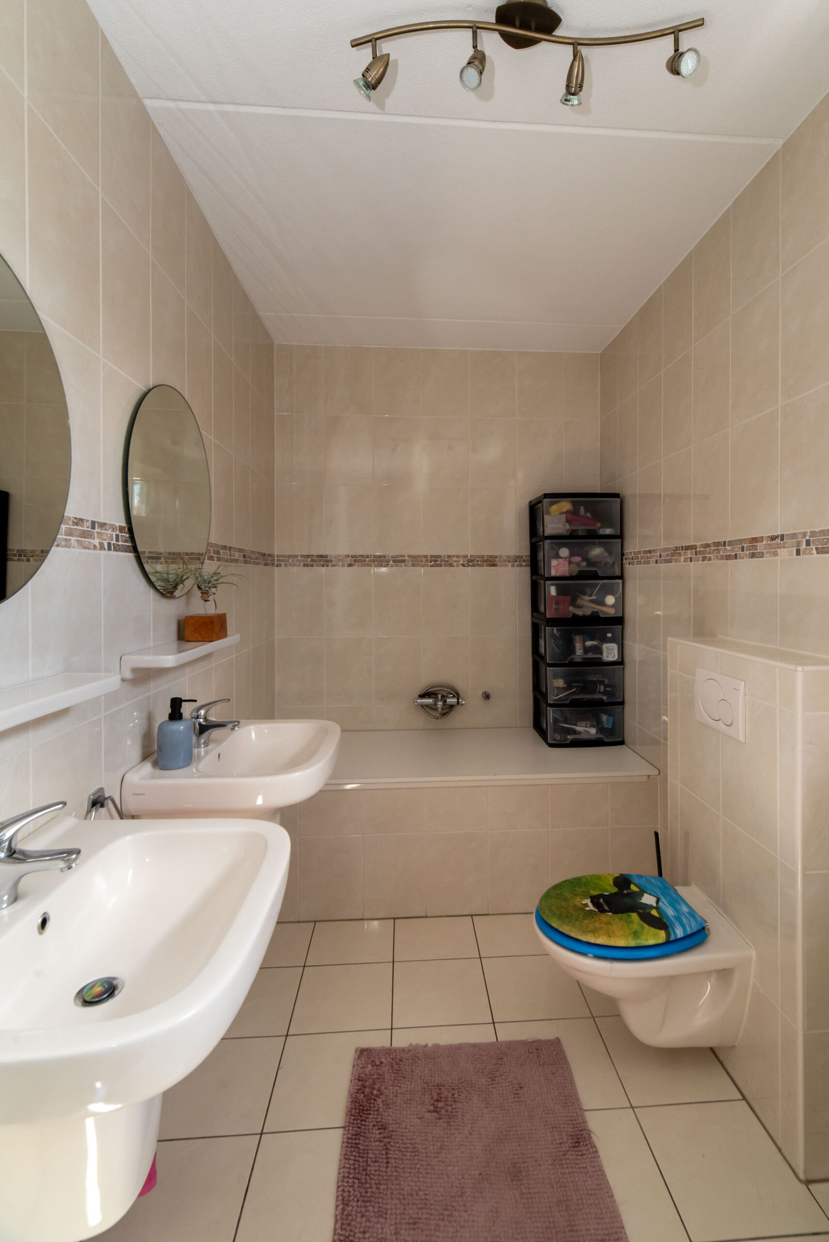 Op de eerste verdieping bevinden zich drie ruime slaapkamers. Via de overloop bereik je de vaste trap naar de tweede verdieping en de badkamer. De badkamer is van alle gemakken voorzien: een ligbad, een aparte douche, een dubbele wastafel en een toilet.