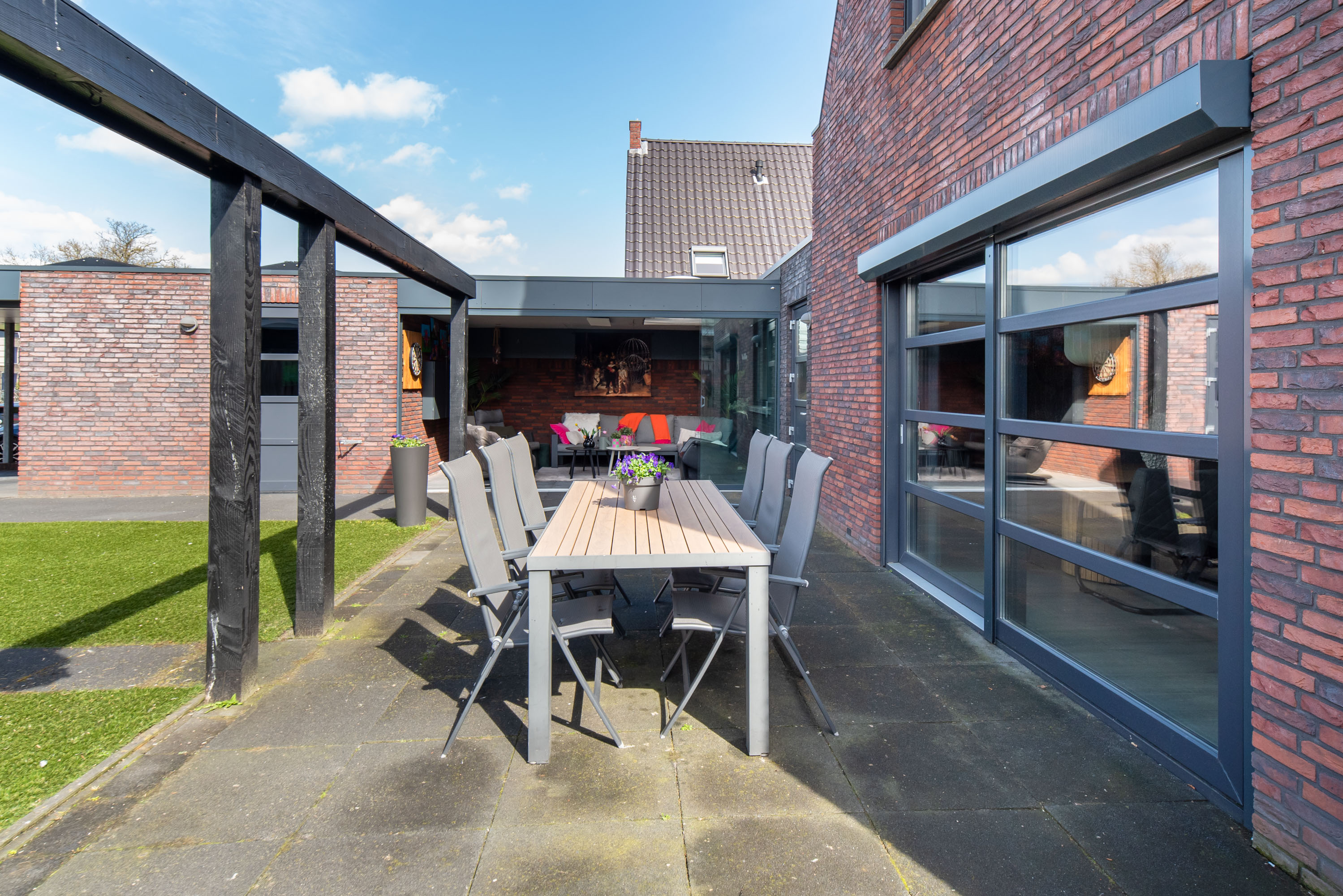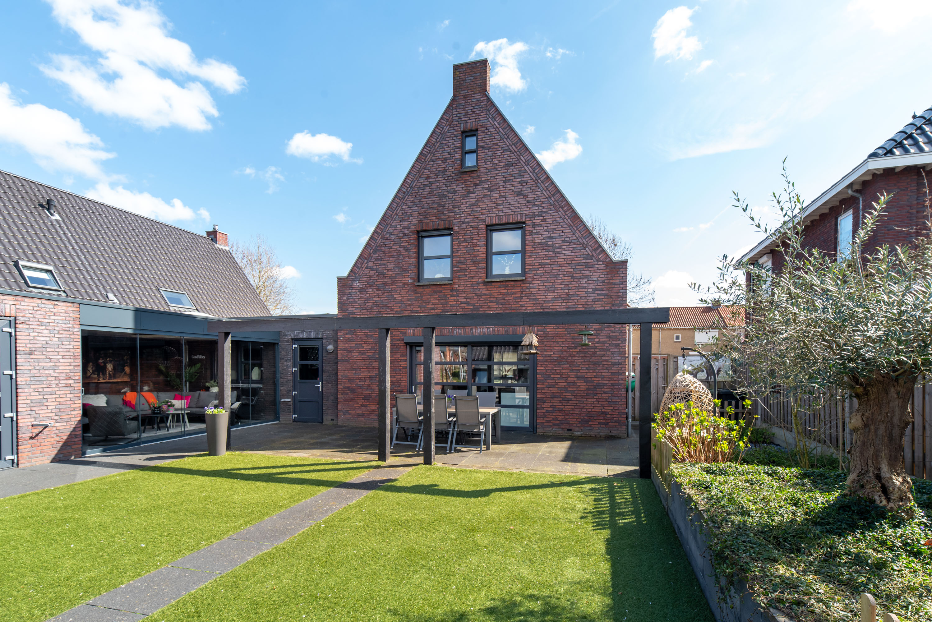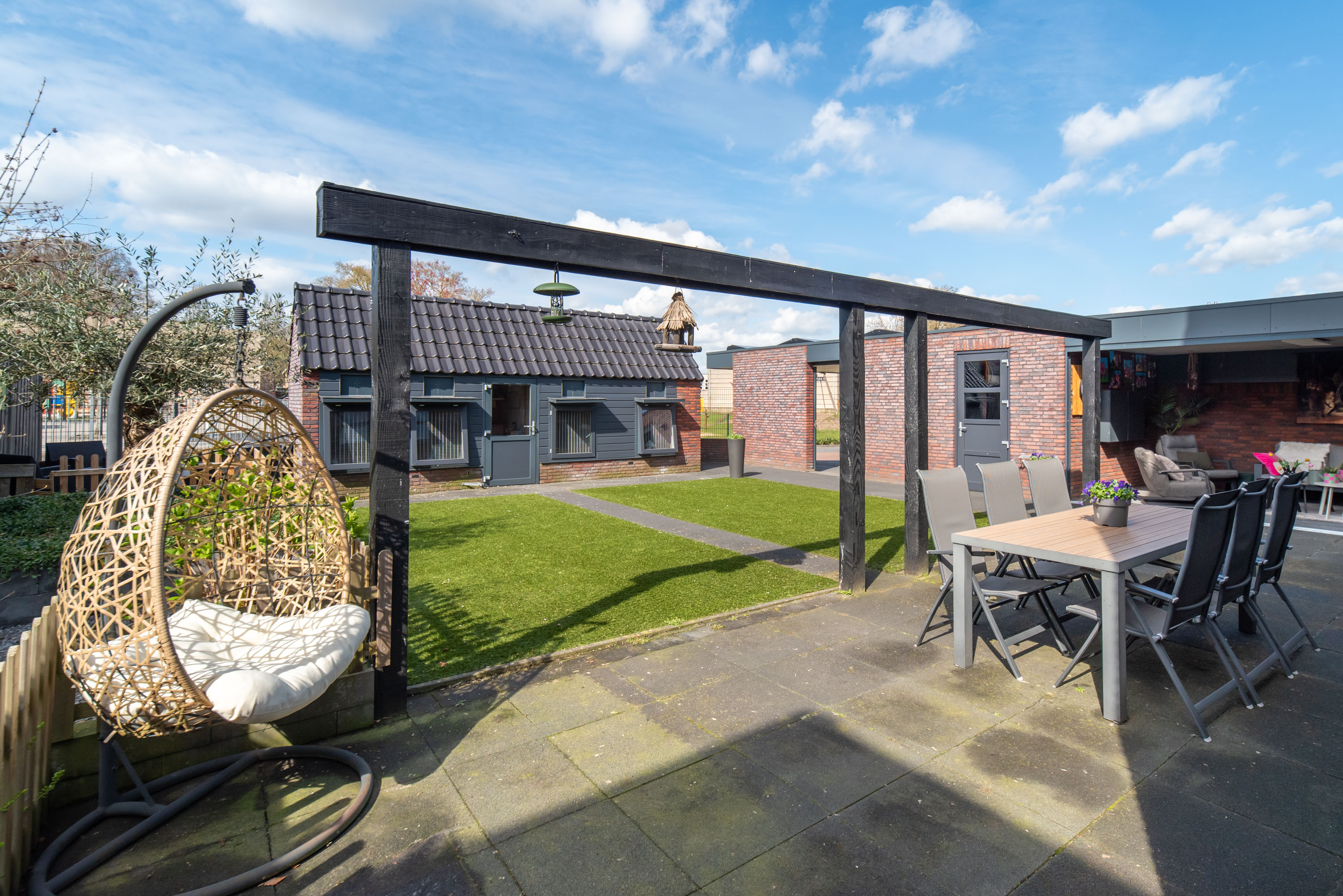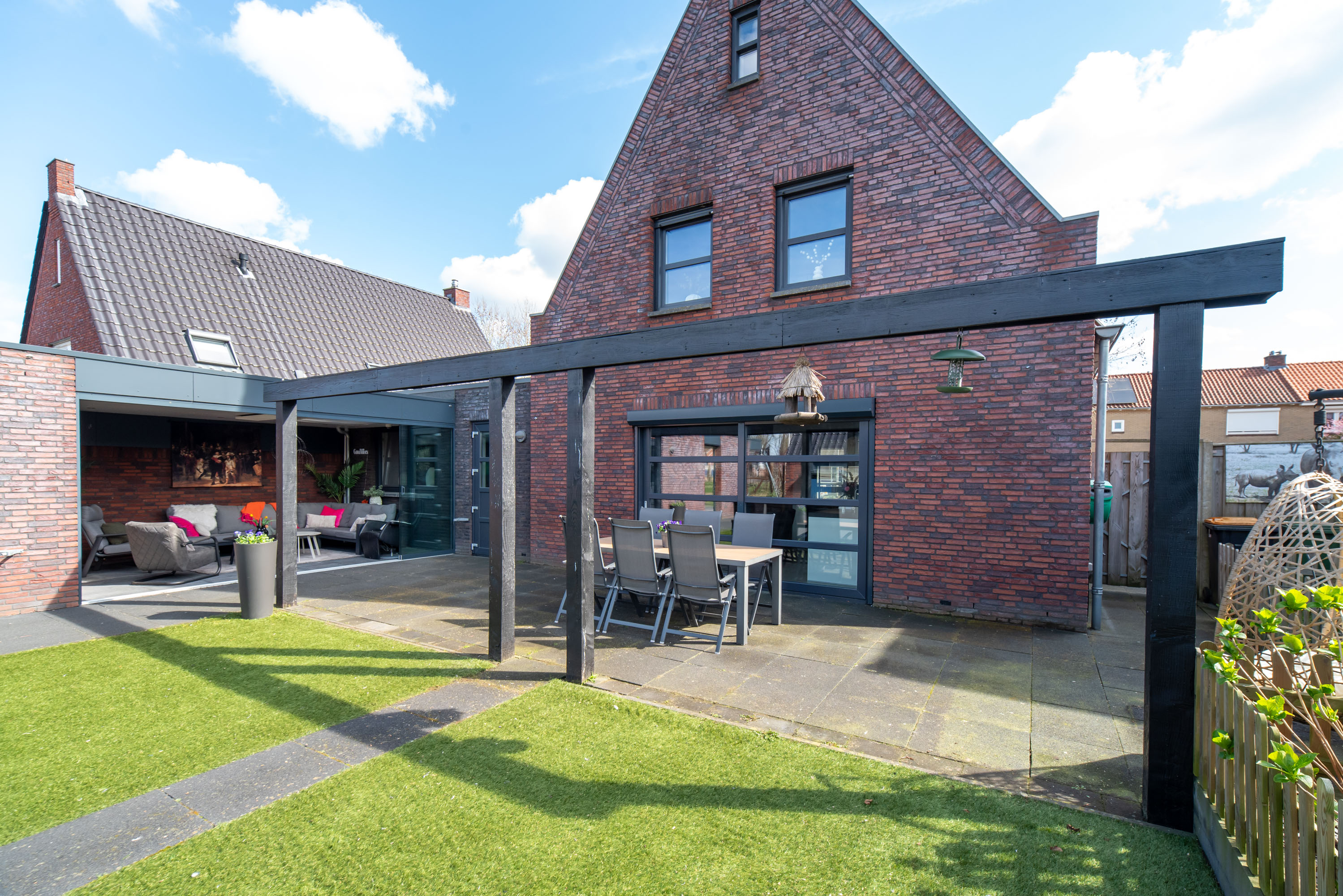 De achtertuin is gelegen op het westen: een heerlijke plek om te genieten van de zon in je eigen tuin! De tuin is onderhoudsarm aangelegd met een betegeld terras en kunstgras. Zie jij jezelf al zitten in die gave overkapping met een kopje koffie of een glaasje wijn? Zelfs in de winter is deze heerlijke ruimte dé plek om te zijn dankzij de glazen schuifpui.