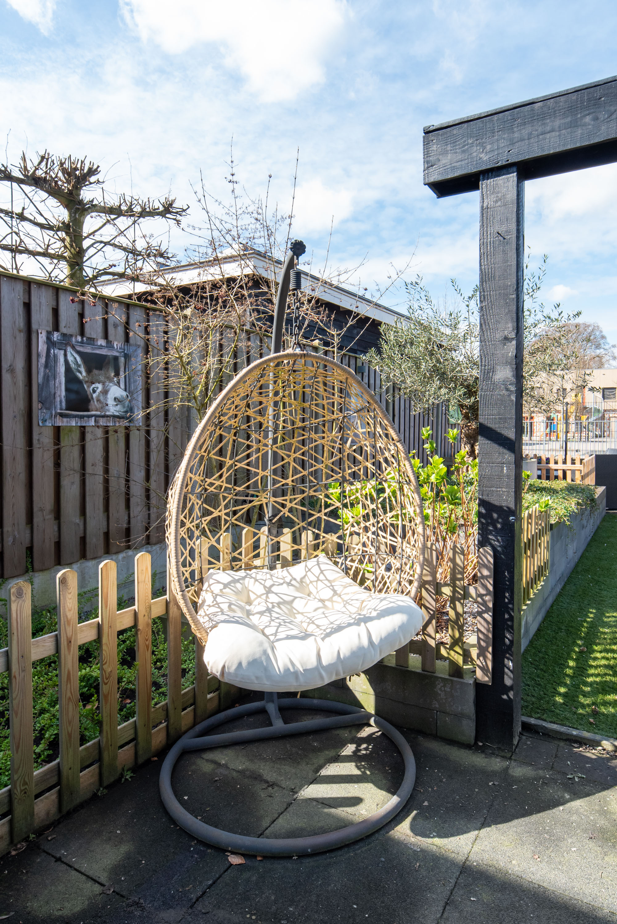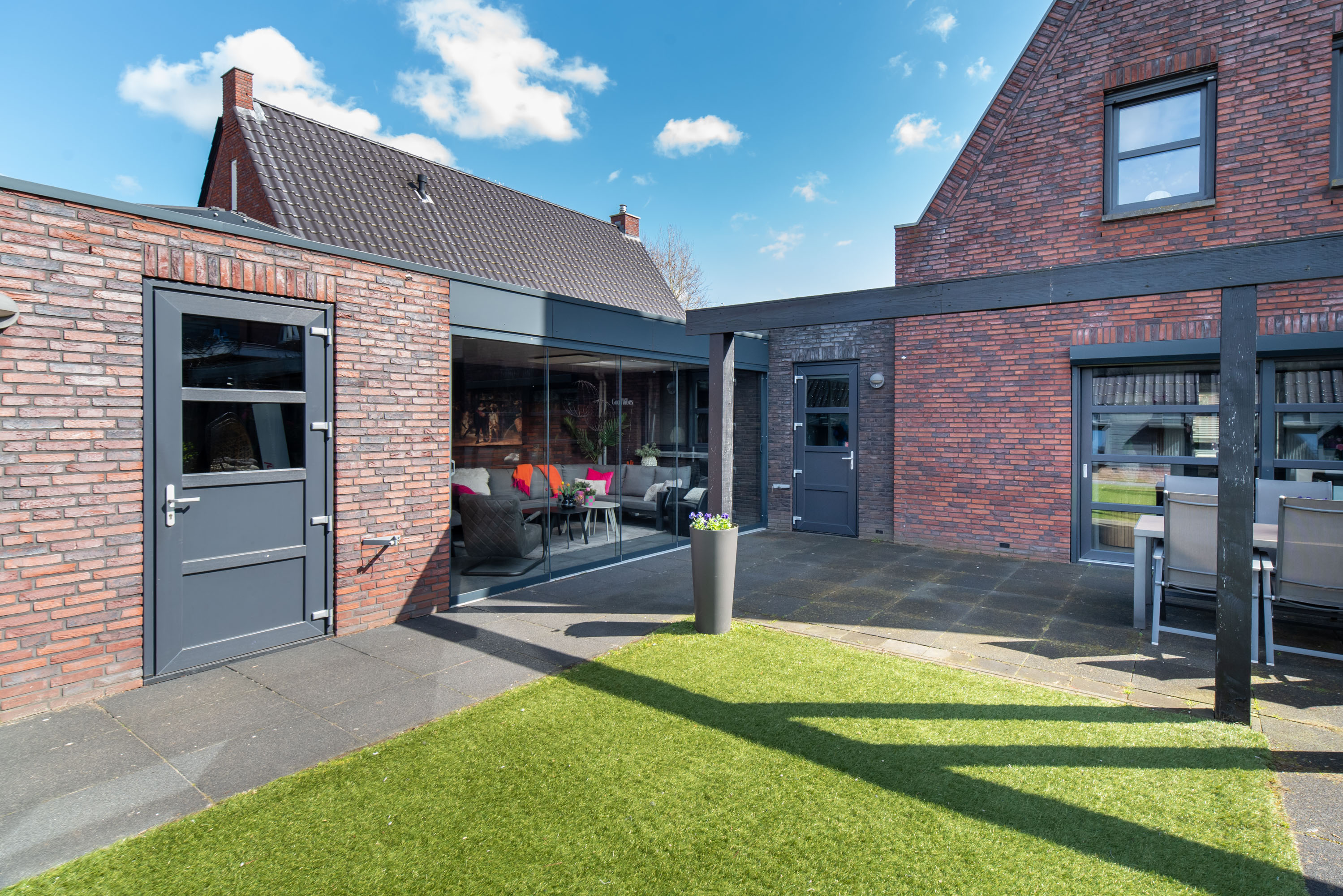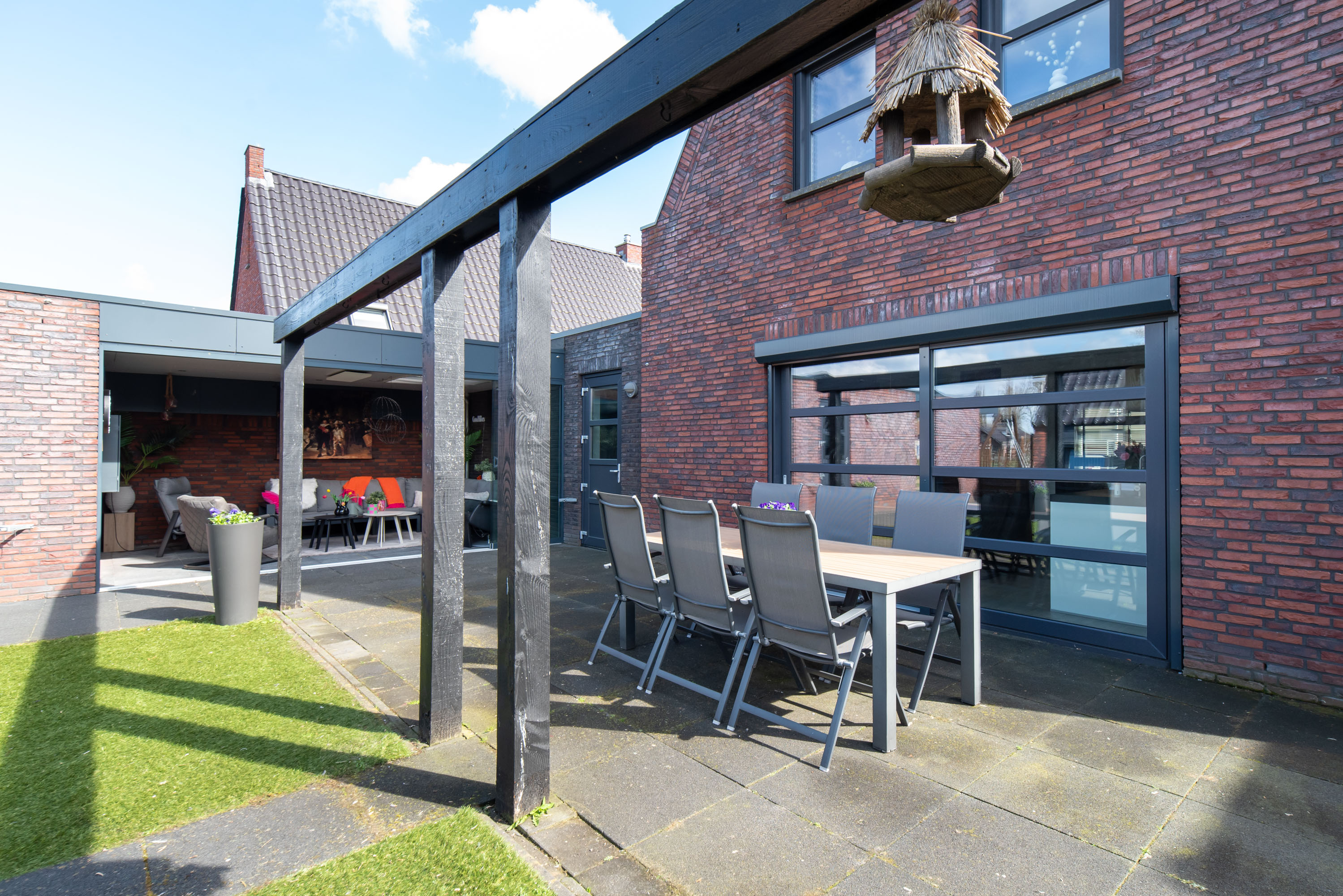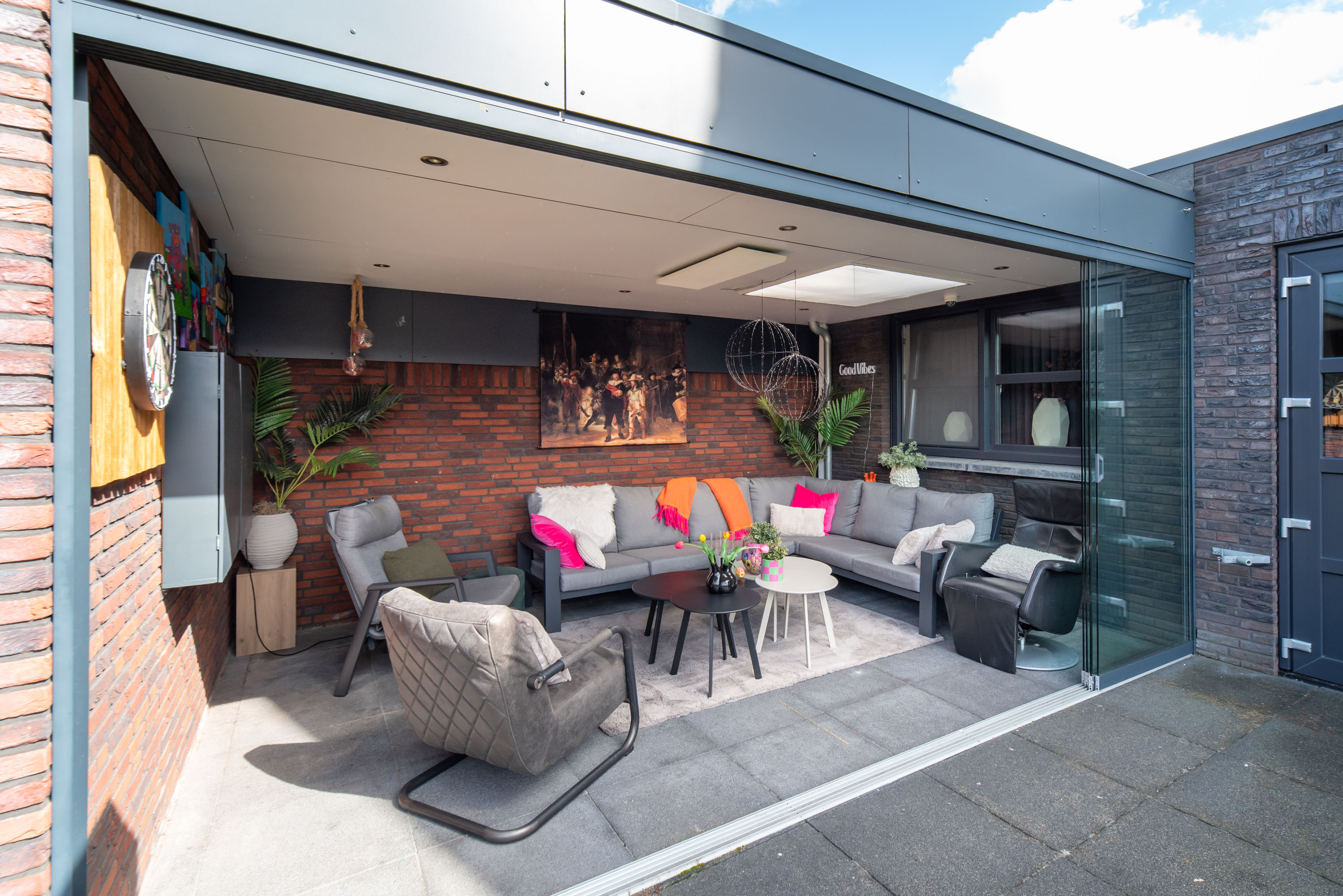 De achtertuin is gelegen op het westen: een heerlijke plek om te genieten van de zon in je eigen tuin! De tuin is onderhoudsarm aangelegd met een betegeld terras en kunstgras. Zie jij jezelf al zitten in die gave overkapping met een kopje koffie of een glaasje wijn? Zelfs in de winter is deze heerlijke ruimte dé plek om te zijn dankzij de glazen schuifpui.