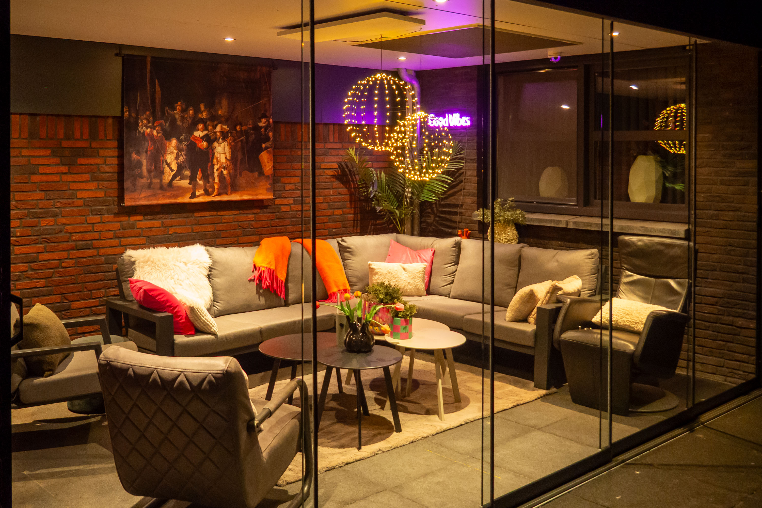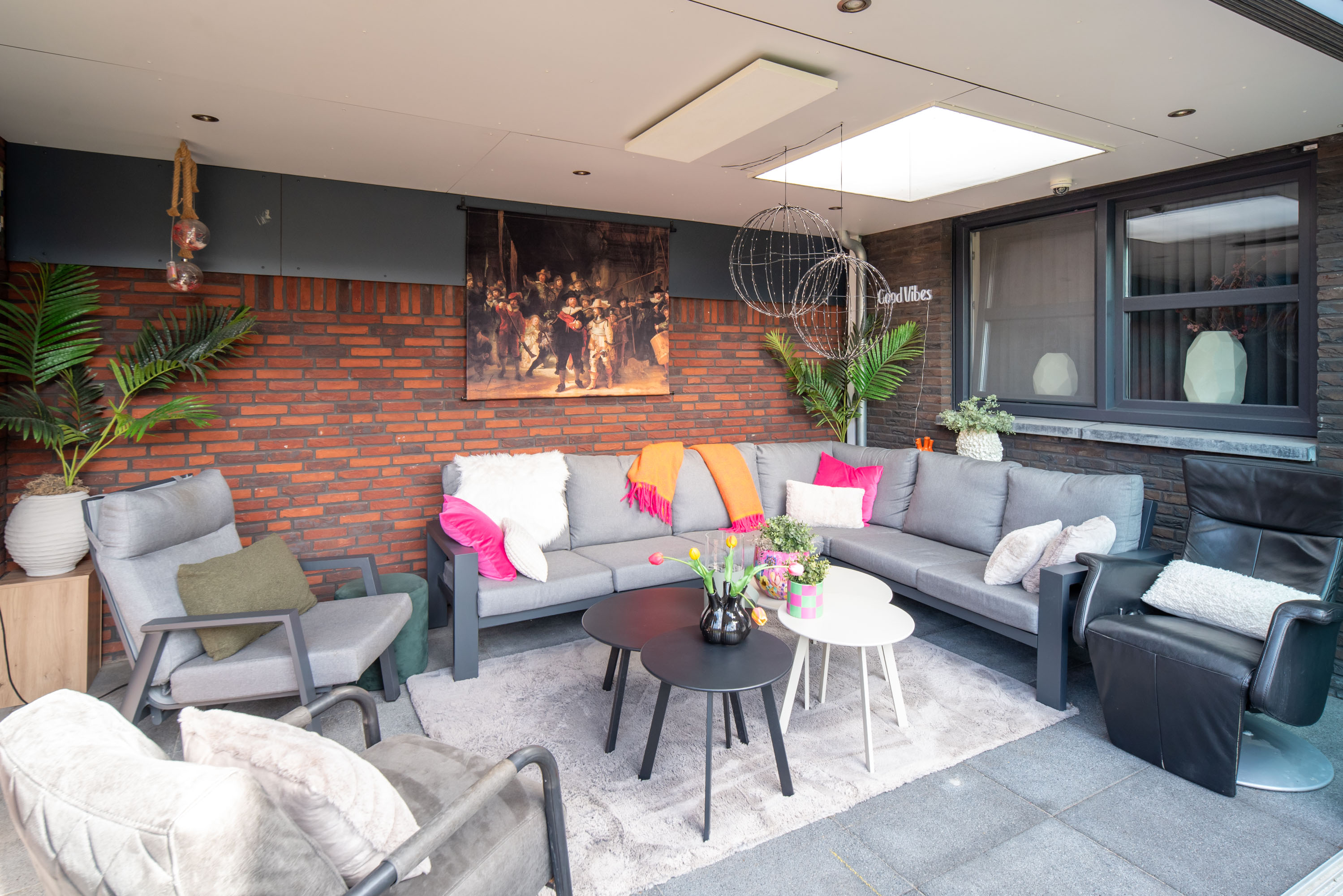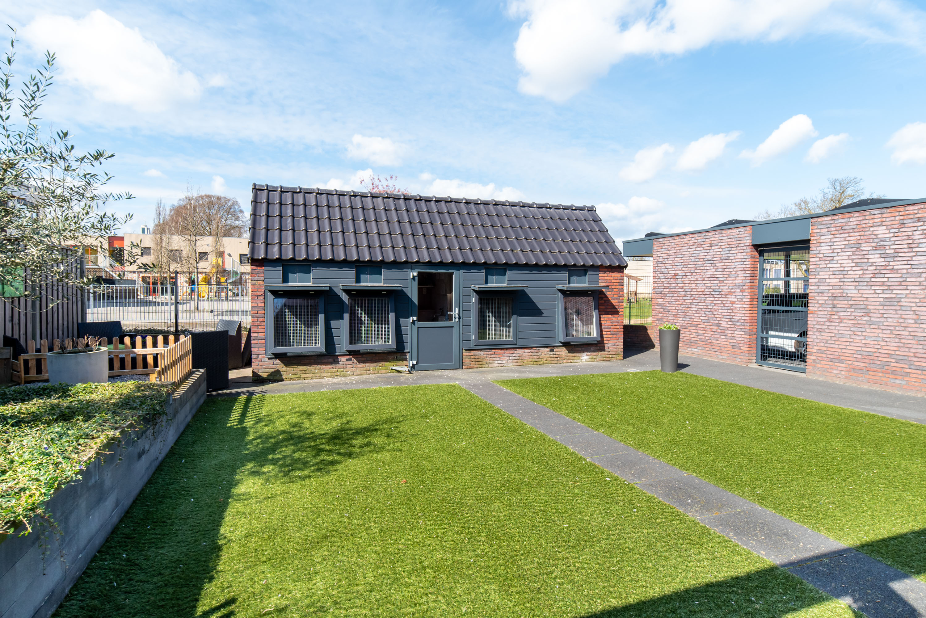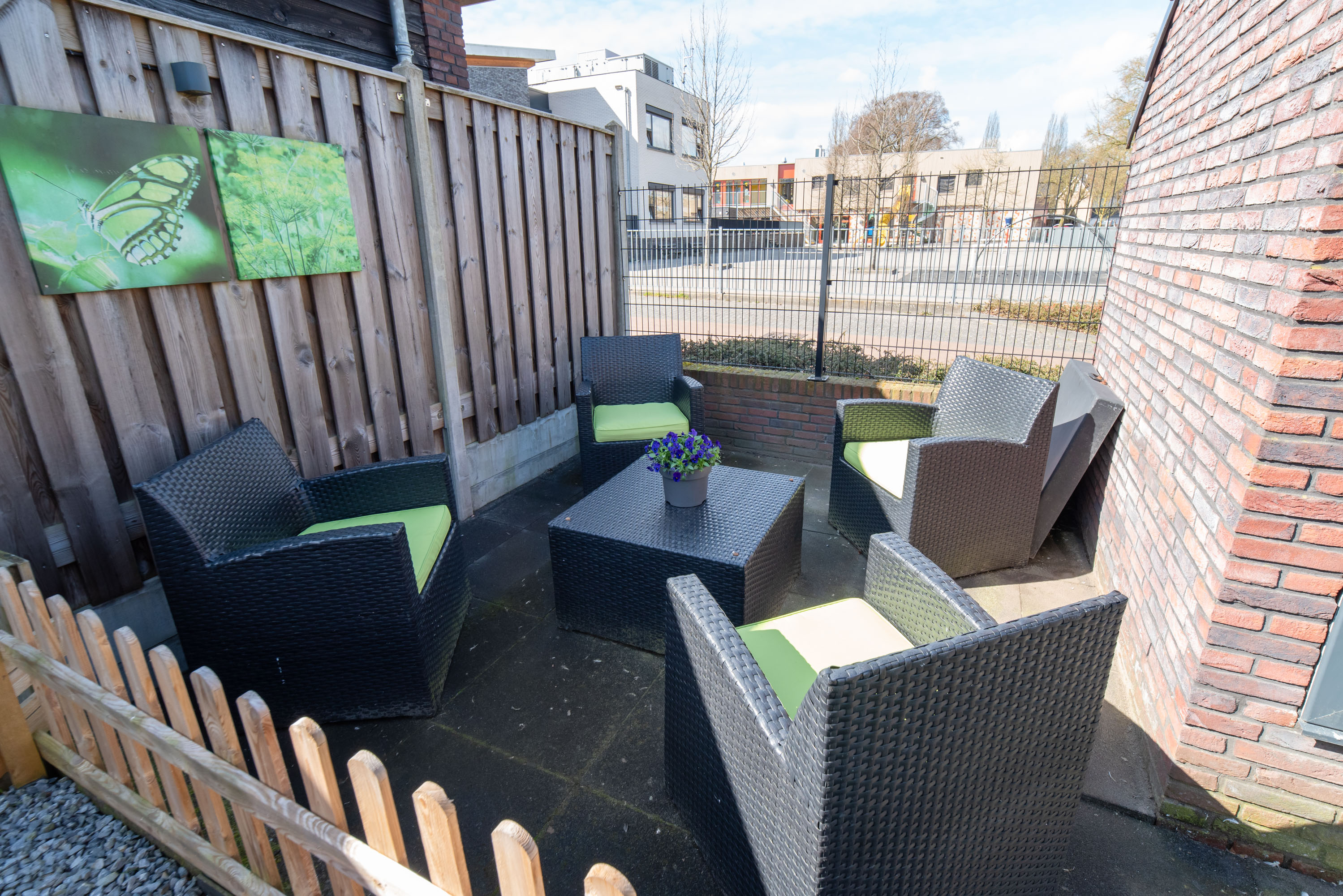De achtertuin is gelegen op het westen: een heerlijke plek om te genieten van de zon in je eigen tuin! De tuin is onderhoudsarm aangelegd met een betegeld terras en kunstgras. Zie jij jezelf al zitten in die gave overkapping met een kopje koffie of een glaasje wijn? Zelfs in de winter is deze heerlijke ruimte dé plek om te zijn dankzij de glazen schuifpui.