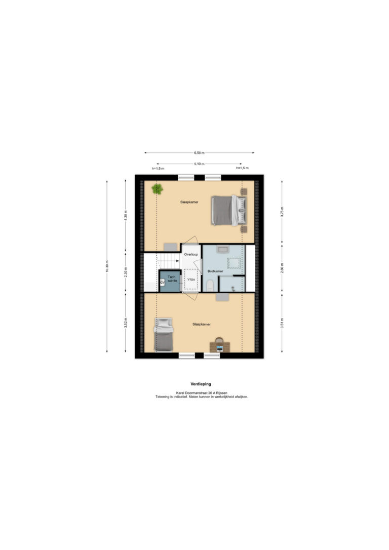 Op de eerste verdieping zijn twee royale slaapkamers te vinden. Via de overloop bereik je de technische ruimte, de vlizotrap en de badkamer. De badkamer is voorzien van een douche, wastafel en toilet.