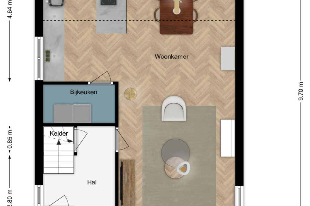 De auto kan je parkeren op de oprit. Via de hal krijg je toegang tot de kelder, de vaste trap naar de eerste verdieping en de woonkamer. De woonkamer biedt voldoende ruimte om nog een extra eethoek te plaatsen en heeft door de vele raampartijen veel natuurlijk lichtinval. De keuken is aan de achterzijde gesitueerd. Eventueel zijn er mogelijkheden om de woning aan de achterzijde uit te bouwen waardoor er een fraaie woonkeuken gerealiseerd kan worden. We hebben een aantal visualisaties gemaakt om de mogelijkheden in beeld te brengen.