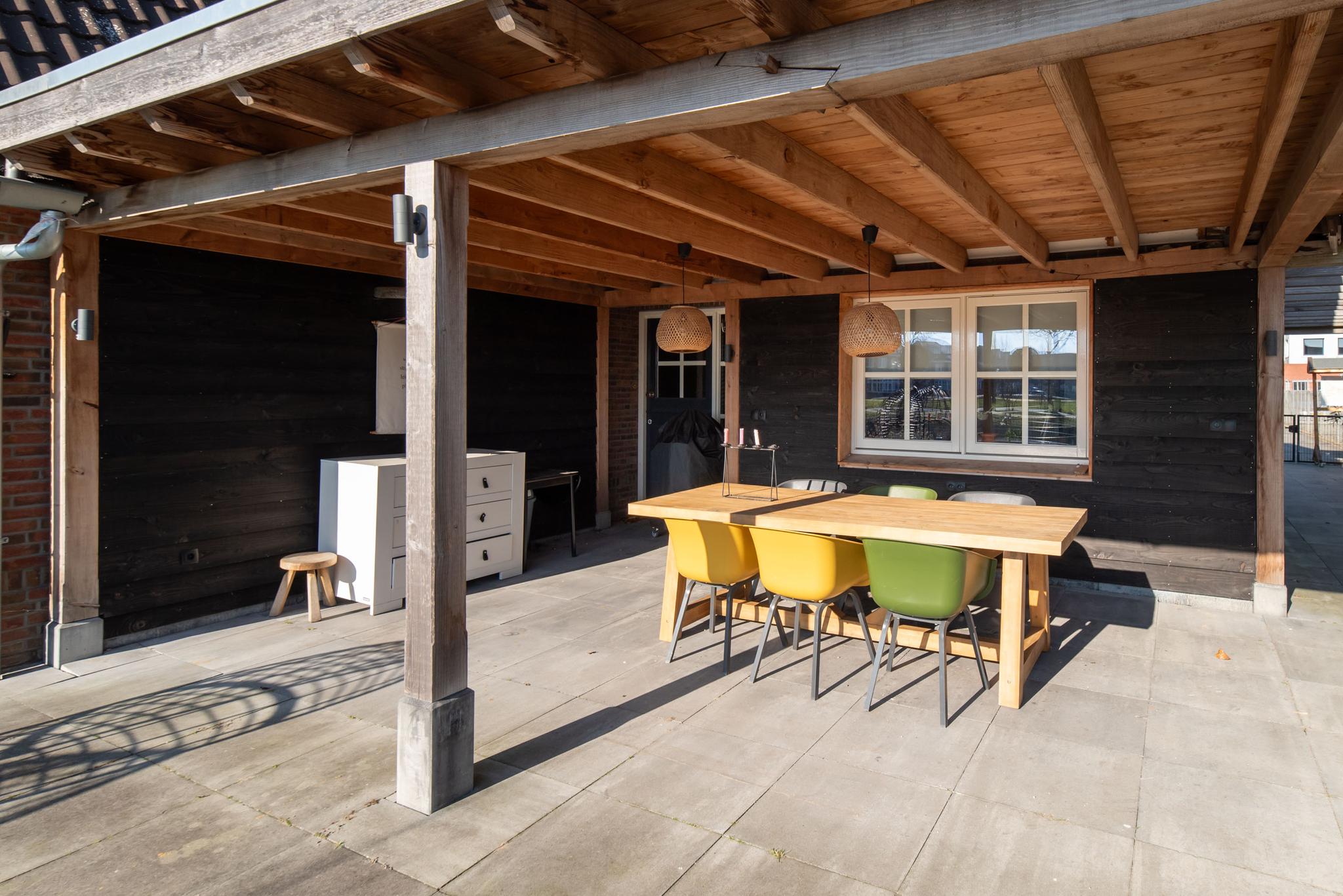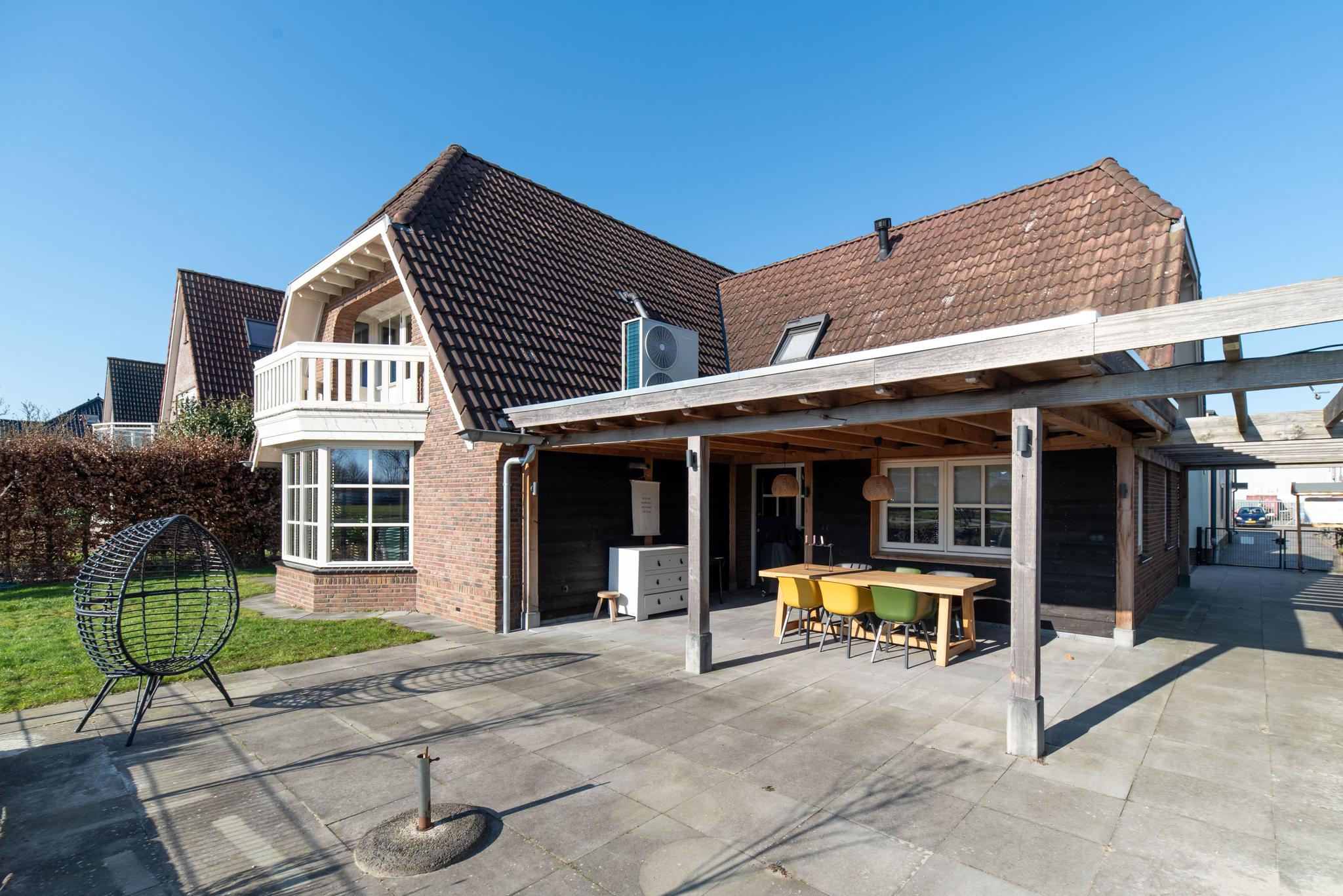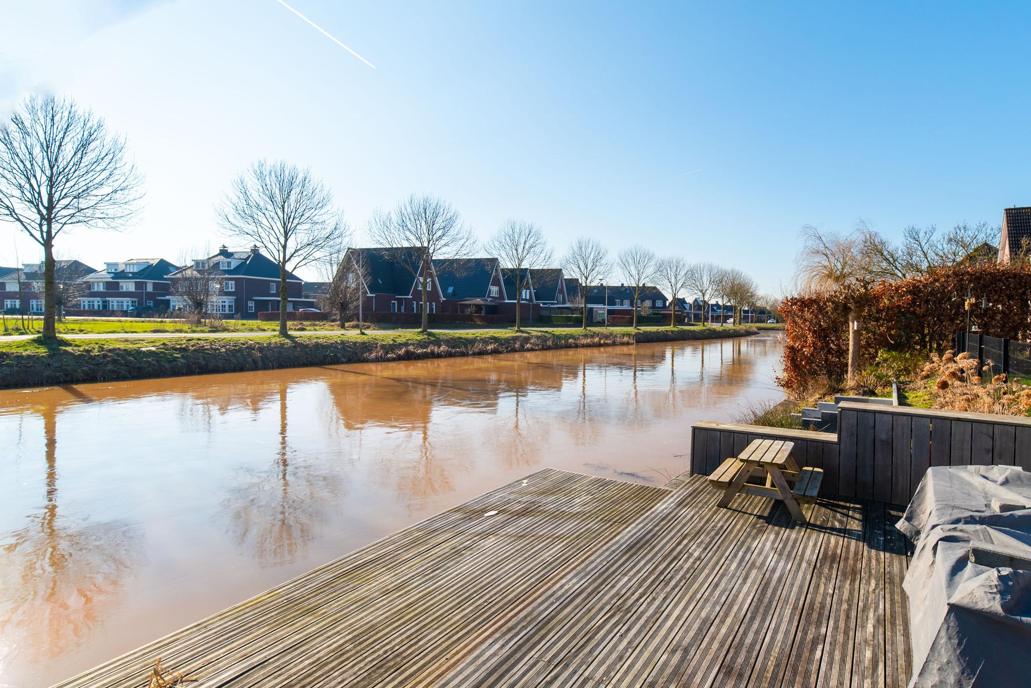 De royale tuin aan het water is voorzien van een grote overkapping met een betegeld terras, grasmat en aan de waterkant is een mooie tweede zitplek gemaakt met lekkere plekken om te vissen.