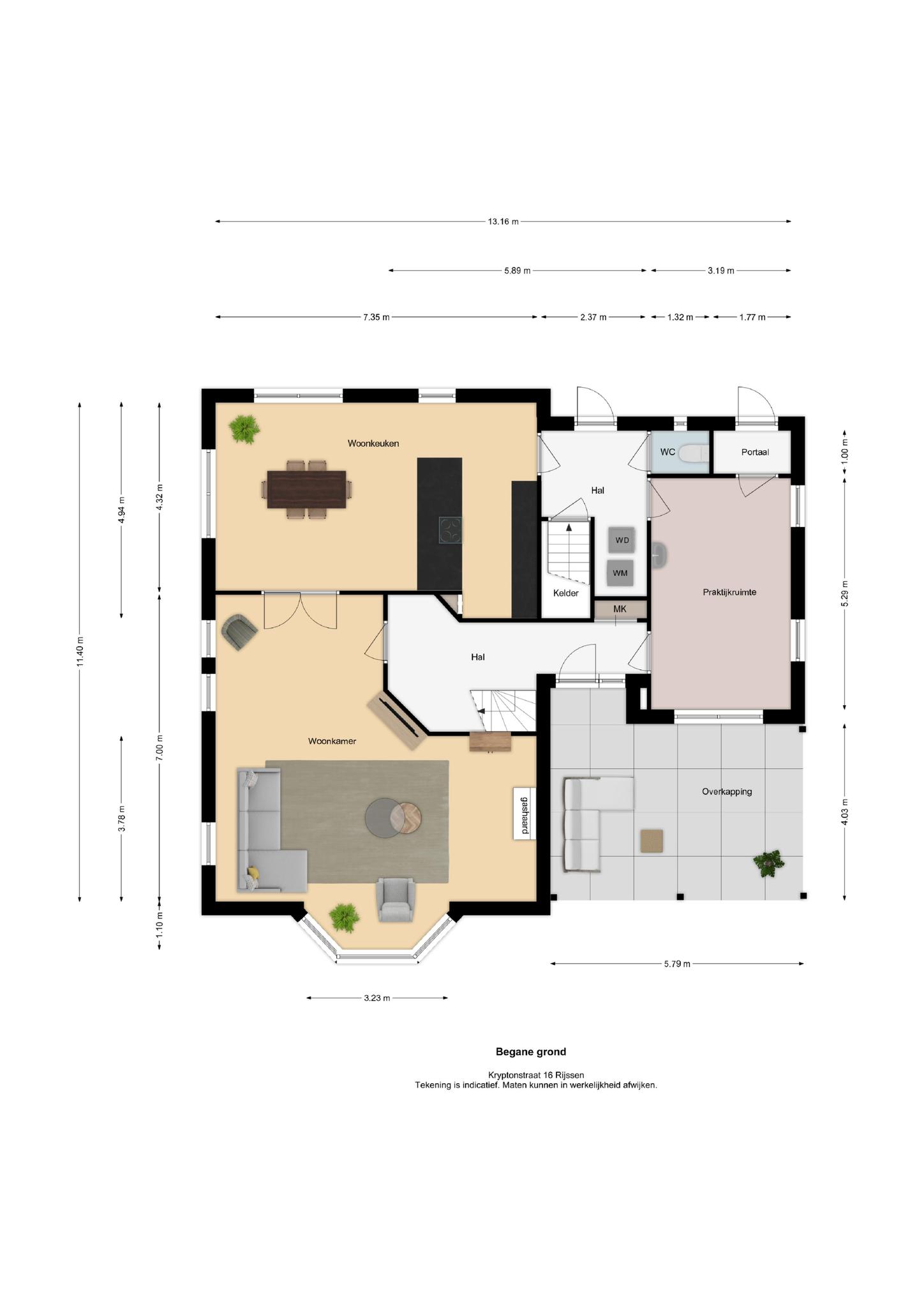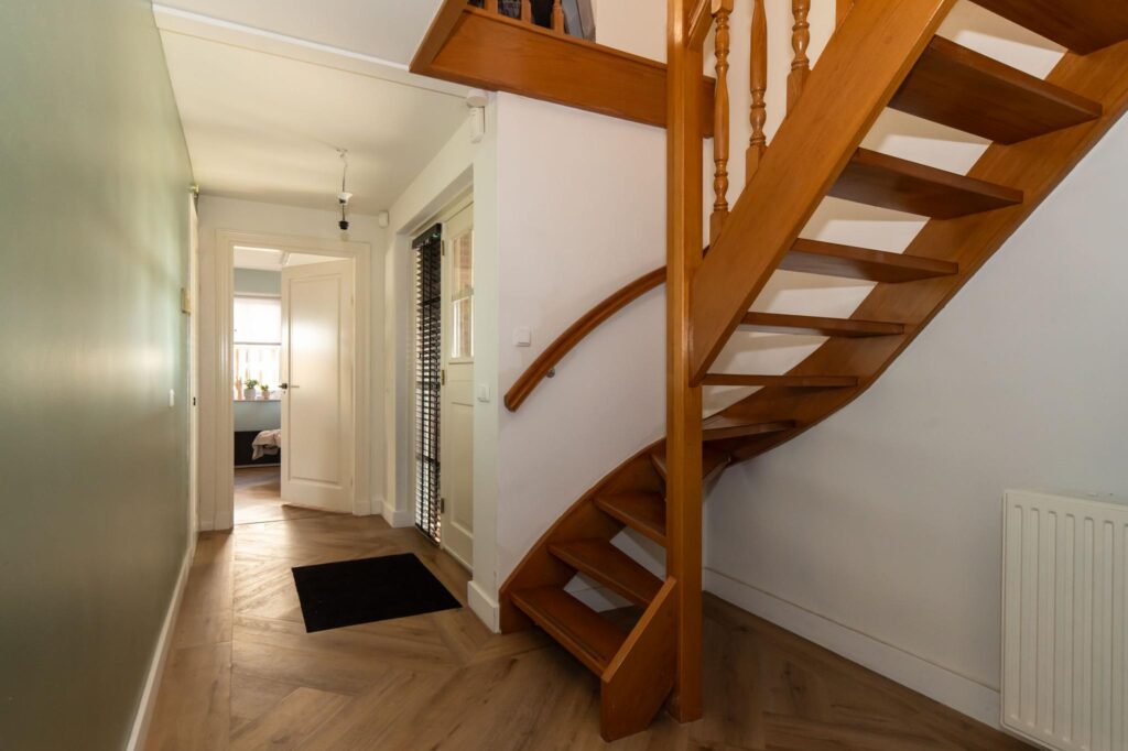 De woning vind je aan de waterzijde van het perceel. Via de voordeur kom je in de hal terecht, in de hal is de wasmachineaansluiting te vinden en is het toilet, de kelder, woonkeuken en praktijkruimte te bereiken. De praktijkruimte is mede via een aparte zij ingang te bereiken. De woonkeuken is in 2019 voorzien van een nieuwe inbouwkeuken met apparatuur zoals een vaatwasser, koelkast, combi-oven en kookeiland met inductiekookplaat met ingebouwde afzuiging. In de woonkeuken is voldoende ruimte voor een royale eettafel voor het gehele gezin. De woonkeuken is gescheiden van de woonkamer met openslaande deuren. De woonkamer is ruim opgesteld, voorzien van een gaskachel en meerdere raampartijen wat zorgt voor veel natuurlijk lichtinval. Via de woonkamer is de hal te bereiken, hier vind je de vaste trap naar de eerste verdieping, deur naar de praktijkruimte en naar de tuin.