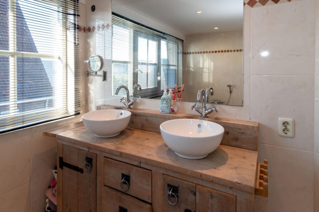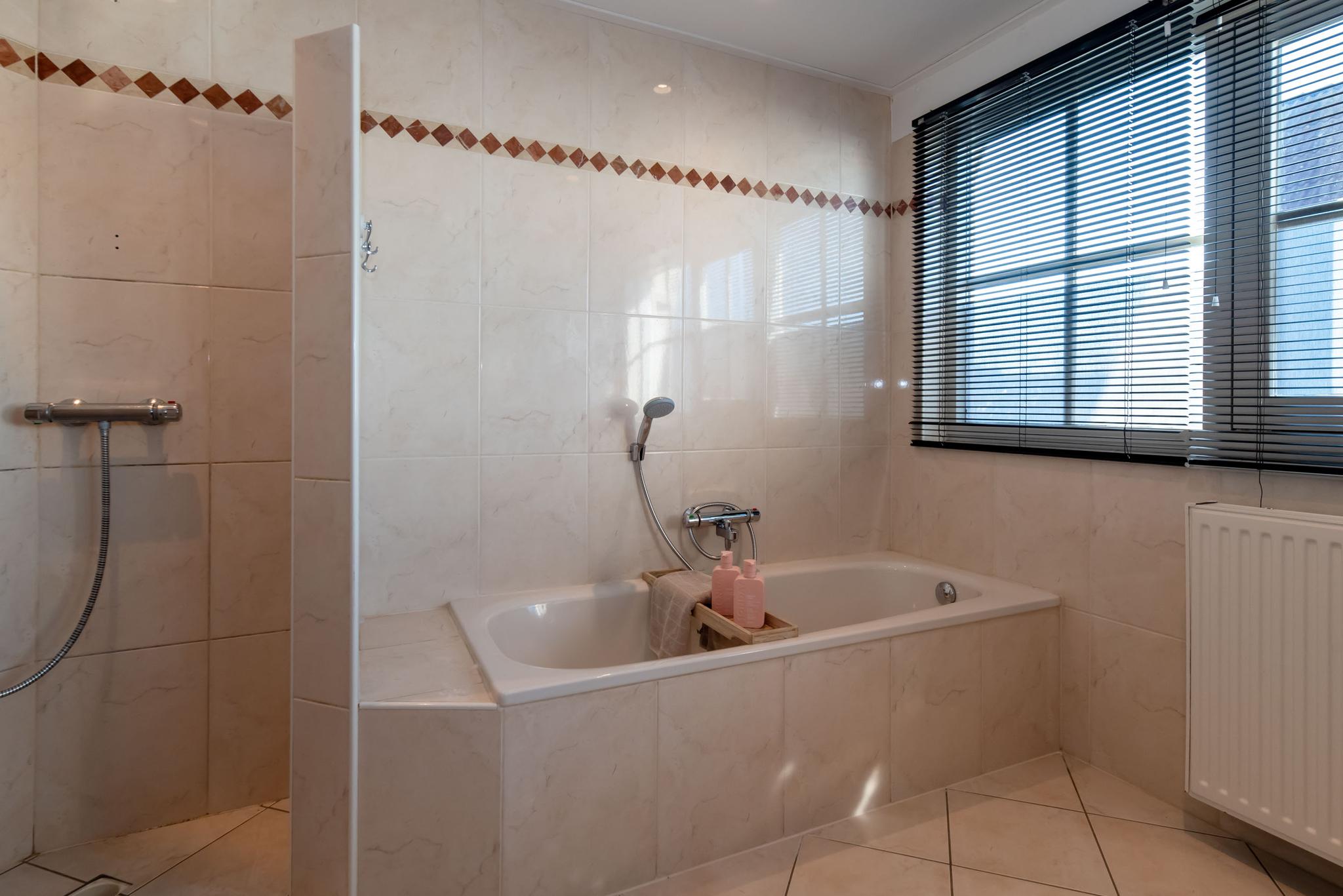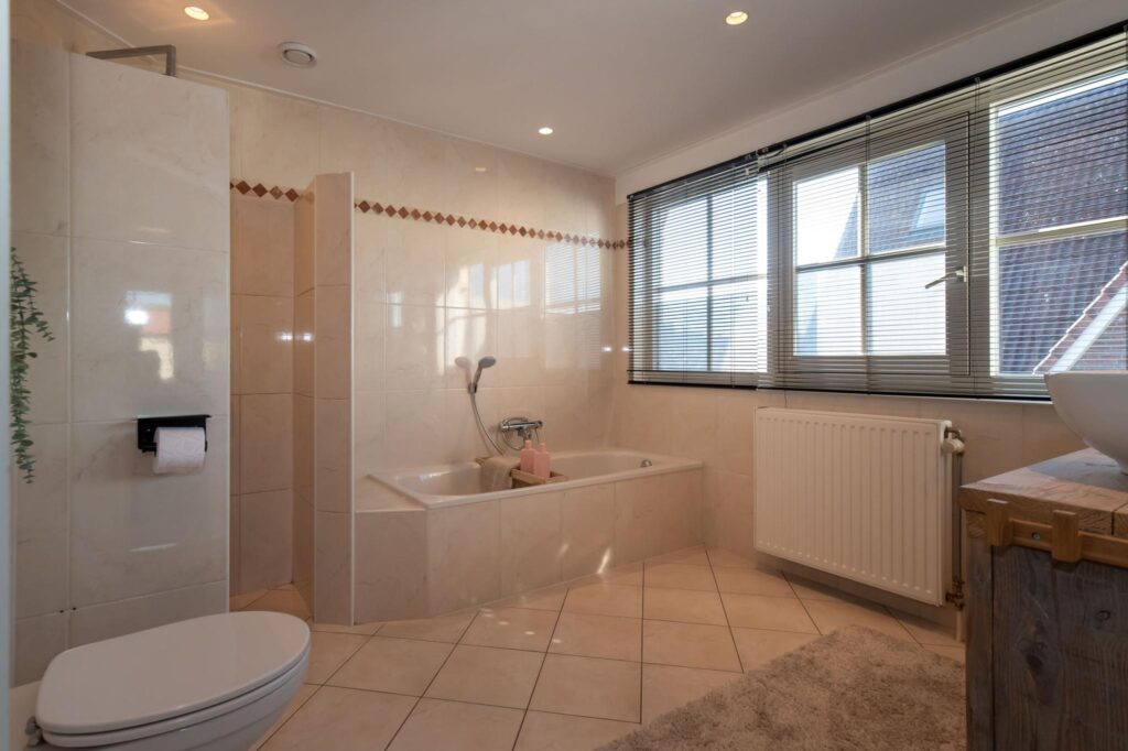Op de eerste verdieping zijn vijf slaapkamers waarvan vier met een vaste kastenwand en één met een balkon. Via de overloop is de badkamer te bereiken. Deze is voorzien van een dubbele wastafel, toilet, inloopdouche en een ligbad.