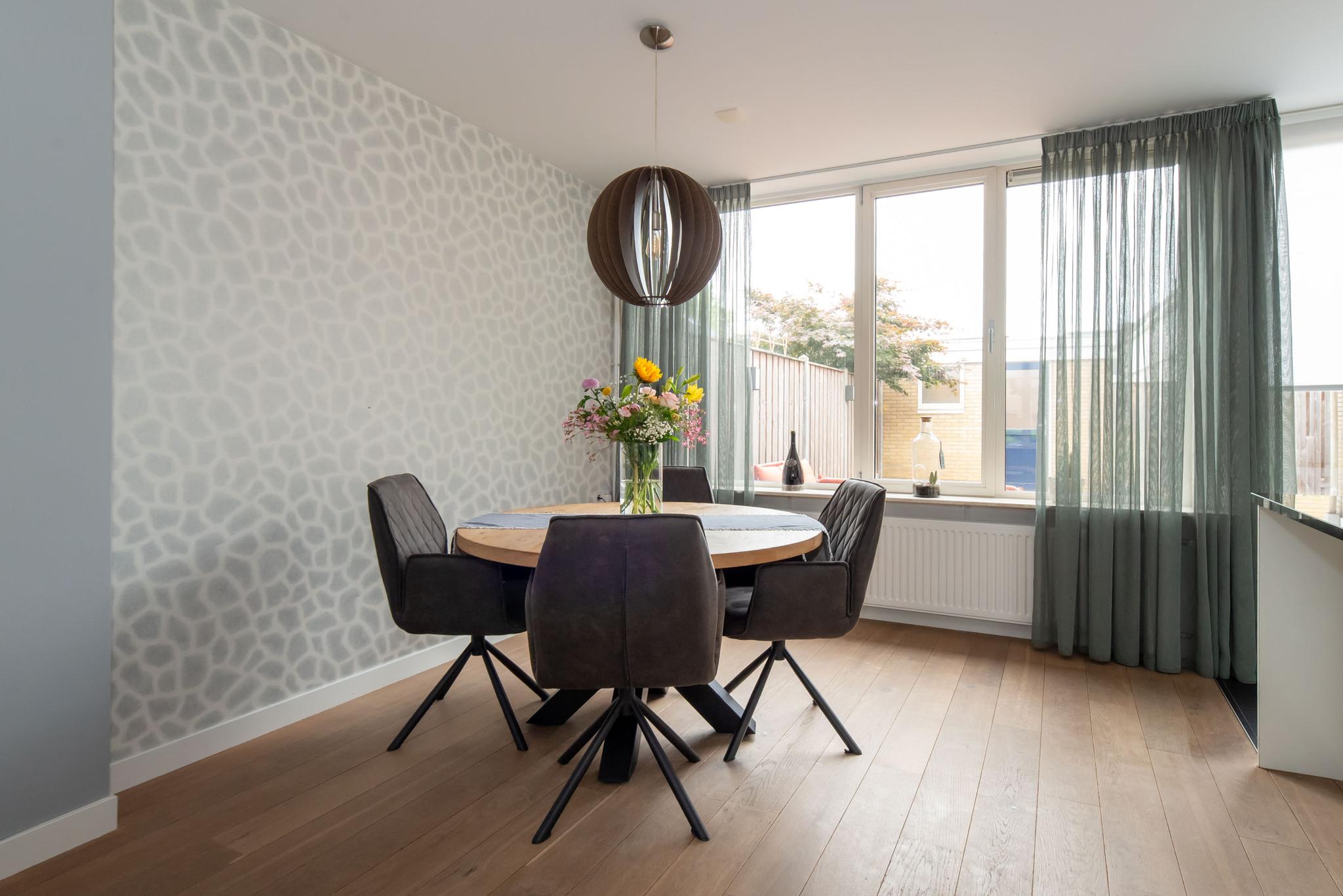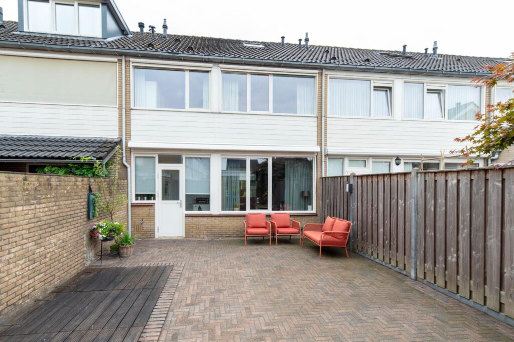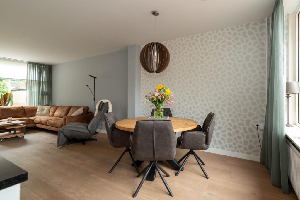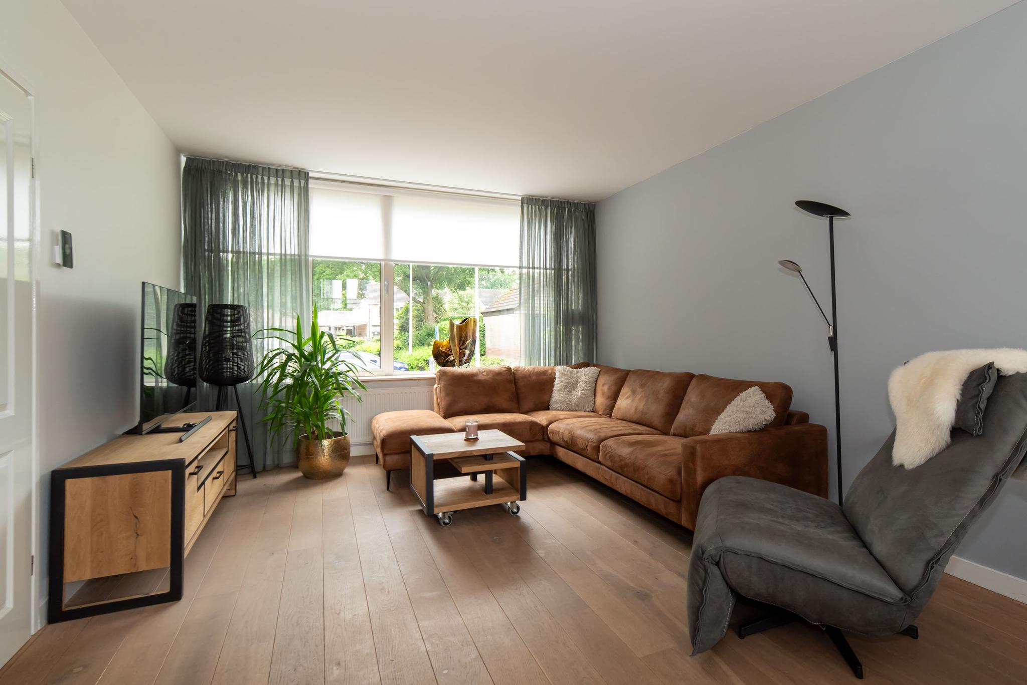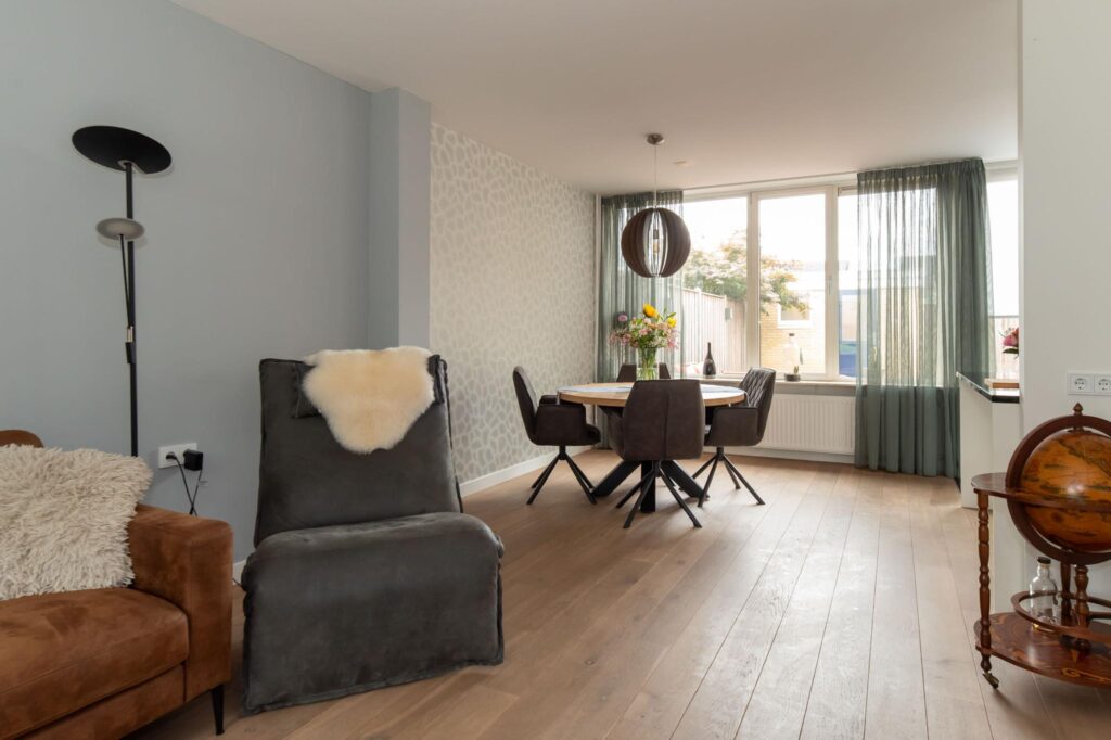 De woonkamer is heerlijk licht dankzij de grote raampartijen en heeft een ruime, open indeling. De gladgestucte wanden en sfeervolle keuken met kookeiland zorgen ervoor dat je hier zó kunt intrekken. Vanuit de keuken stap je zo de ruime, onderhoudsvrije tuin in. Een perfecte plek om op zonnige dagen te genieten met familie of vrienden.