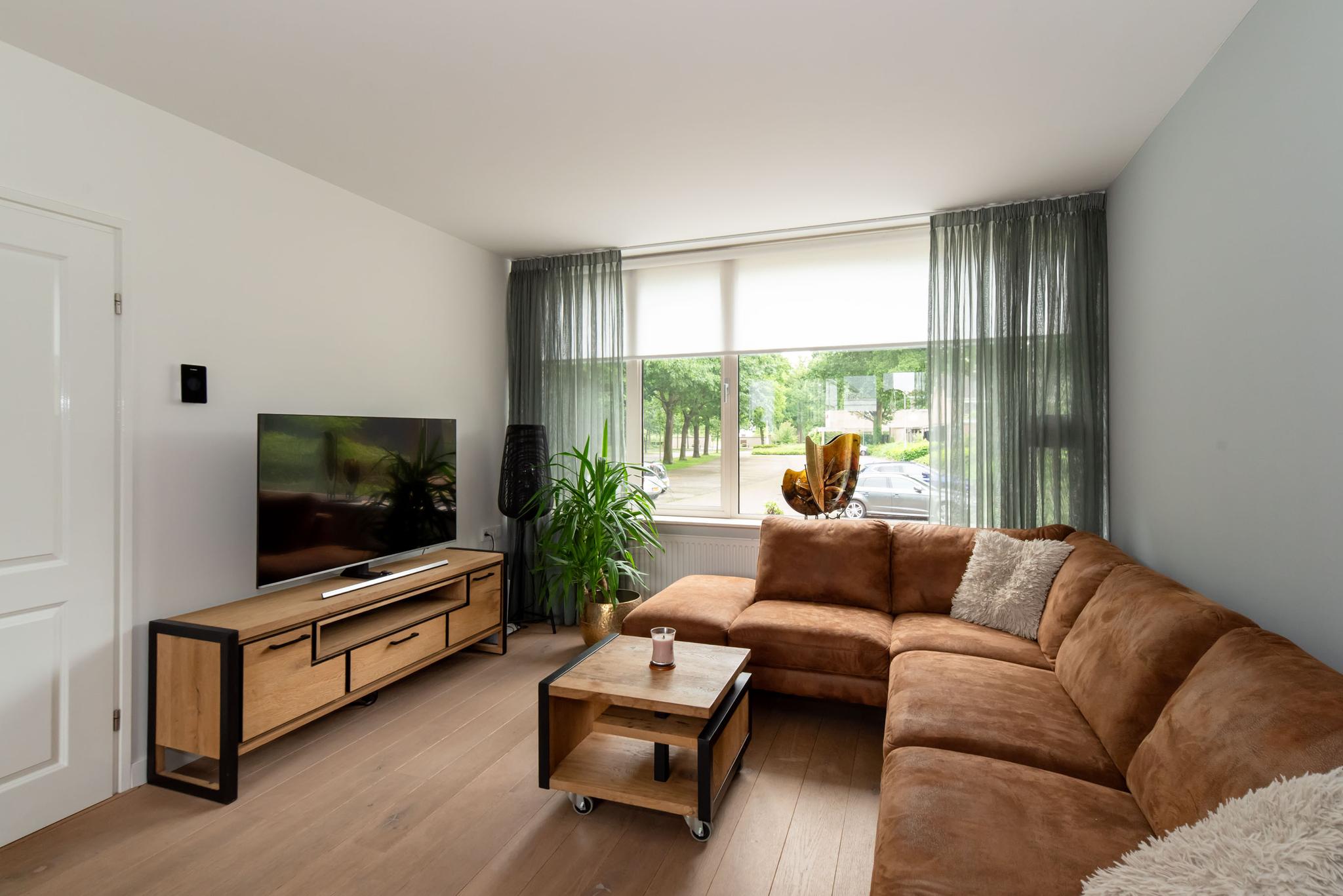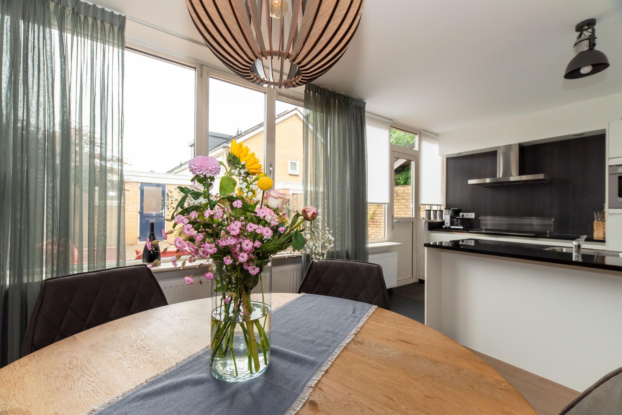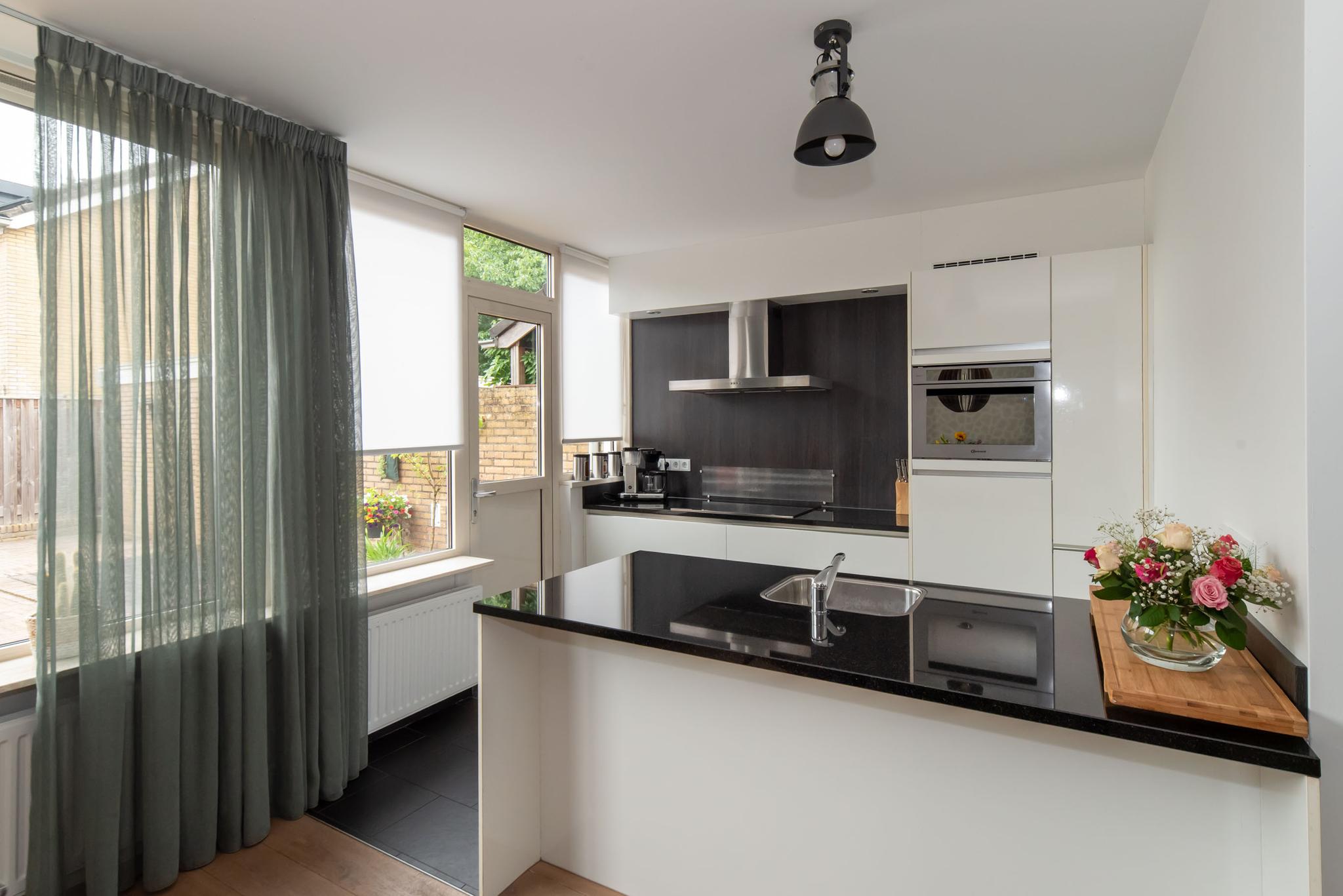 De woonkamer is heerlijk licht dankzij de grote raampartijen en heeft een ruime, open indeling. De gladgestucte wanden en sfeervolle keuken met kookeiland zorgen ervoor dat je hier zó kunt intrekken. Vanuit de keuken stap je zo de ruime, onderhoudsvrije tuin in. Een perfecte plek om op zonnige dagen te genieten met familie of vrienden.